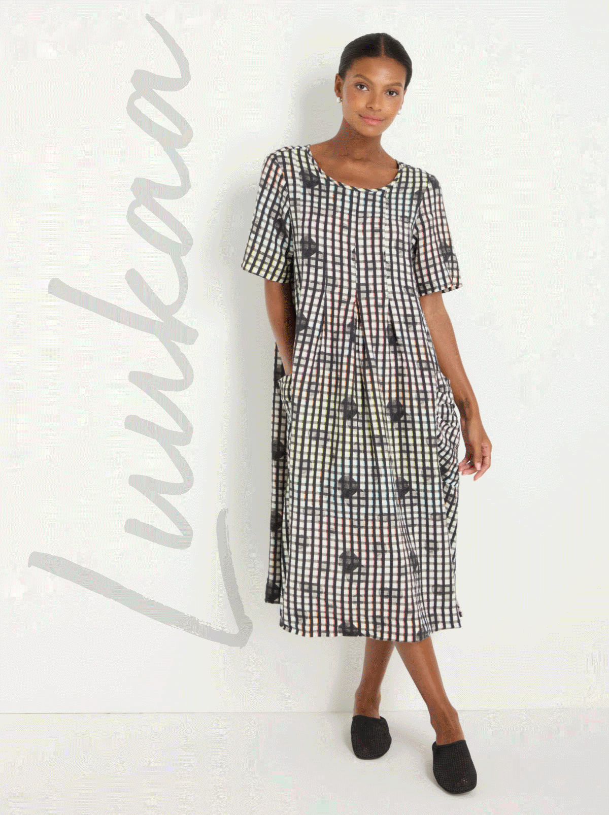 Back for another season, Luukaa brings character, contrast and uncompromising colour. Checks interrupted with dots, texture softened with pleats, swing silhouettes that sway, and practicality woven in through discreet pockets. It's detail that rewards a closer look.