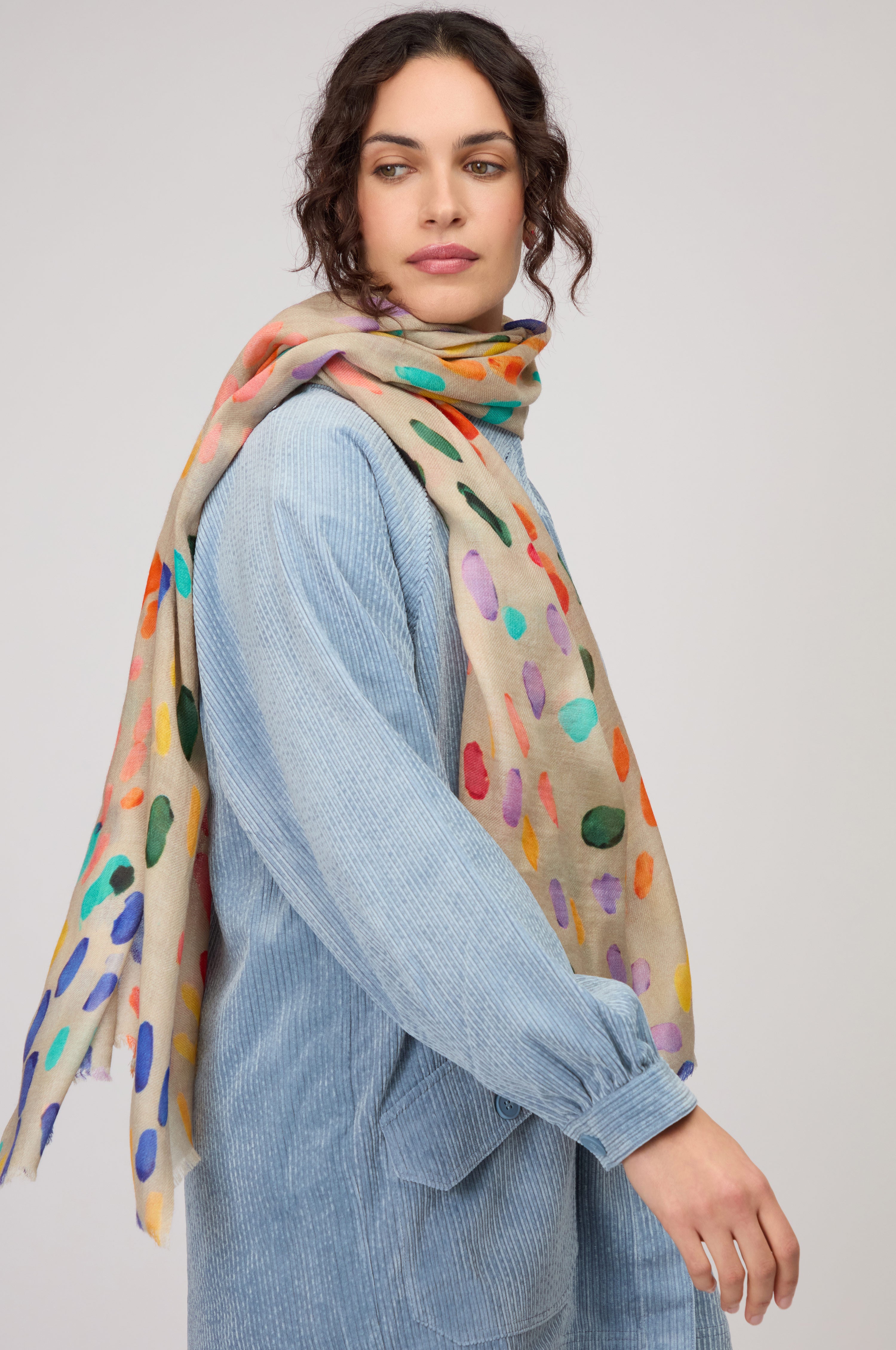 A playful take on print, this lightweight scarf is made from a luxurious blend of wool and silk for a soft, featherlight feel. Set against a warm neutral base, painterly spots in a rainbow of vibrant tones create a joyful, contemporary pattern. The fabric drapes beautifully and is finished with fine fringing for an easy, relaxed edge. It's a colourful companion to simple dressing or tonal layering.