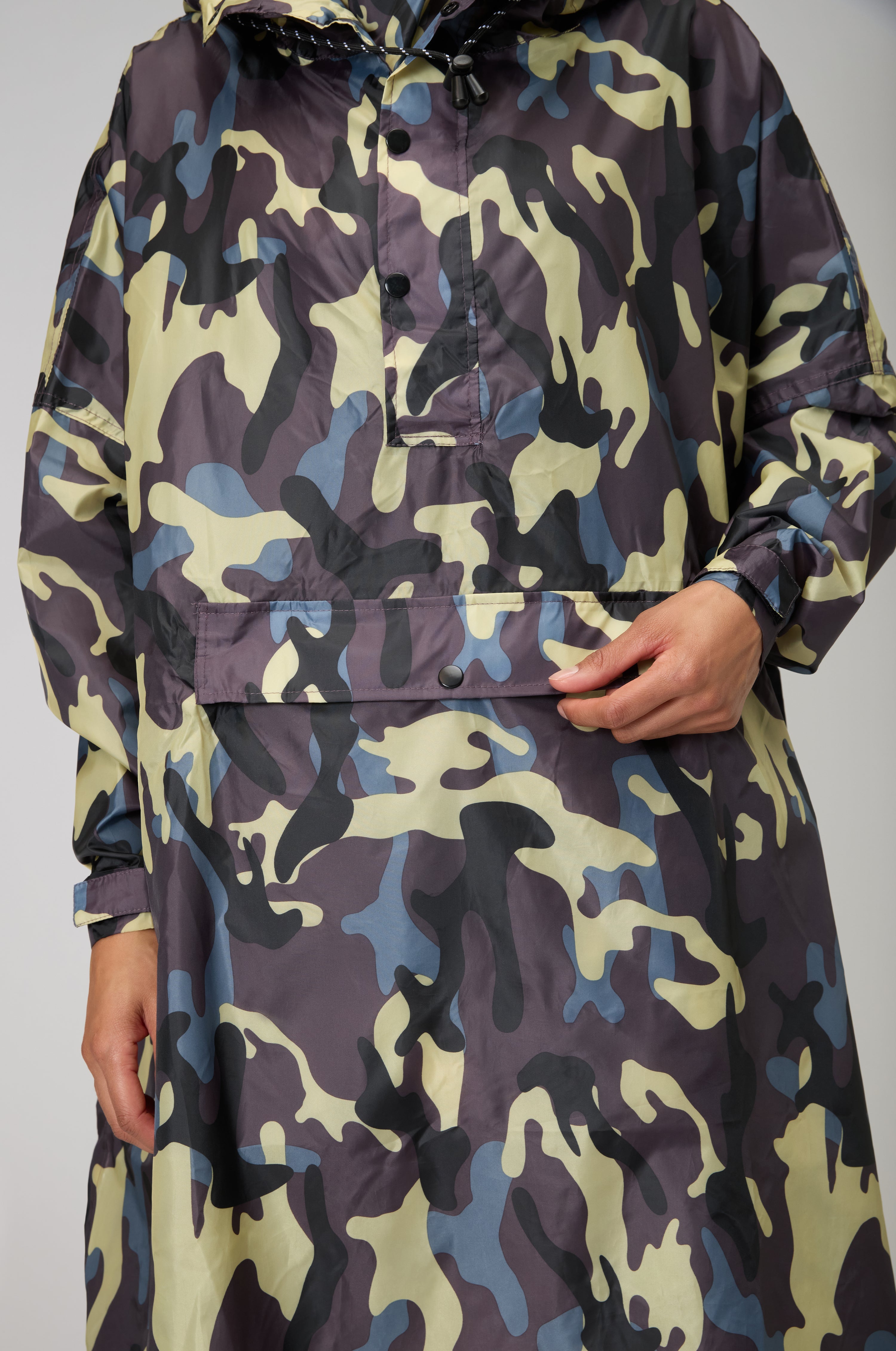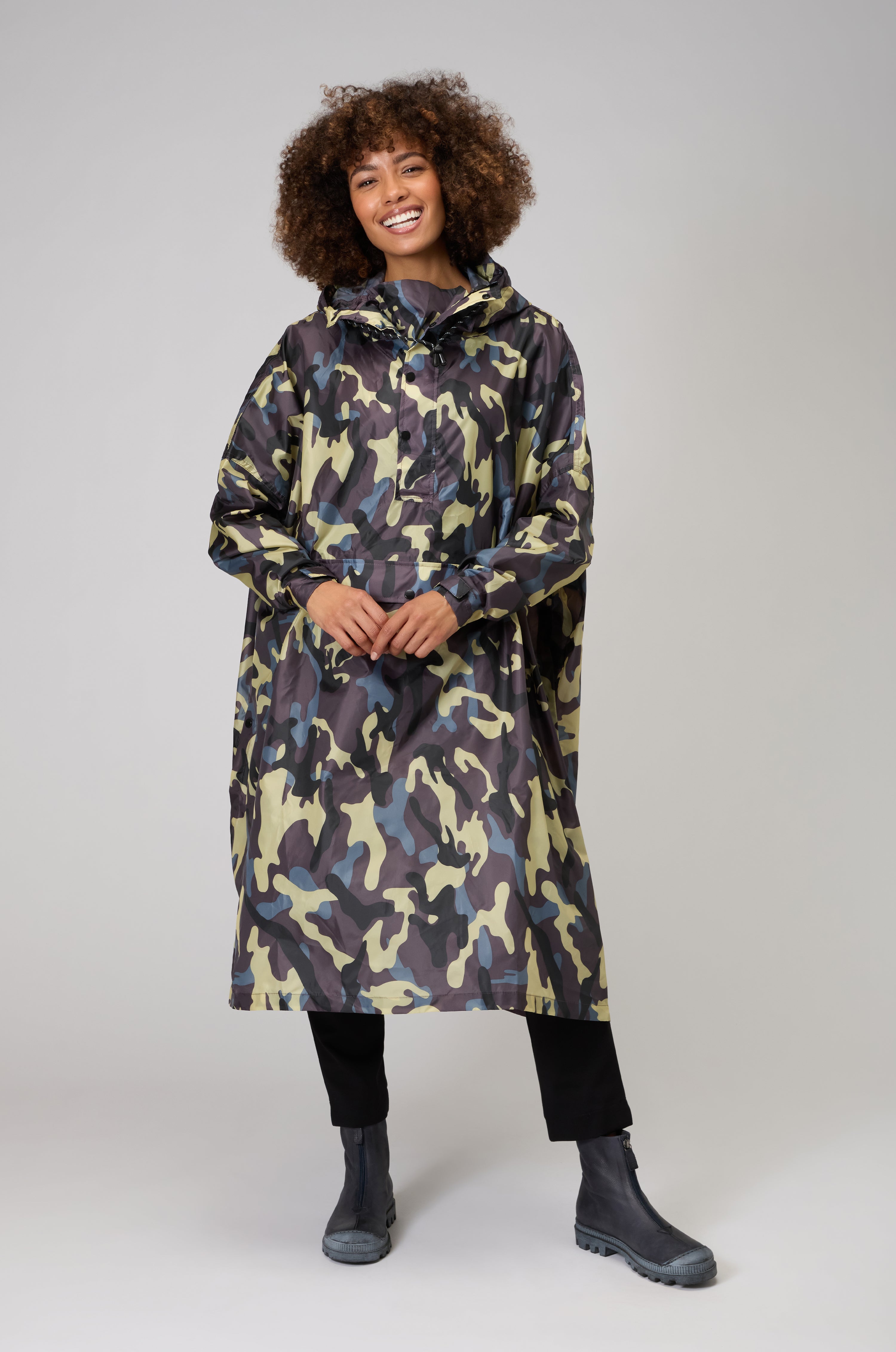 The Rainkiss Camo Poncho reimagines a classic camouflage pattern through a modern, tonal lens. Crafted from durable, waterproof recycled polyester, it offers protection from wind and rain while remaining lightweight and breathable. The adjustable hood and generous cut provide comfort and ease, with snap closures and seams designed for effortless wear.