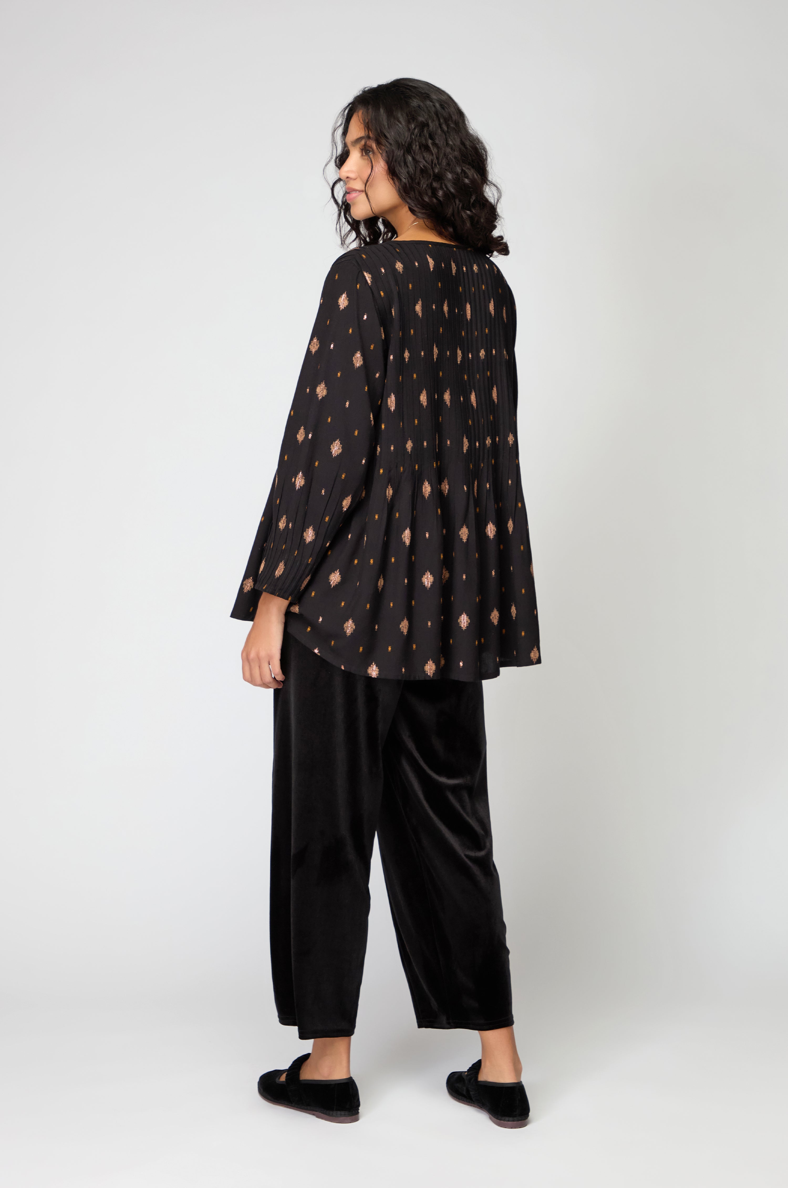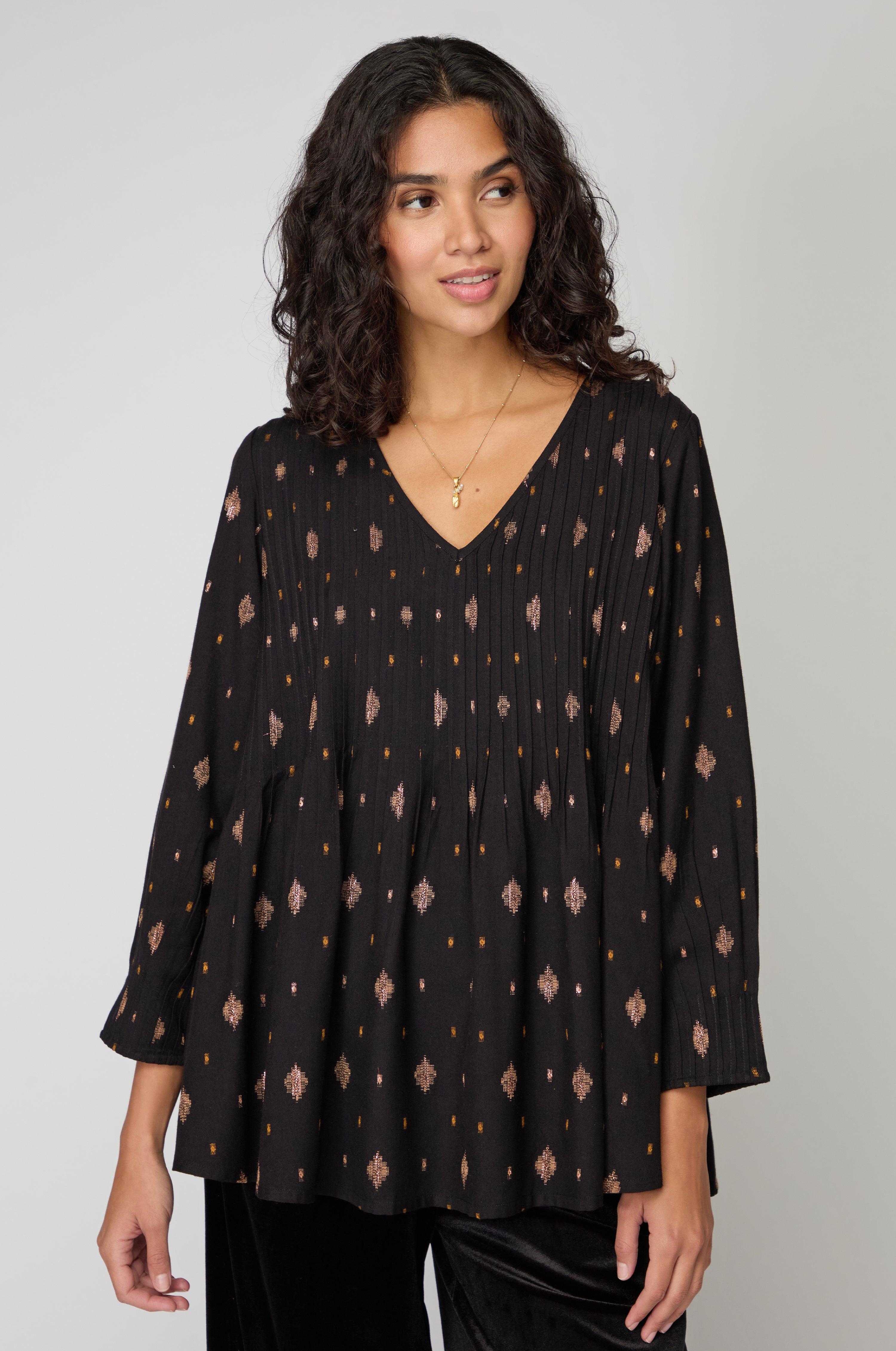 The Sahara Diamond Lurex Pleated Tunic reworks luxuriously soft woven and pleated fabric into a versatile silhouette. The diamond motif, shot through with lurex, adds shimmer and depth, while the longer length and relaxed cut make it ideal for layering. Its soft V-neck and generous bracelet-length sleeves feel easy and classic.