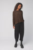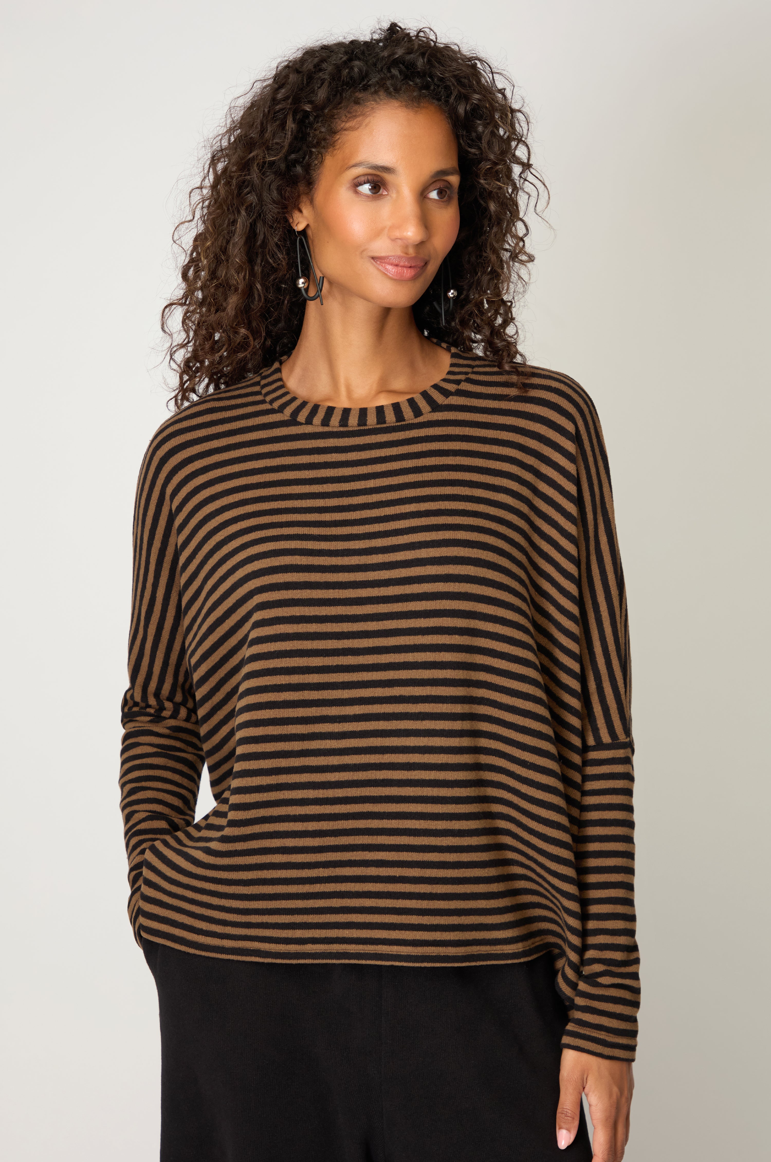 The Neirami Easy Top is crafted from soft jersey knit with fine stripes running vertically to elongate the body. The relaxed fit provides freedom of movement, while the neckline and long sleeves are kept simple for versatility. Available in brown black or olive black, each colourway grounds the pattern in an earthy palette.