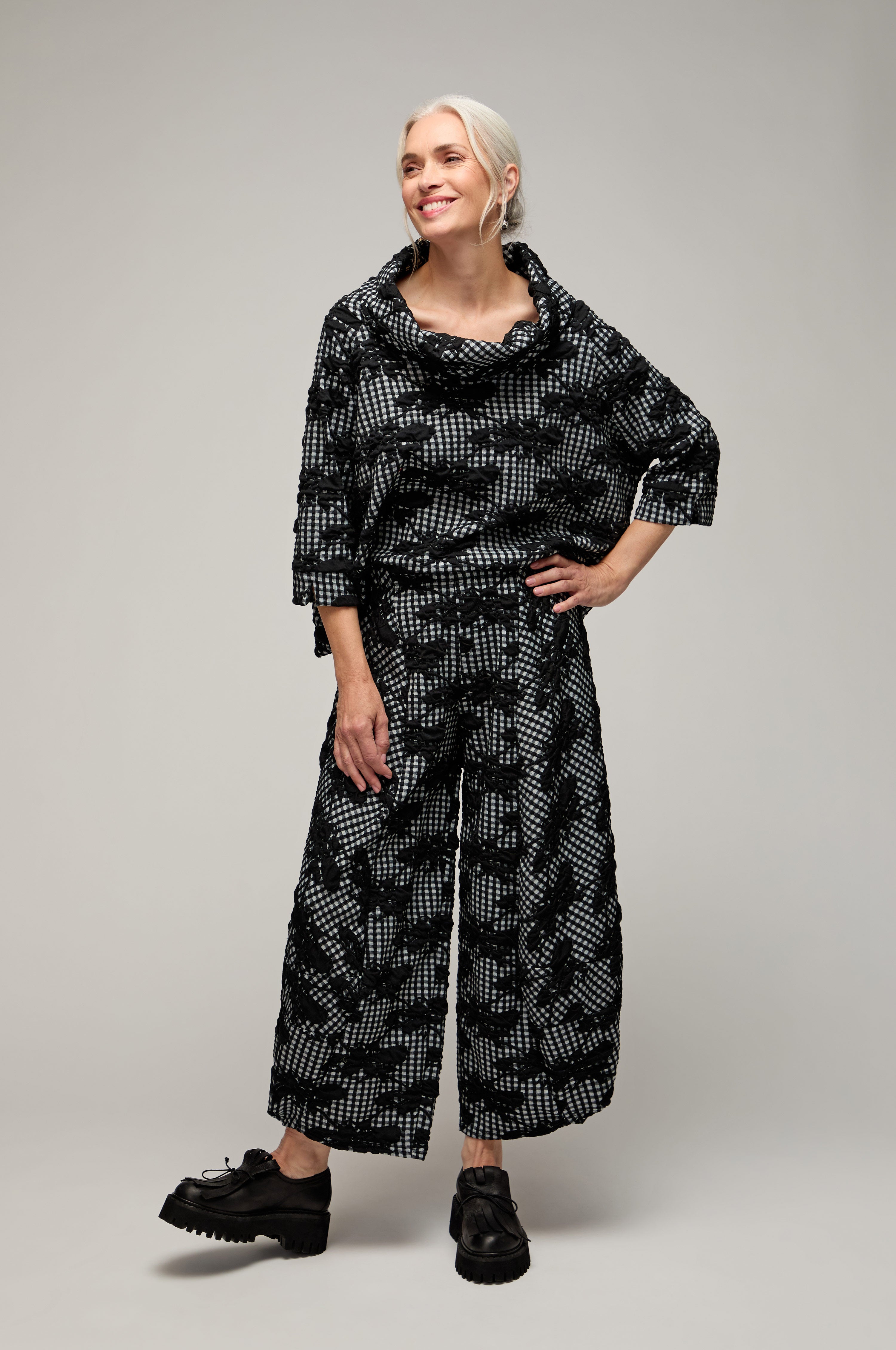 As with all Thanny silhouettes, the intent is movement and individuality. Italian design know-how meets everyday wearability in a trouser that anchors sets with the matching top or brings pattern to simple knitwear.