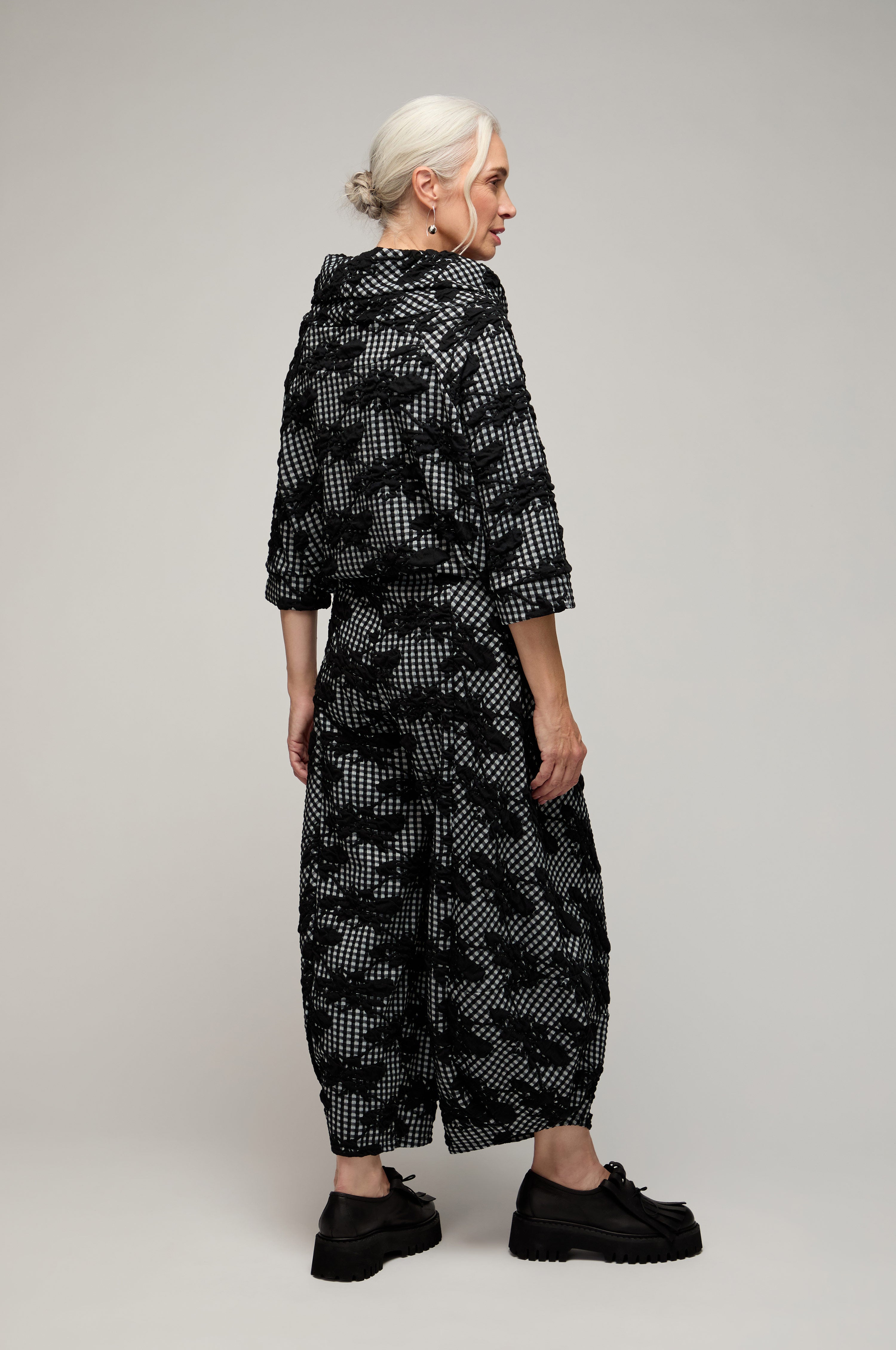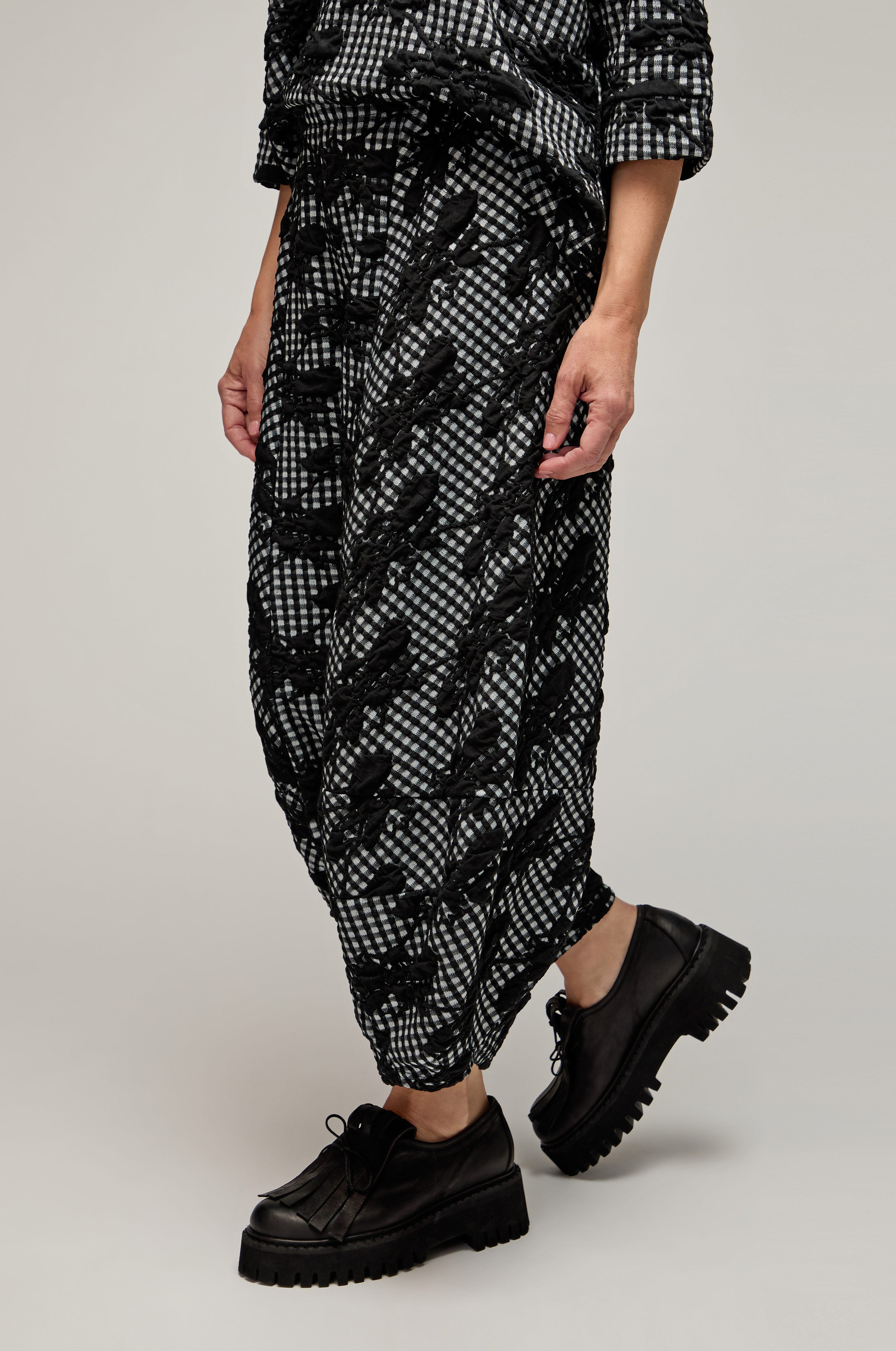 Thanny’s bubble cut is reworked in textured jersey, combining a curved leg with a neat tapered bubble hem for effortless balance. An elasticated waistband ensures comfort while the gingham-plus-floral print introduces playful contrast and rhythm.
