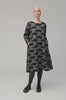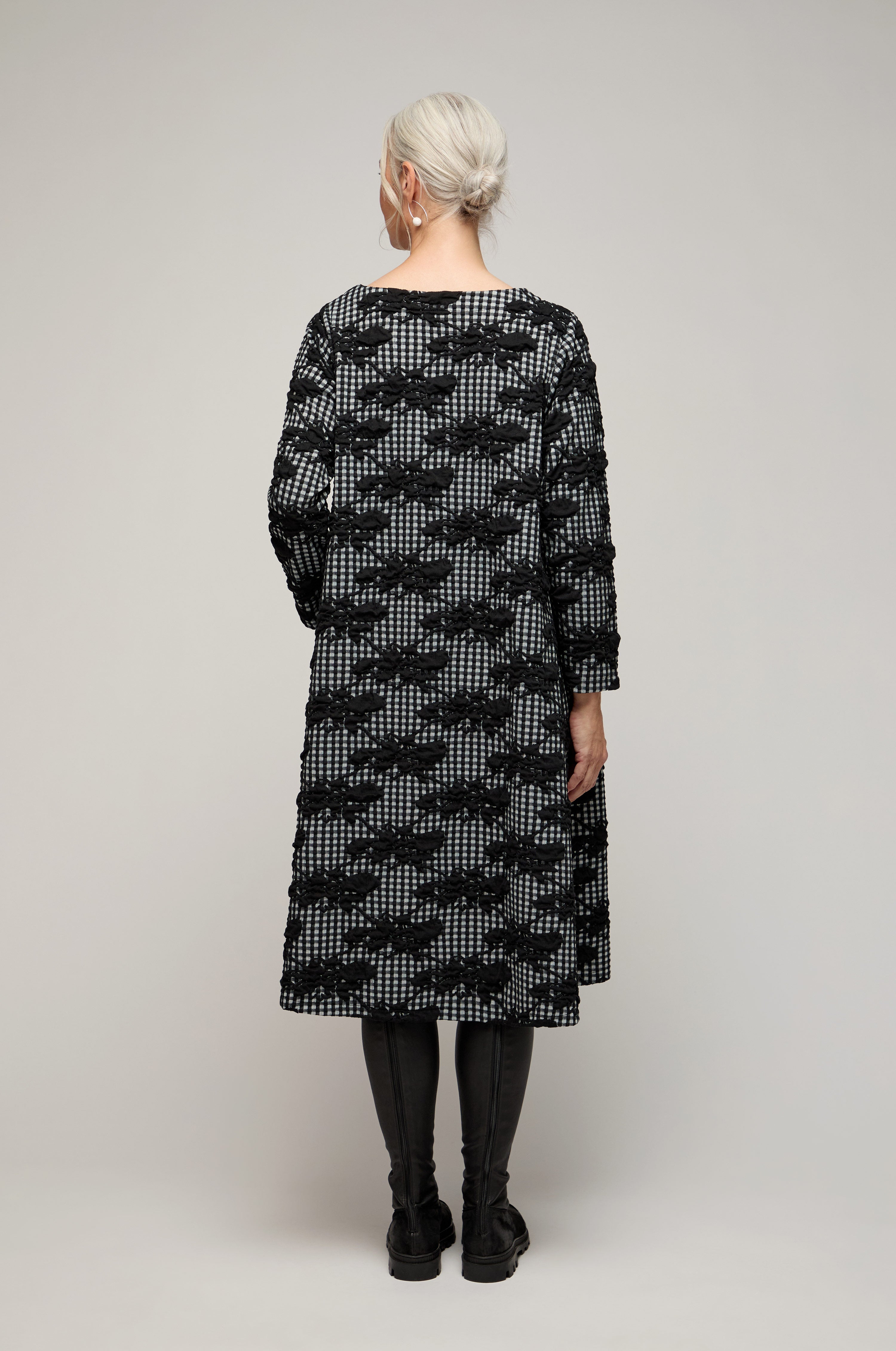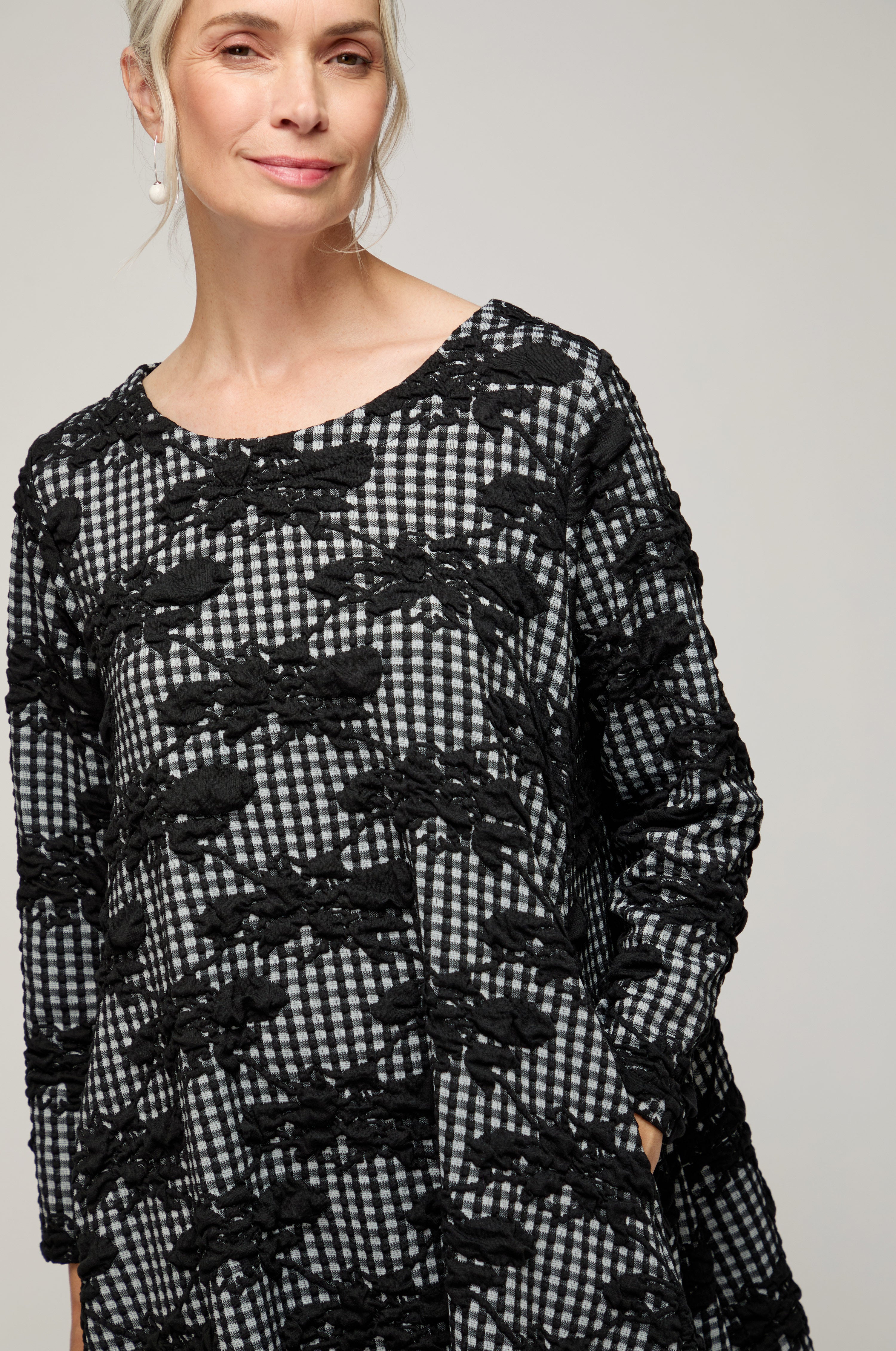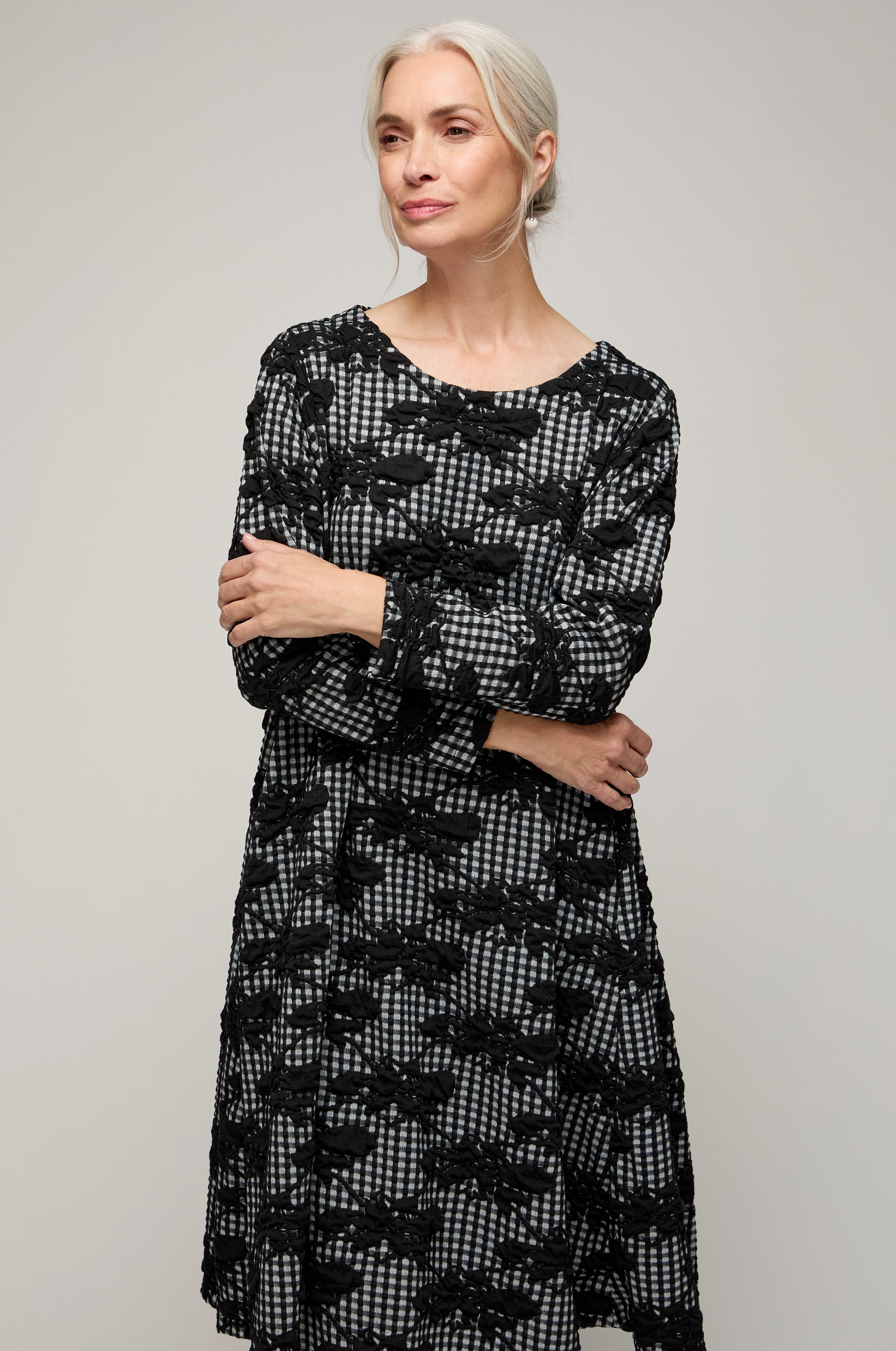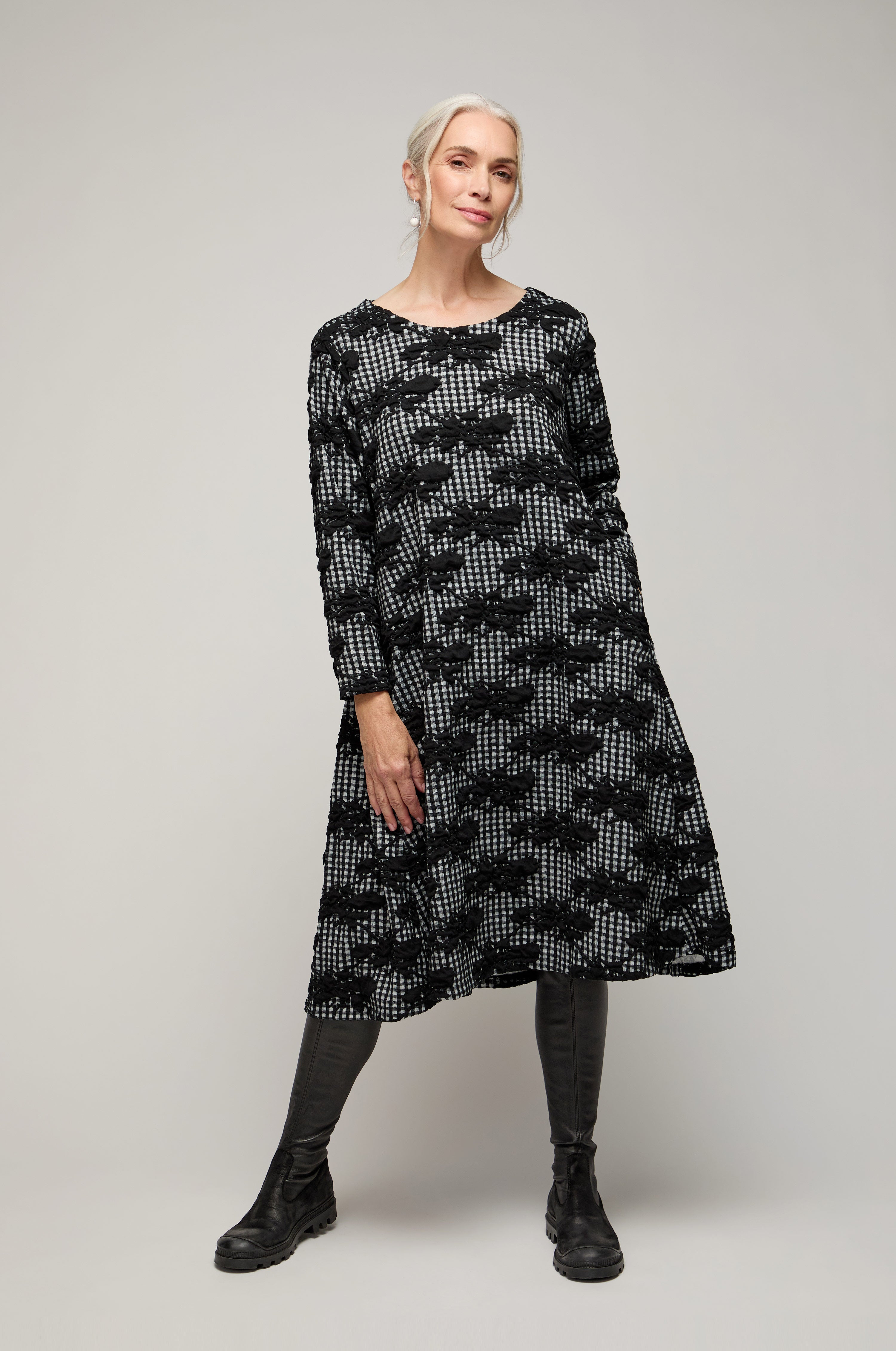This jersey dress is cut to a relaxed, easy shape with a round neckline and full sleeves for balanced coverage. The print sets classic gingham against hand-drawn florals, giving a lively, layered effect that remains wearable in monochrome. The fabric drapes smoothly, creating a clean line that skims rather than clings.