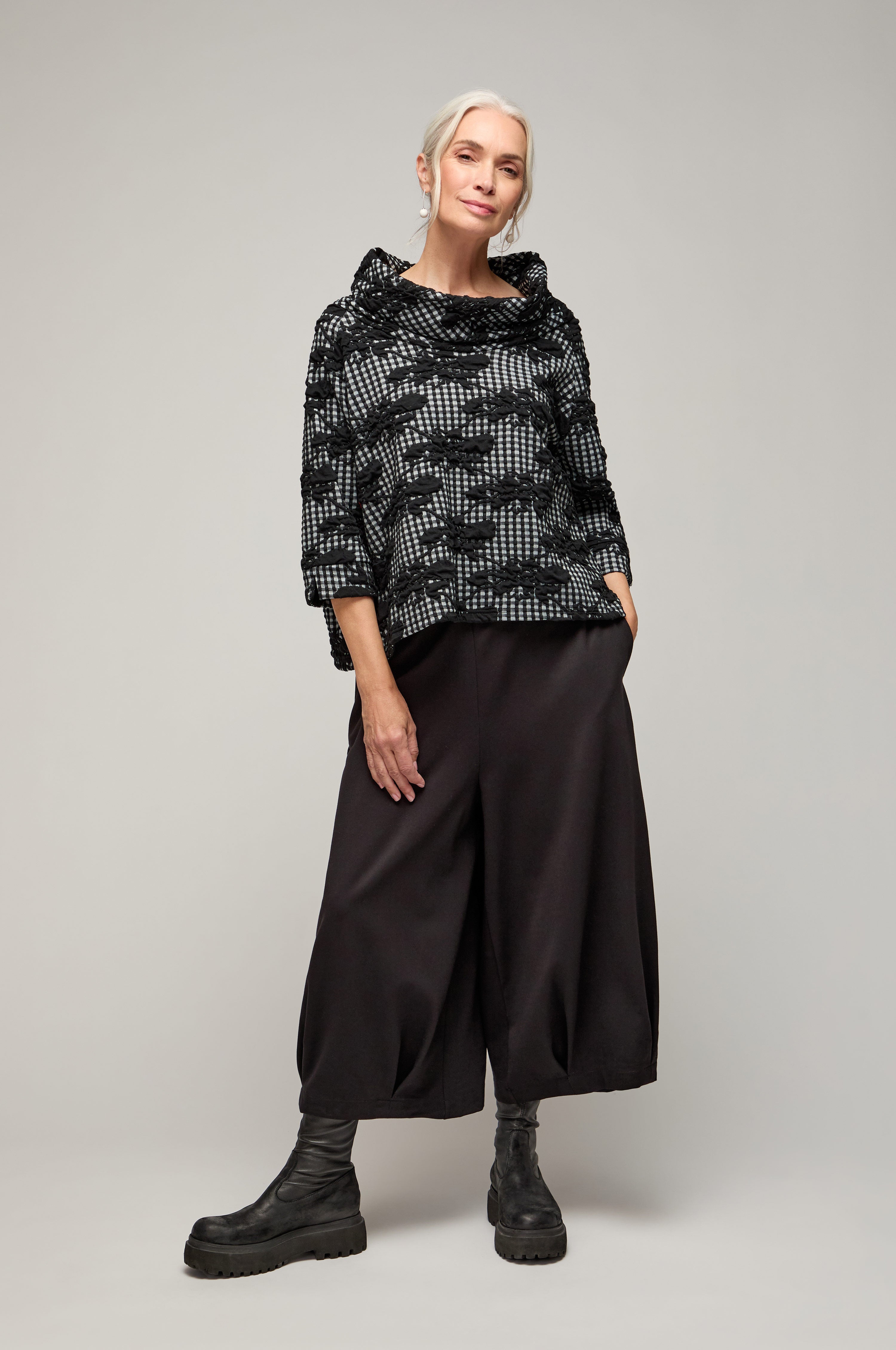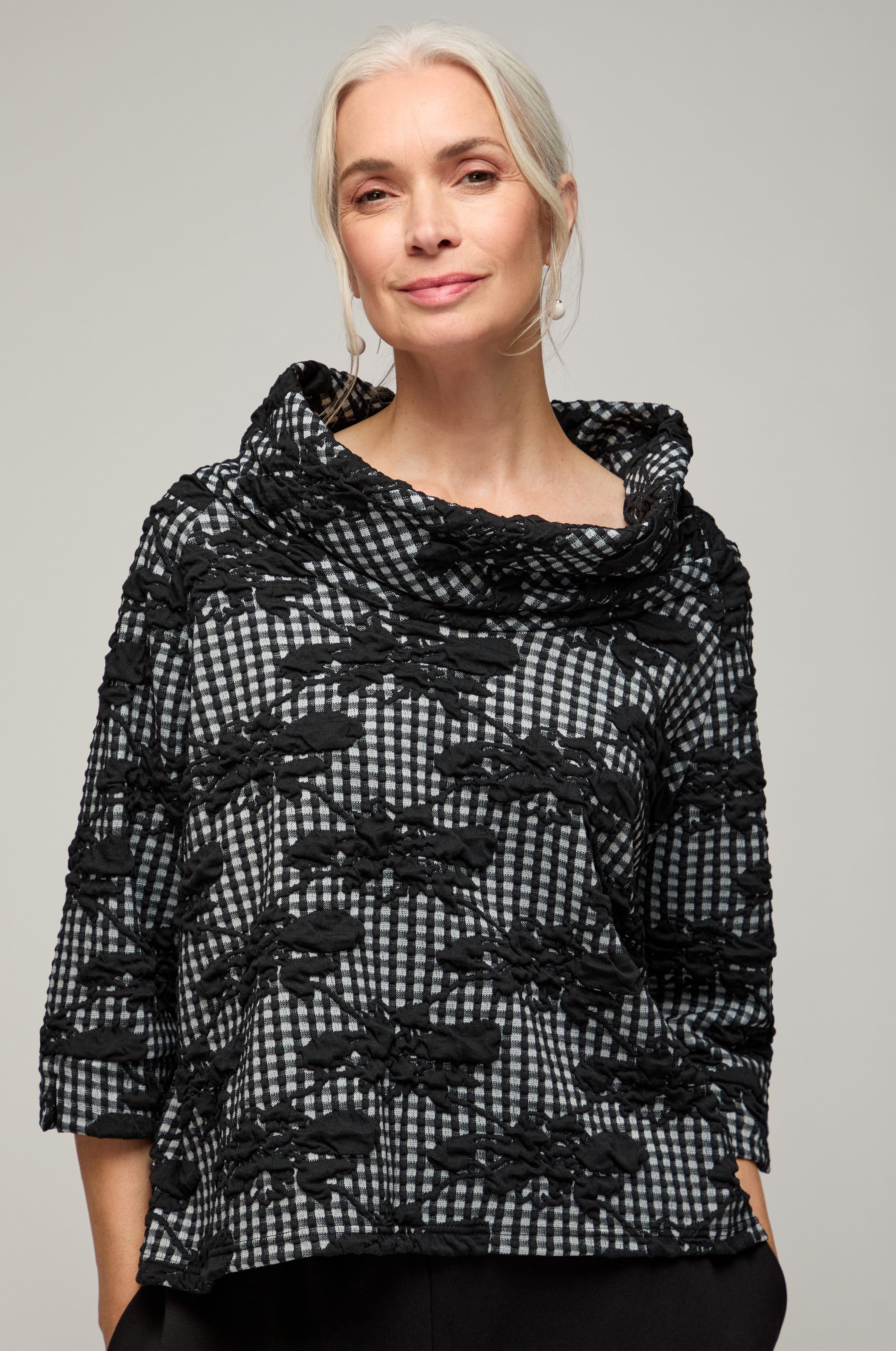 A fluid jersey top with a softly draped cowl neckline, this style balances a relaxed body with considered details that keep the silhouette refined. The monochrome gingham base is overlaid with bold floral artwork, creating depth and movement across the surface. Long sleeves and a straight hem make it ideal for layering.