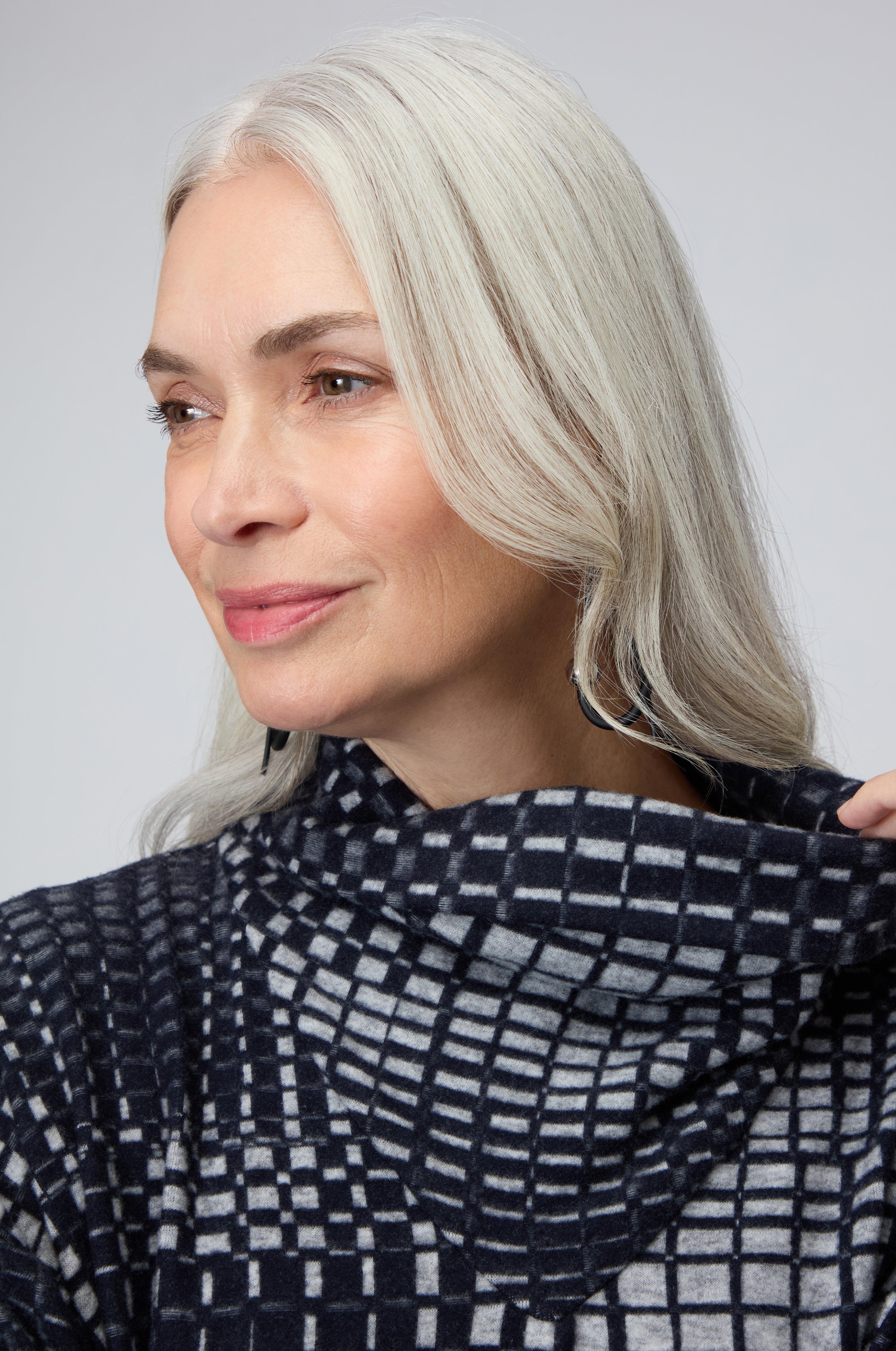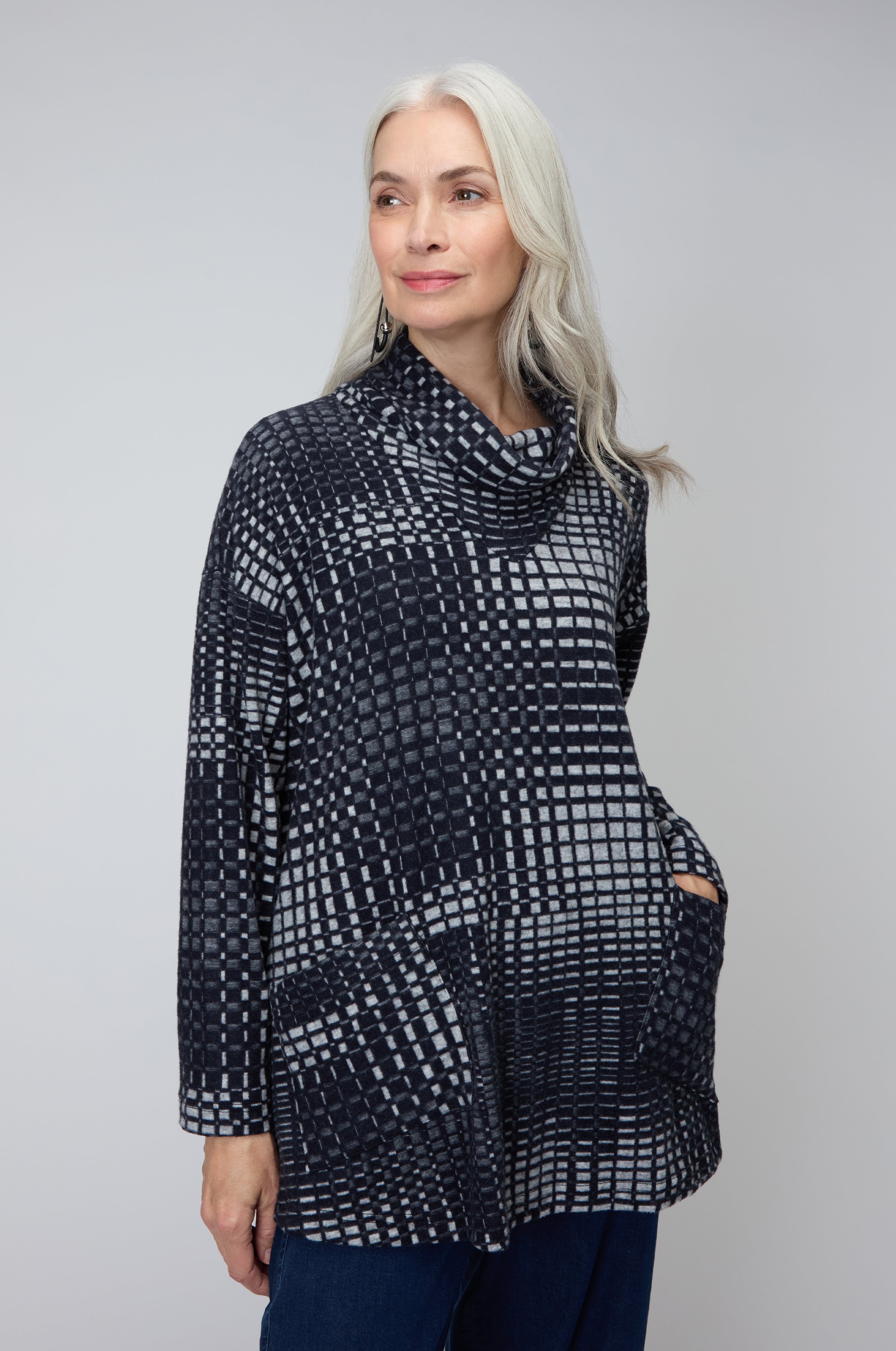 The Sahara Illusion Check Jersey Tunic reimagines structure through artful design. Crafted in the UK from plush brushed jacquard jersey, the fabric plays with architectural lines inspired by an urban skyline. The result is an unusual balance of industrial strength and feminine softness, its high-contrast grid pattern enhanced by a luxuriously tactile handle. The cowl collar, full-length sleeves, and relaxed boxy shape lend effortless ease, while patch pockets bring practical detail.
