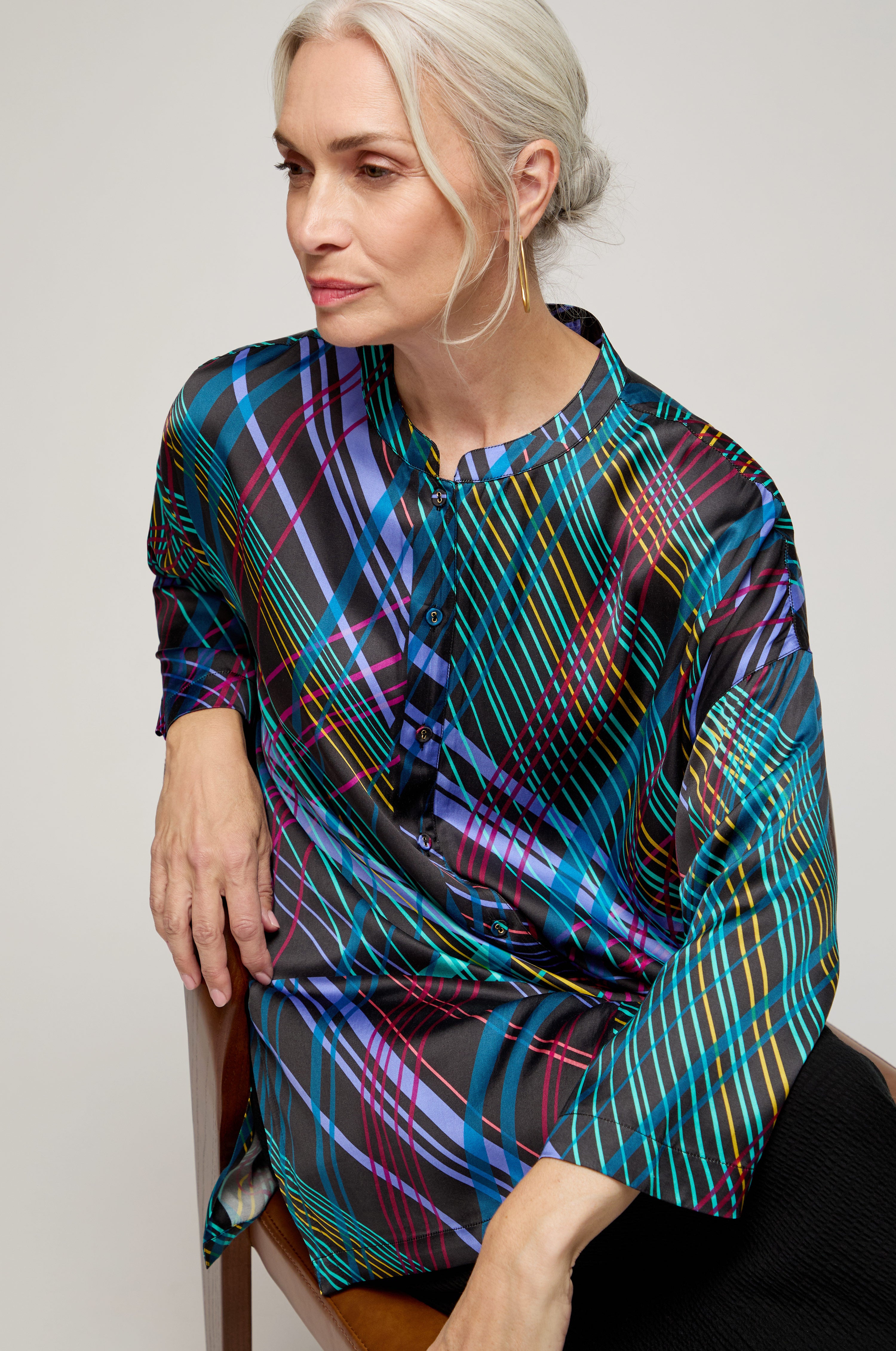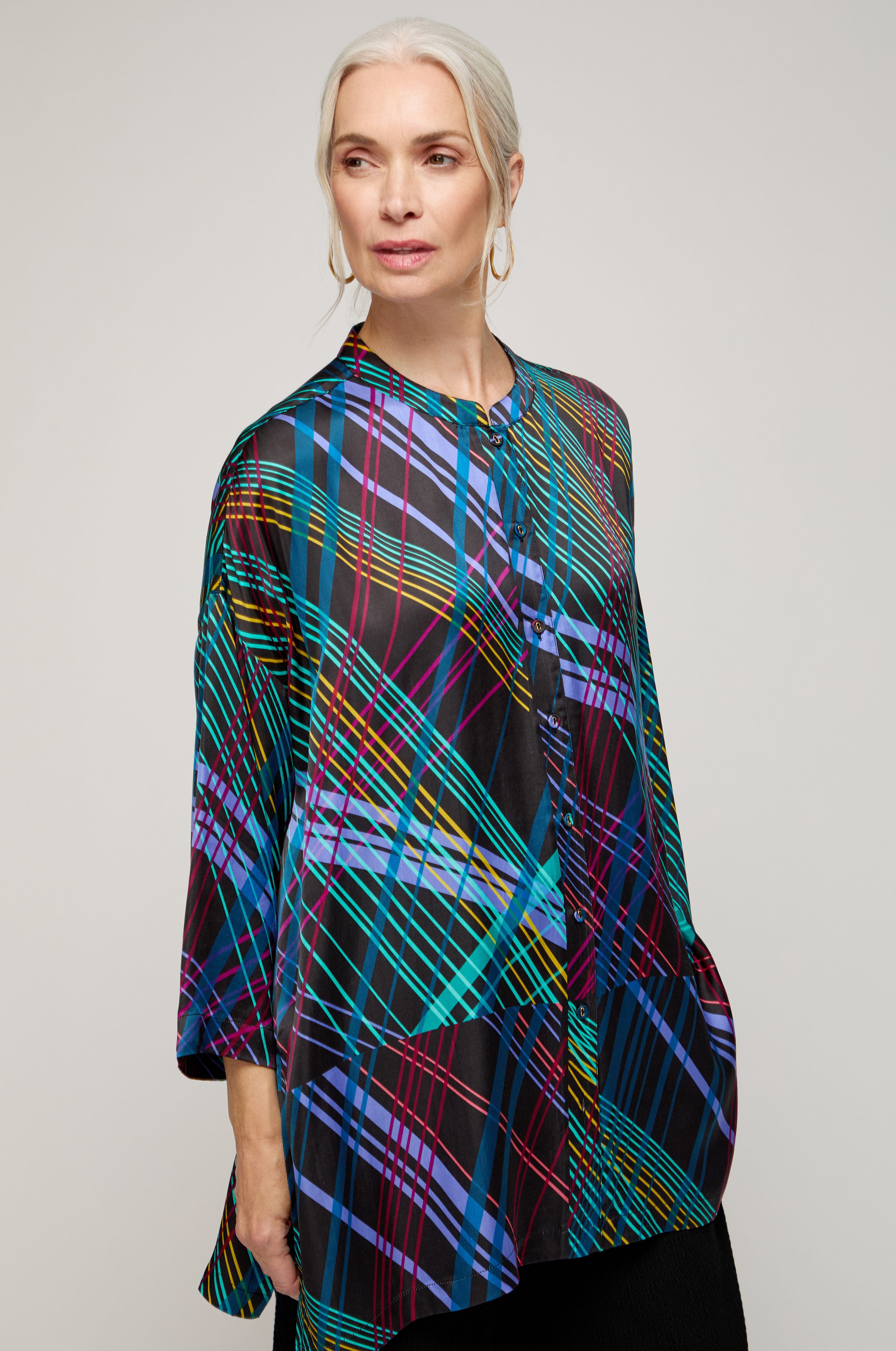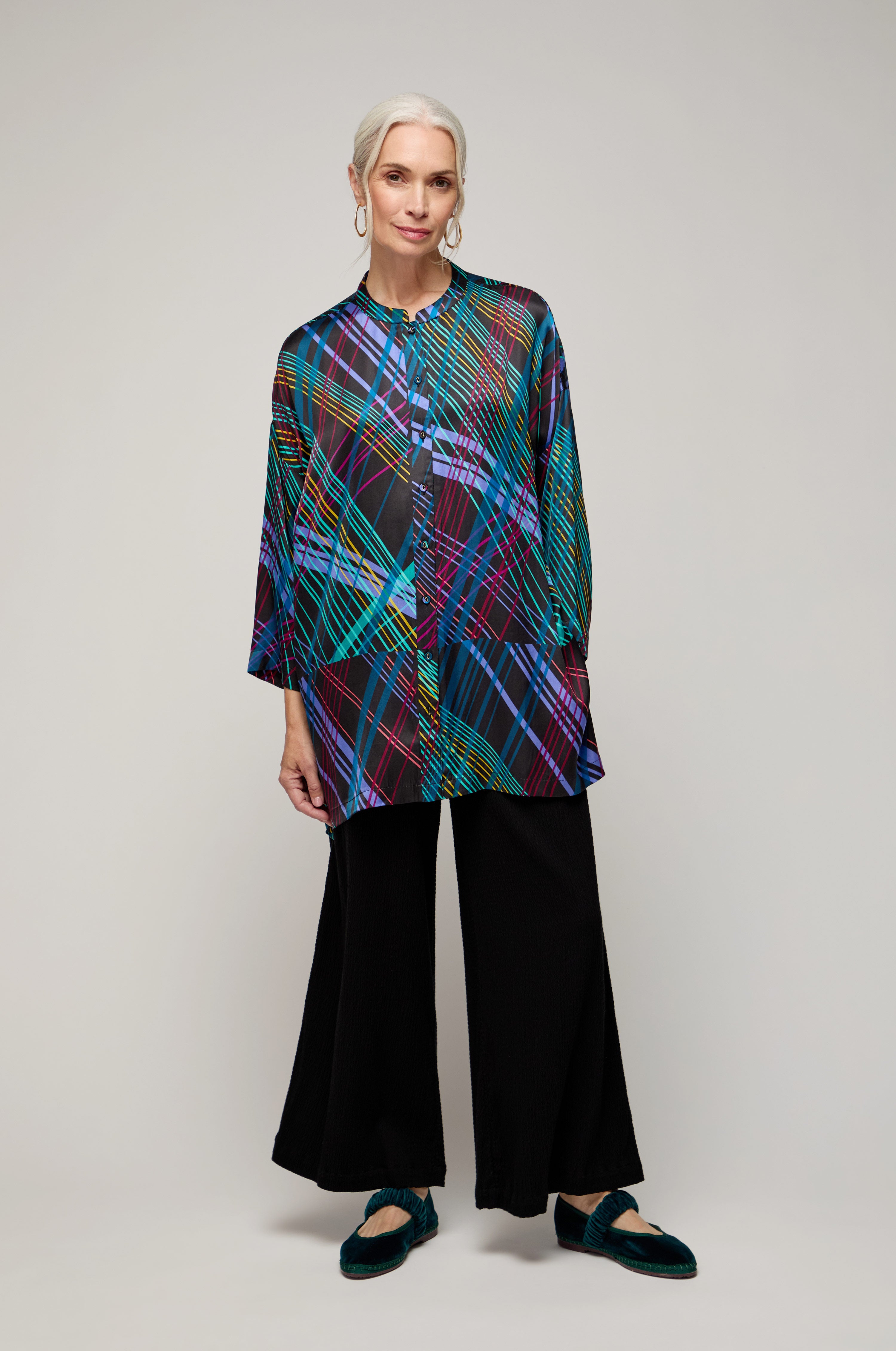 The Sahara Laser Lights Shirt is alive with pattern and detail. Crafted in silky viscose, the fabric is printed with multicoloured linear strokes that create rhythm and movement across the surface. The longline tunic silhouette flows with ease, finished with side splits that add lightness and freedom. A Nehru collar frames the neckline, while a front placket with covered buttons gives a refined, seamless finish.