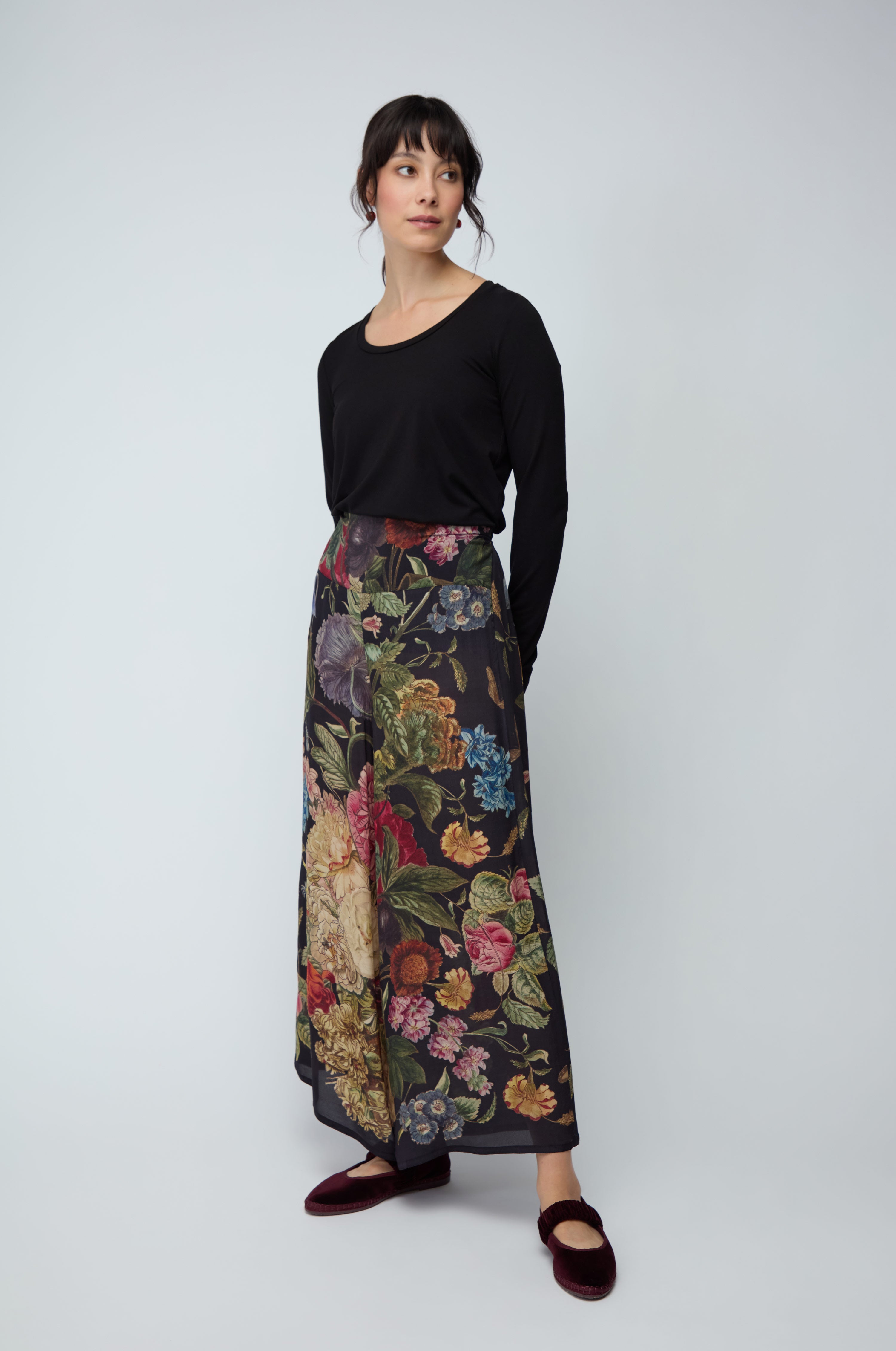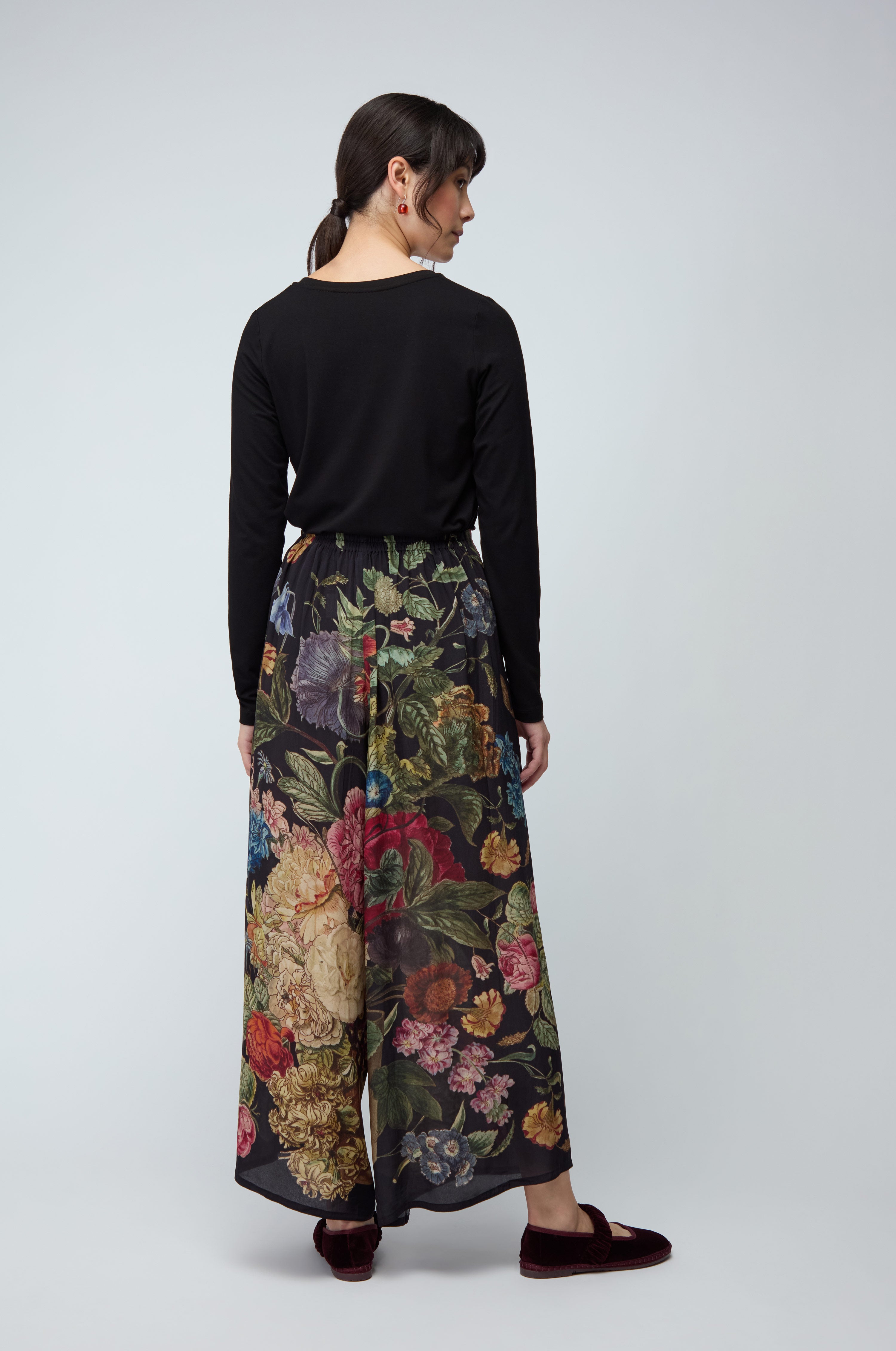 The One Hundred Stars Primula Crepe Palazzo Trousers are fashioned from a sumptuous crepe blend of cupro and viscose, giving a fluid drape with a soft luminous finish. The wide-leg silhouette falls from a relaxed waistband, offering full flow and ease, perfect for movement and comfort. The print is inspired by the Dutch Old Masters: primroses, auriculas and polyanthus flourish in bold contrasting colours across the black ground, each motif sharply detailed yet painterly in effect.