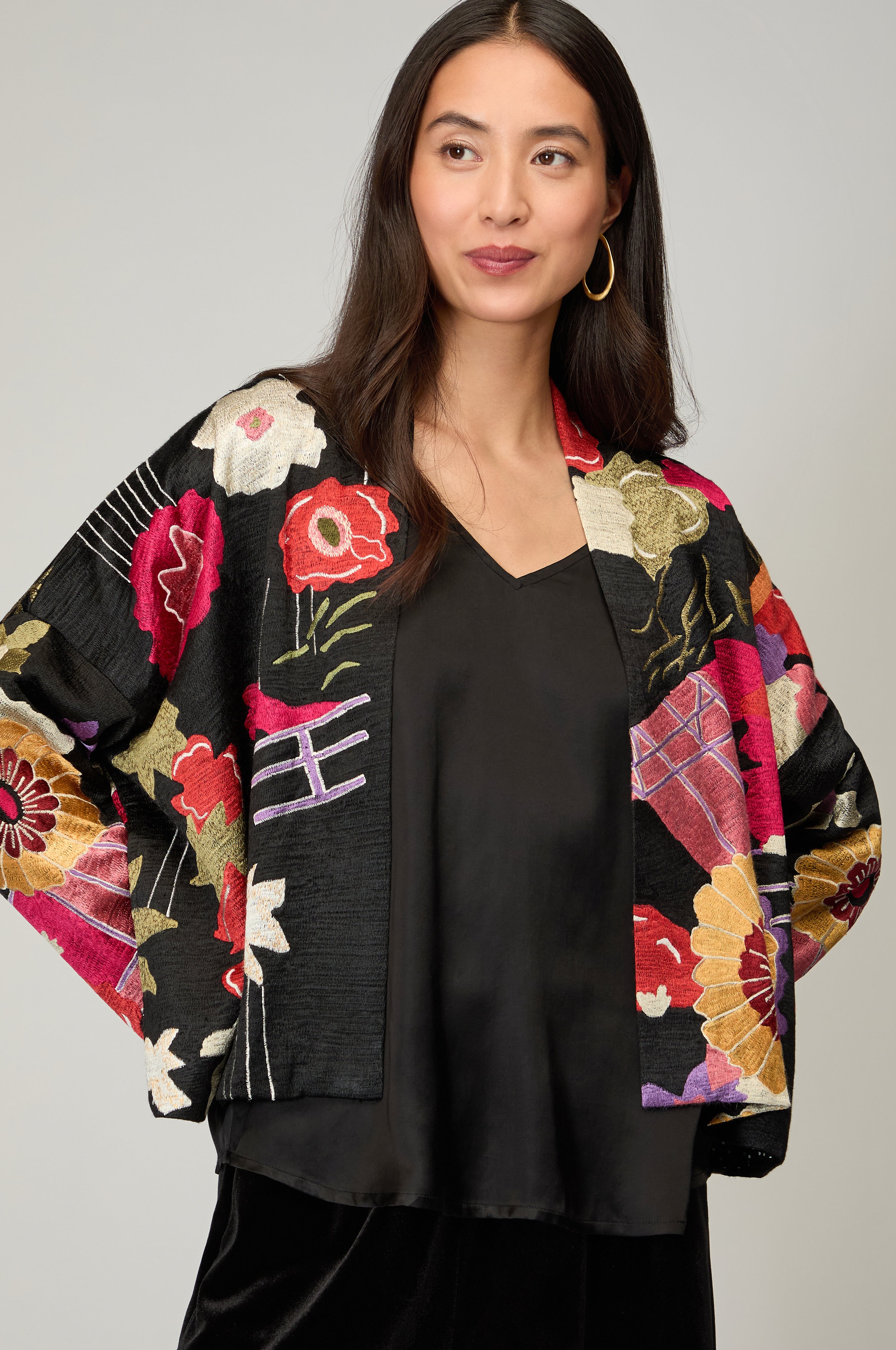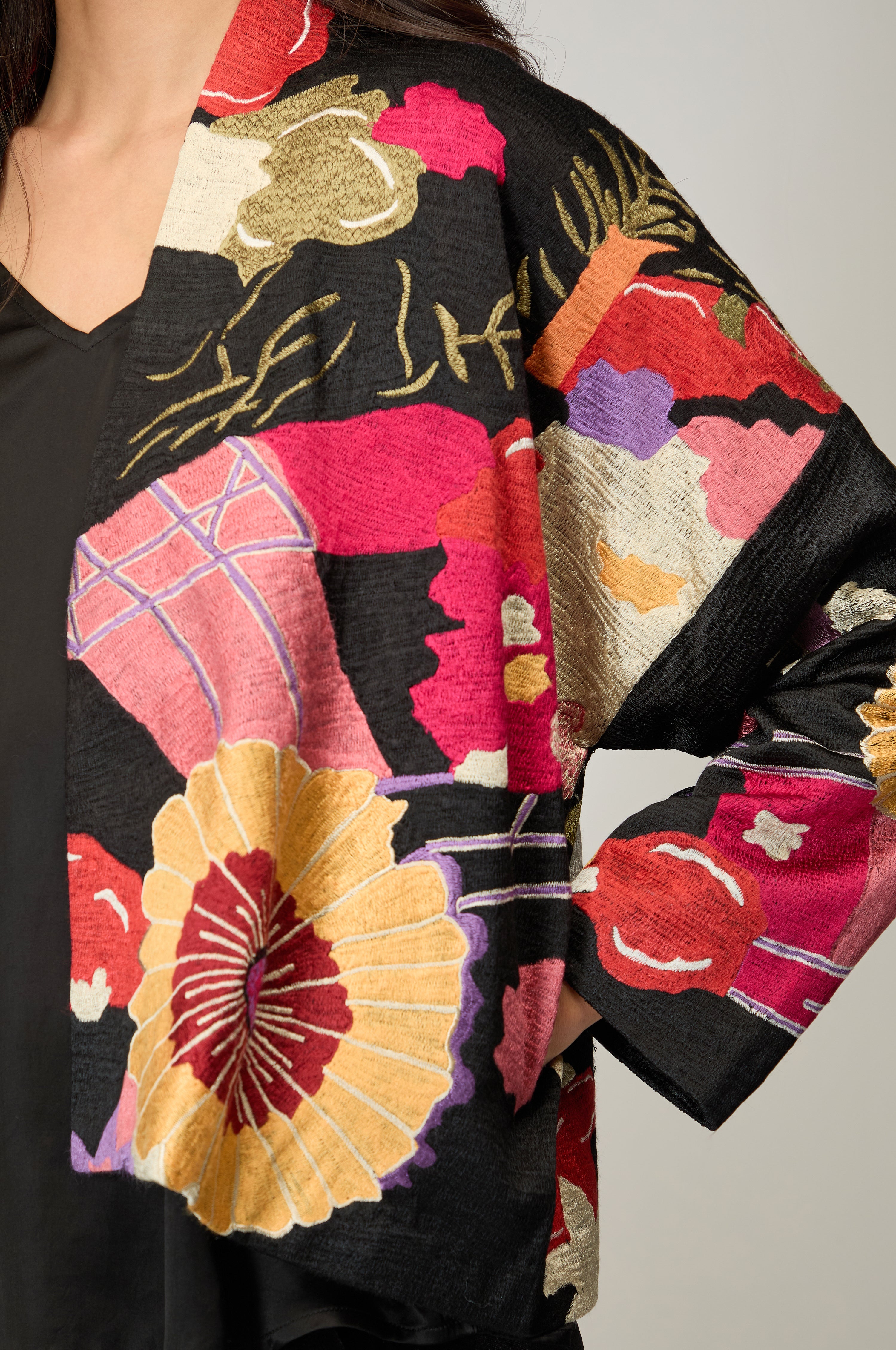 The Yavi Silk Embroidered Jacket embodies meticulous craftsmanship. Crafted from pure silk, its surface is adorned with intricate hand embroidery, each stitch adding texture and luminosity. It features an open front, cropped length, and discreet side pockets. The jacket’s lightweight drape enhances its fluid silhouette, balancing refinement with artistic detail.