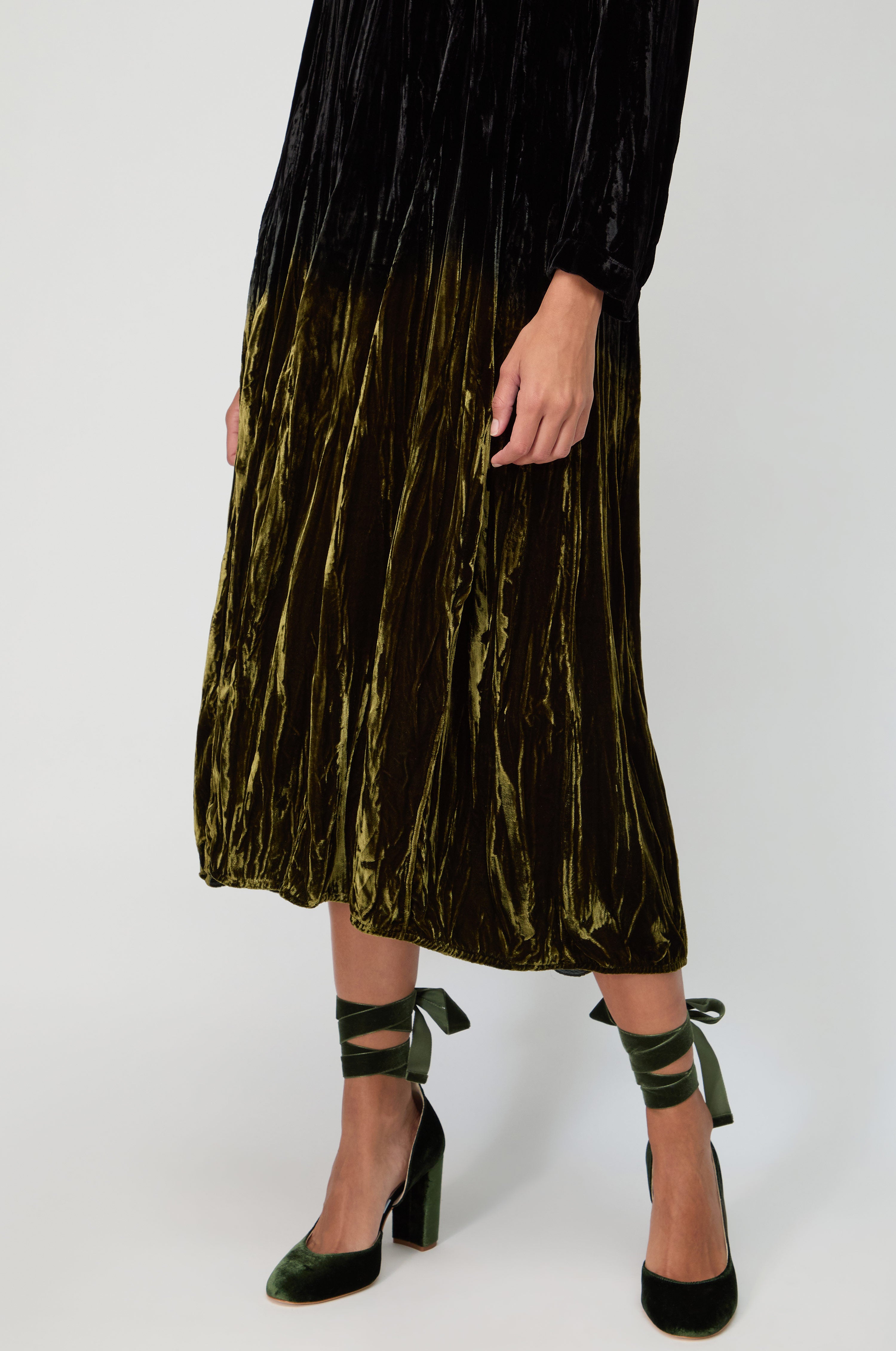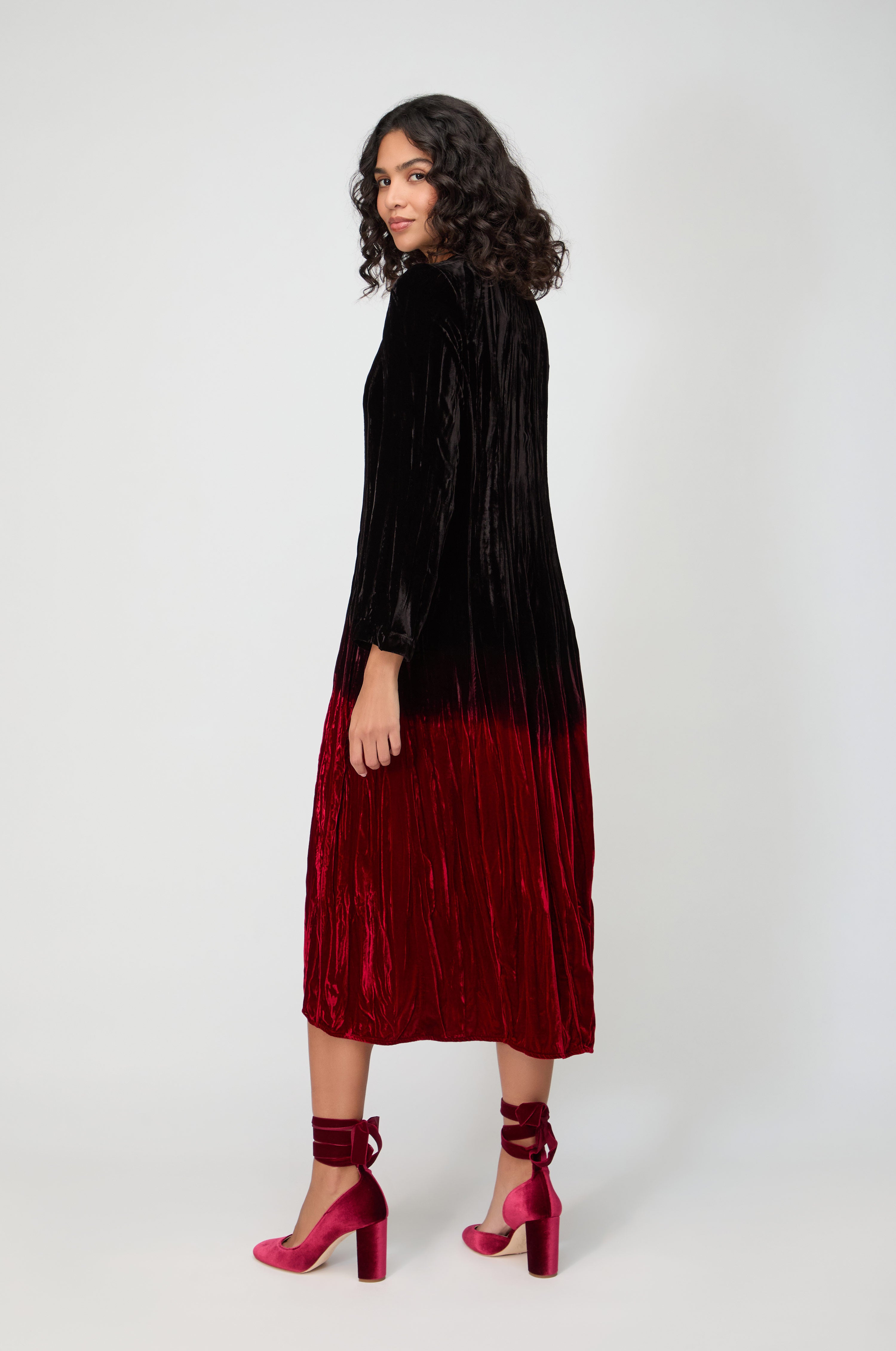 Available in olive or cherry ombre, this dress offers a dramatic base for seasonal styling. Wear simply with boots and jewellery to let the colour gradation take focus, or layer with knits and coats to enhance its tactile surface through cooler days.