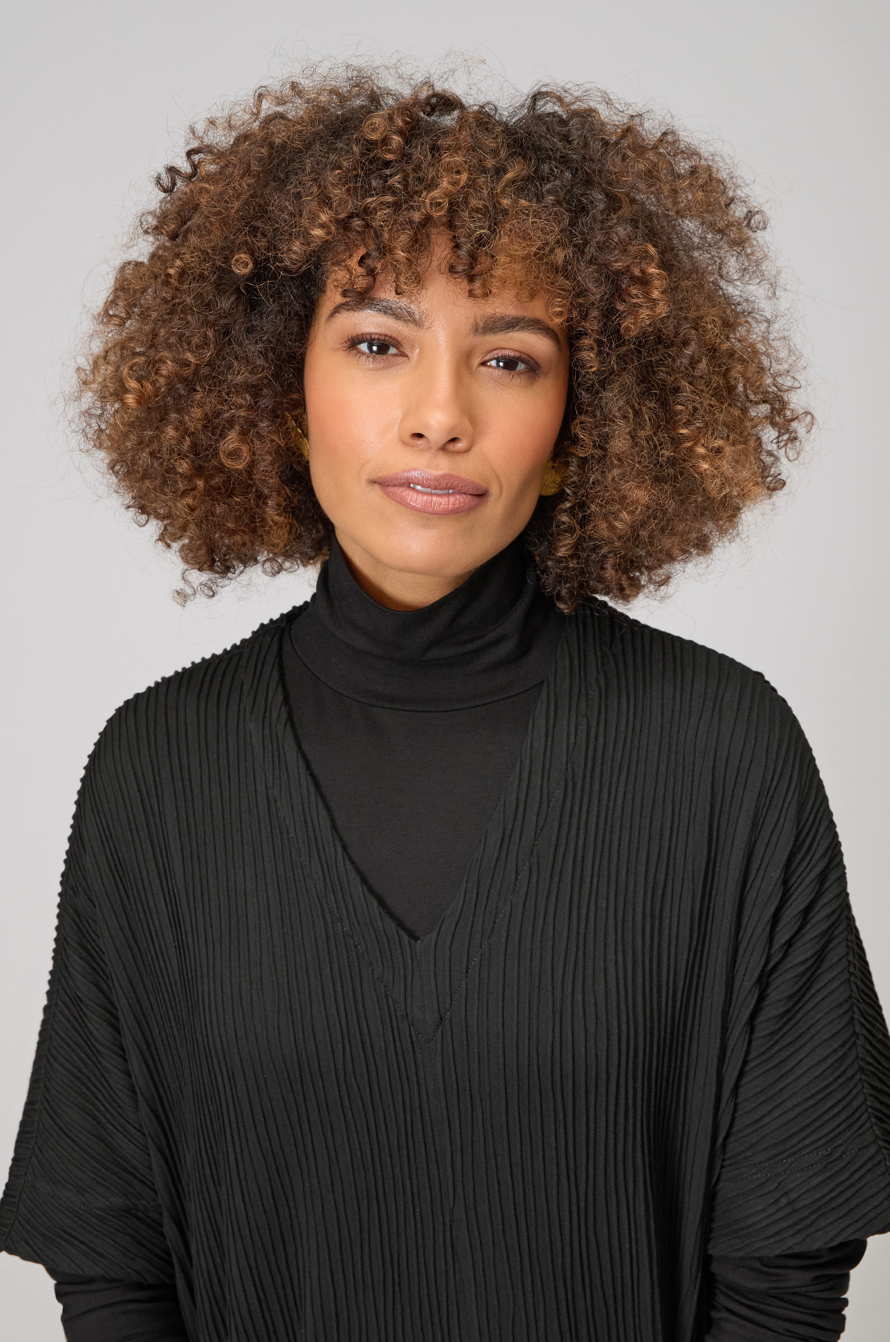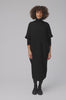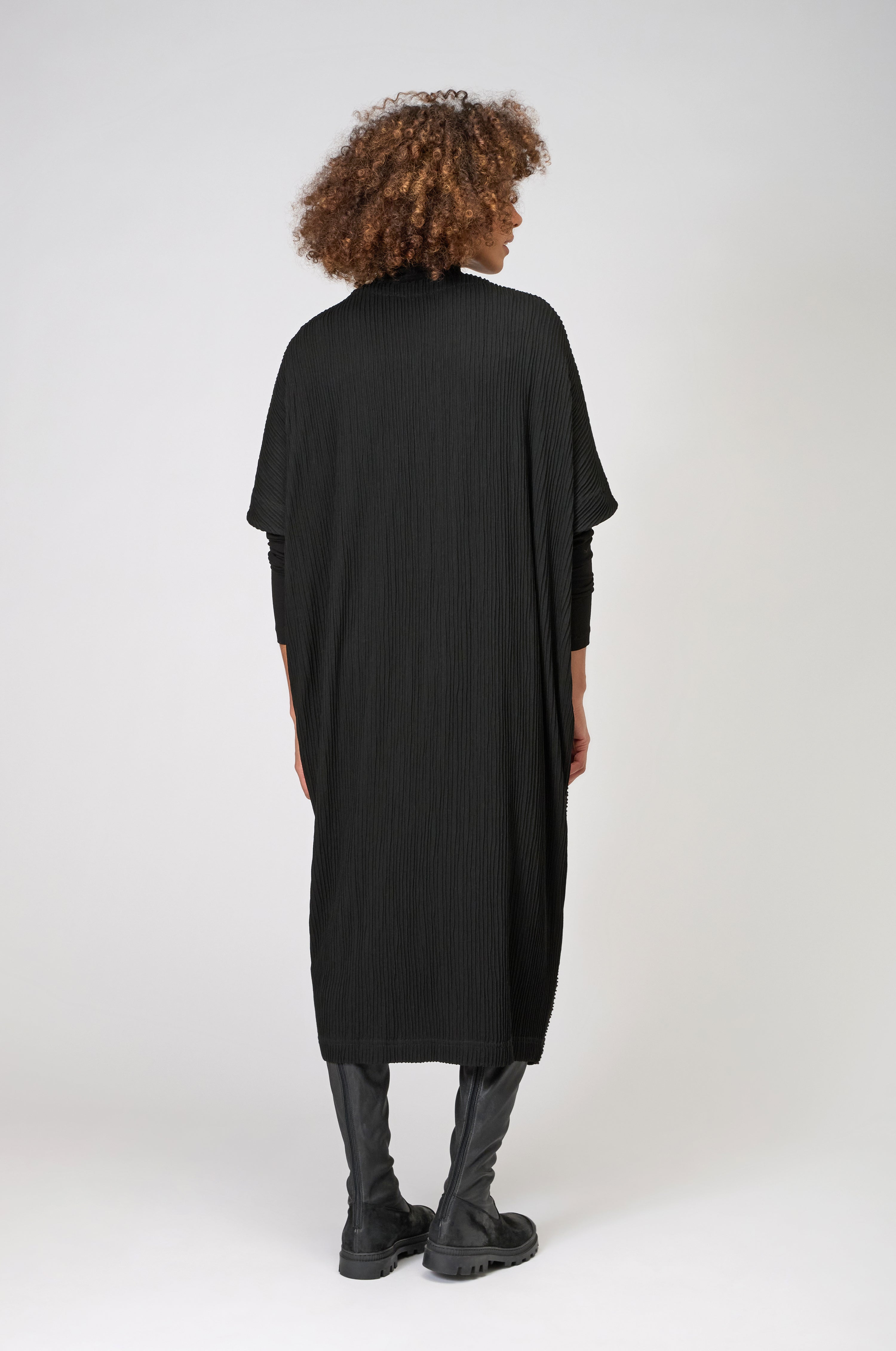 The Sahara Textured Wave Jersey Dress is cut from pleat-effect viscose jersey with natural stretch, giving the surface a sculptural, rippled texture. The silhouette has an architectural kaftan-inspired cut with a relaxed cocoon line that drapes fluidly on the body. A V-neck frames the collarbone, while cropped sleeves and front seam pockets add a balance of ease and practicality. The midi length completes the shape, balancing proportion and ease.