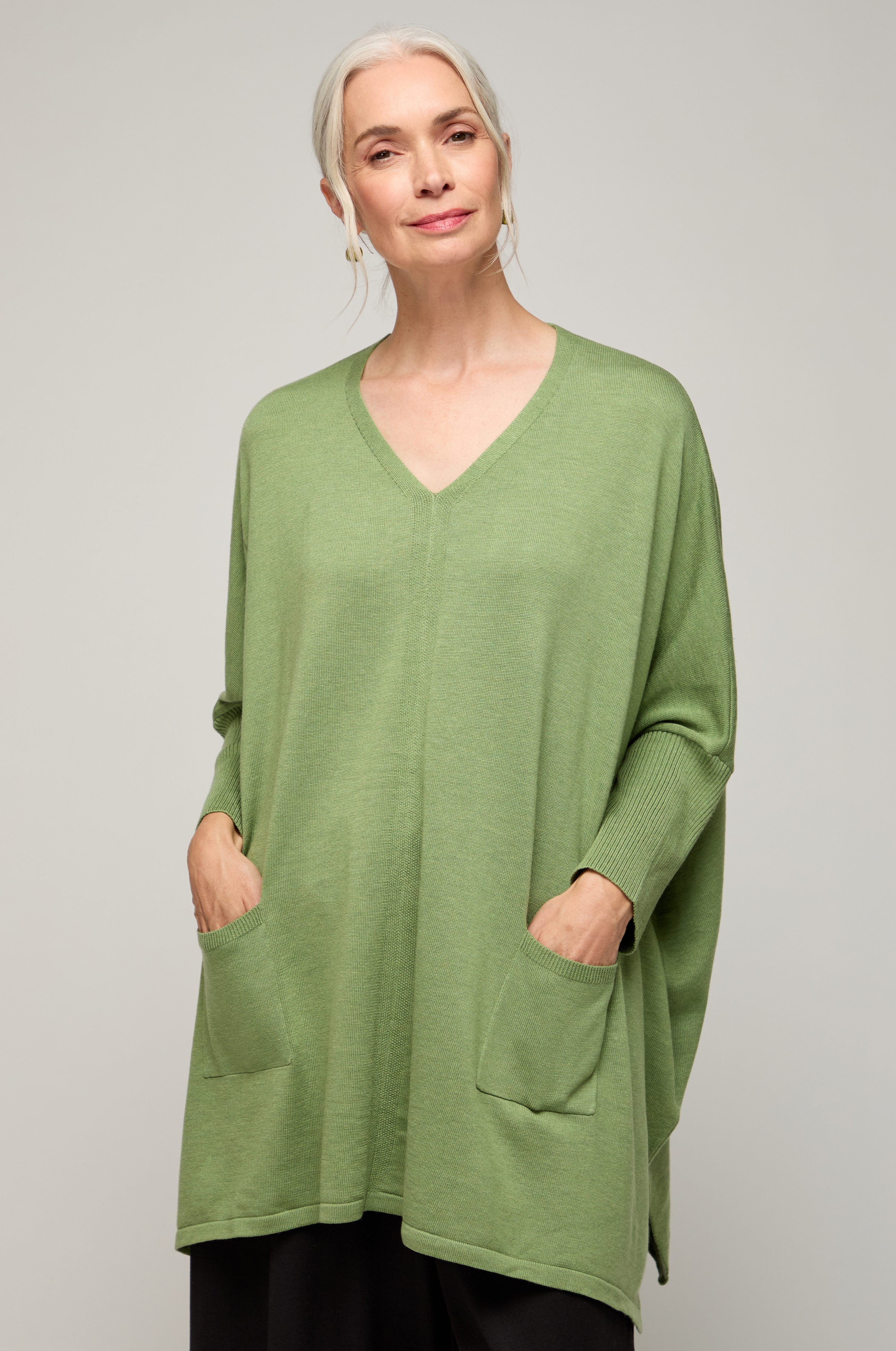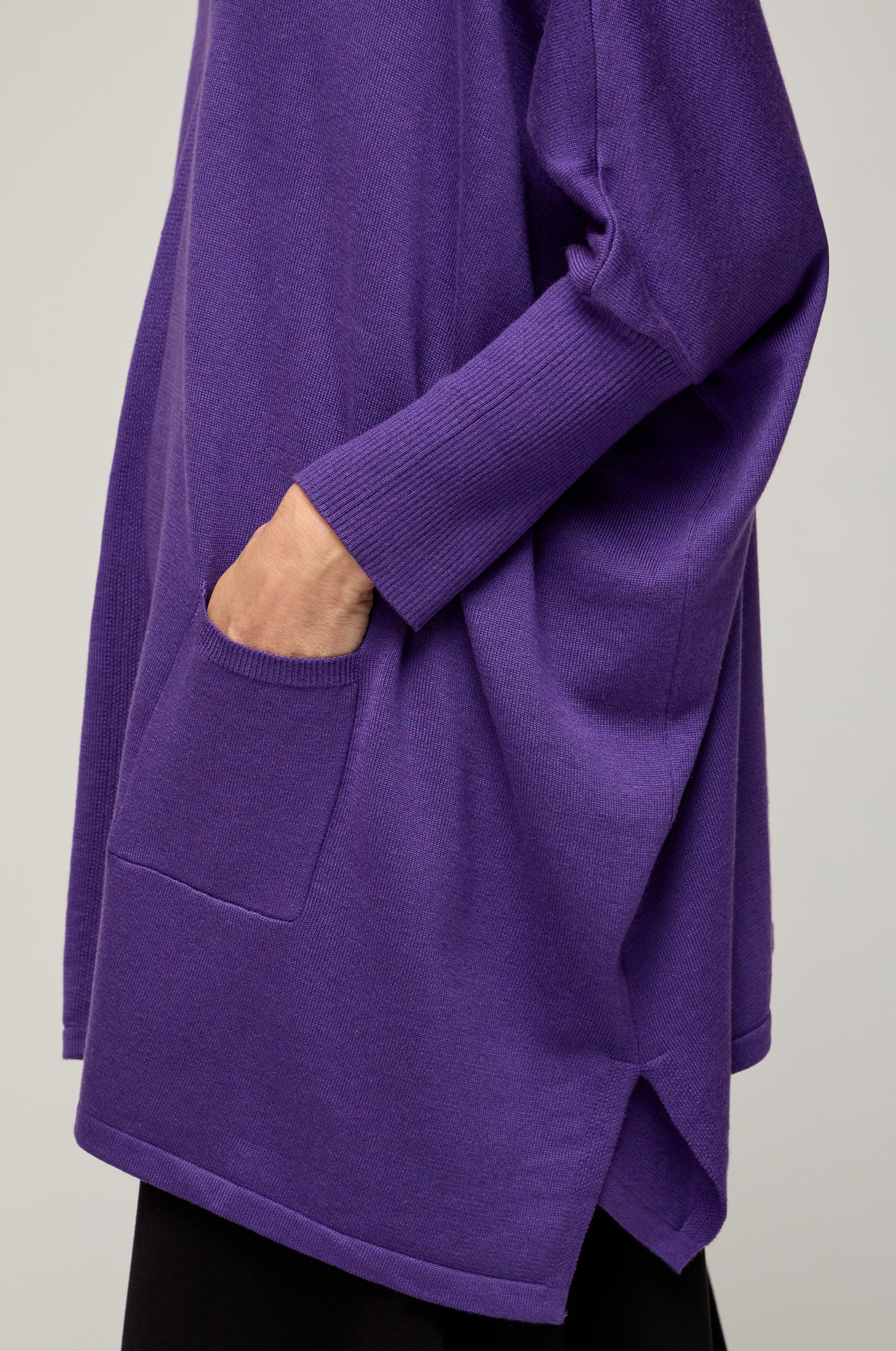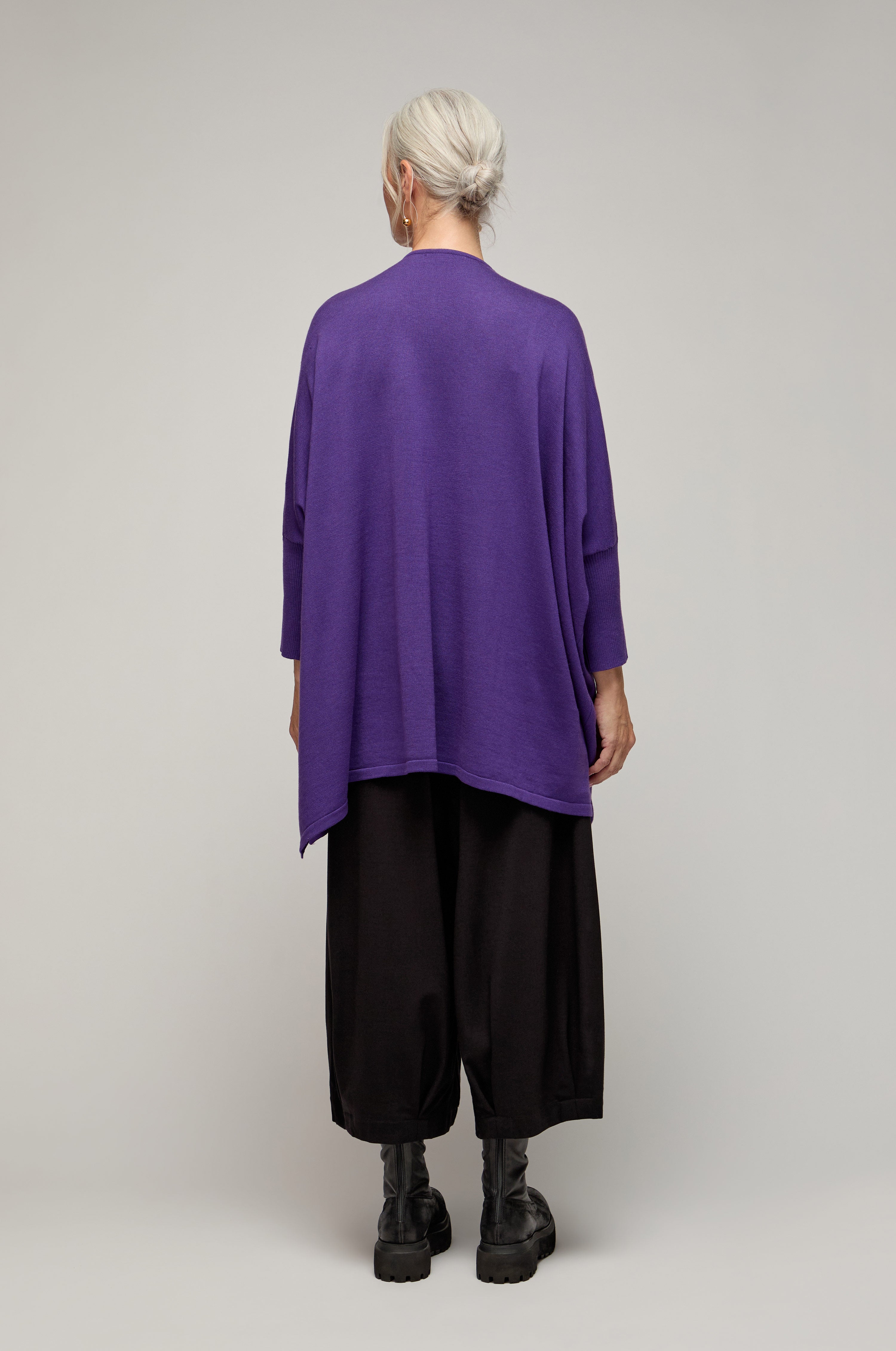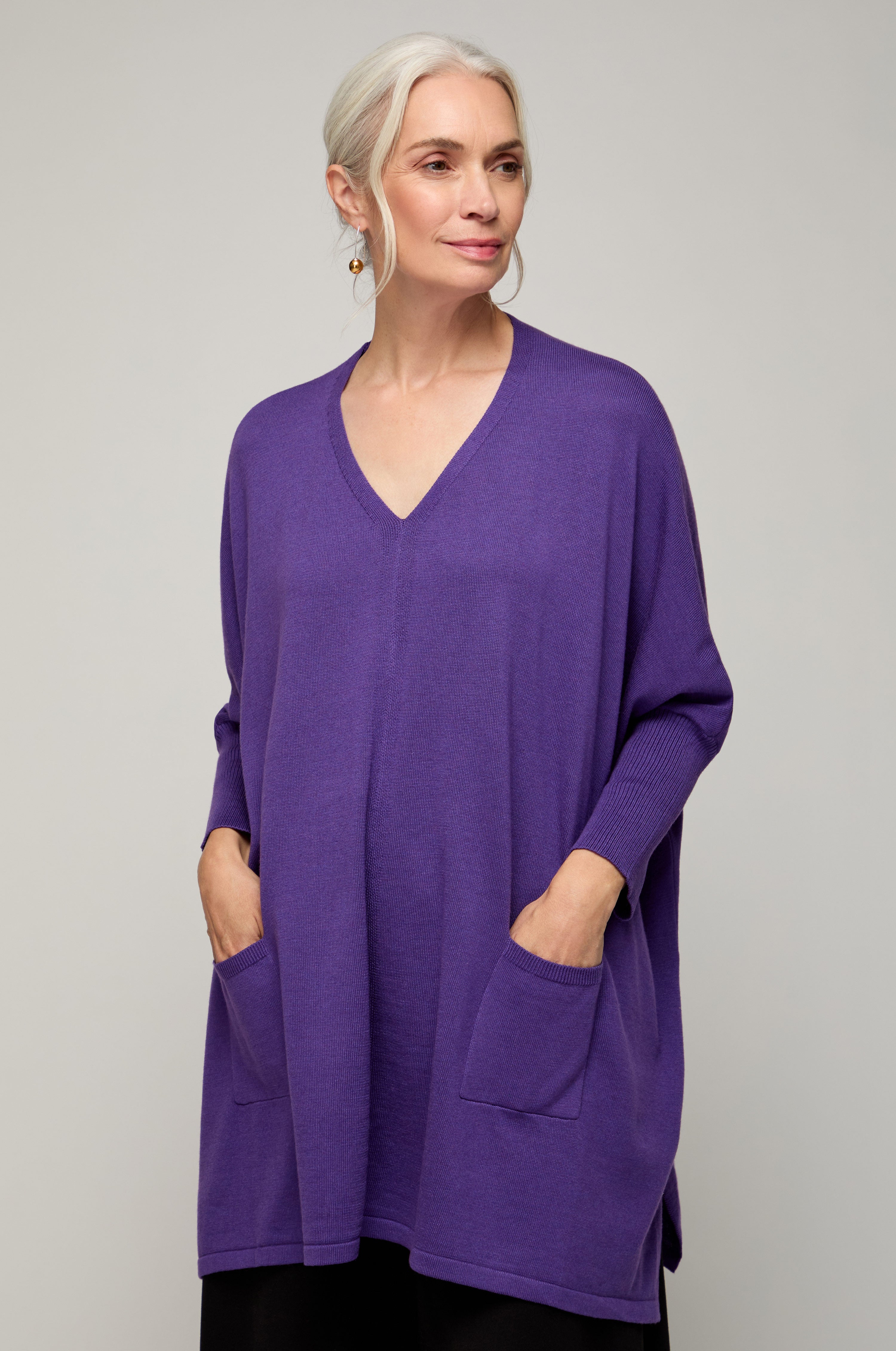 A lightweight knit with a wide V-neck and a gently boxy body, this piece offers easy drape and year-round versatility. Dropped shoulders soften the line and make layering effortless. In lime, the colour carries freshness and clarity, lifting neutrals and deepening tonal greens. And in rich purple, it brings a jewel-rich note to seasonal layering.