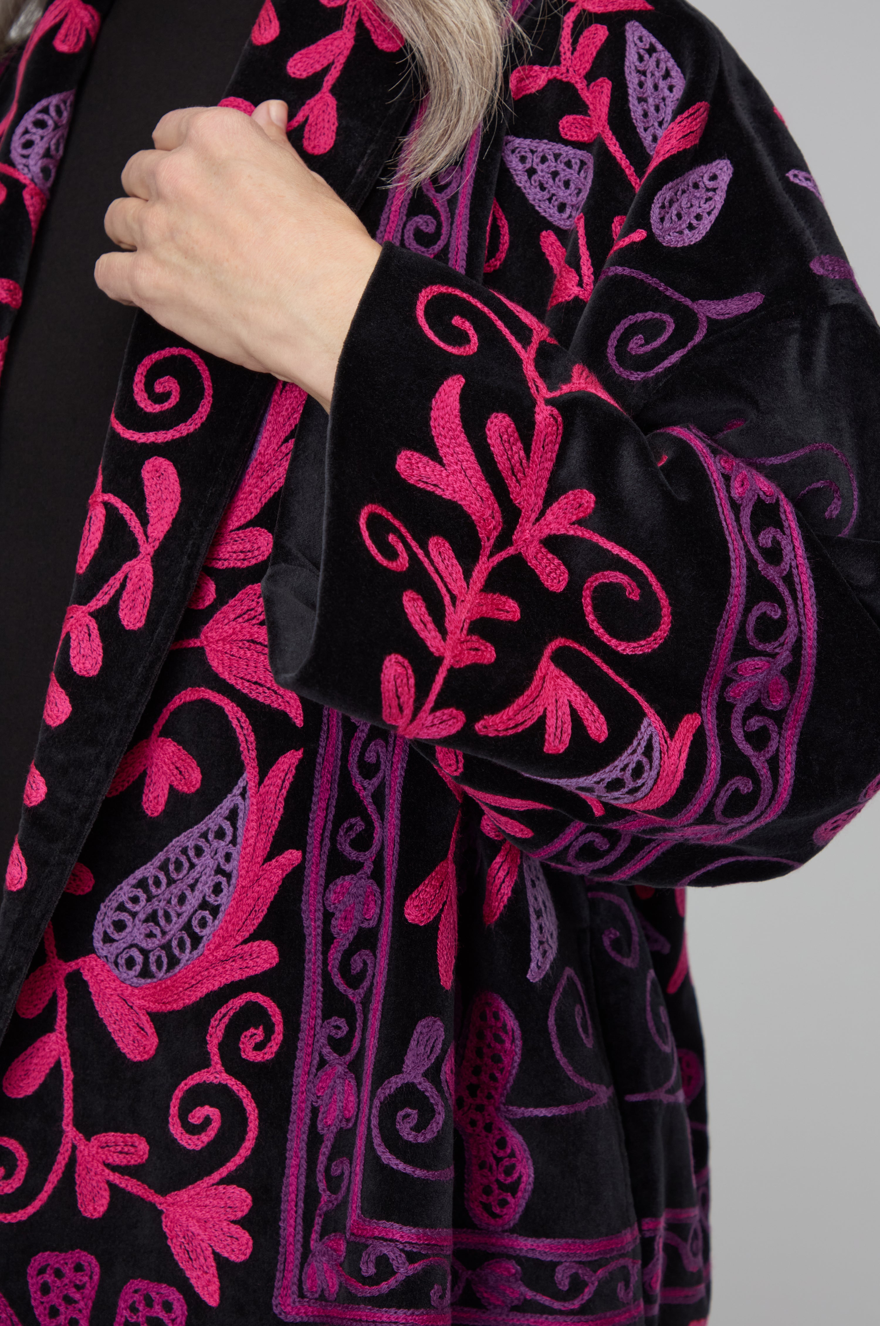 These jacket is as vibrant as it looks on the photograph. It is embroidered velvet and will last for years without dating.