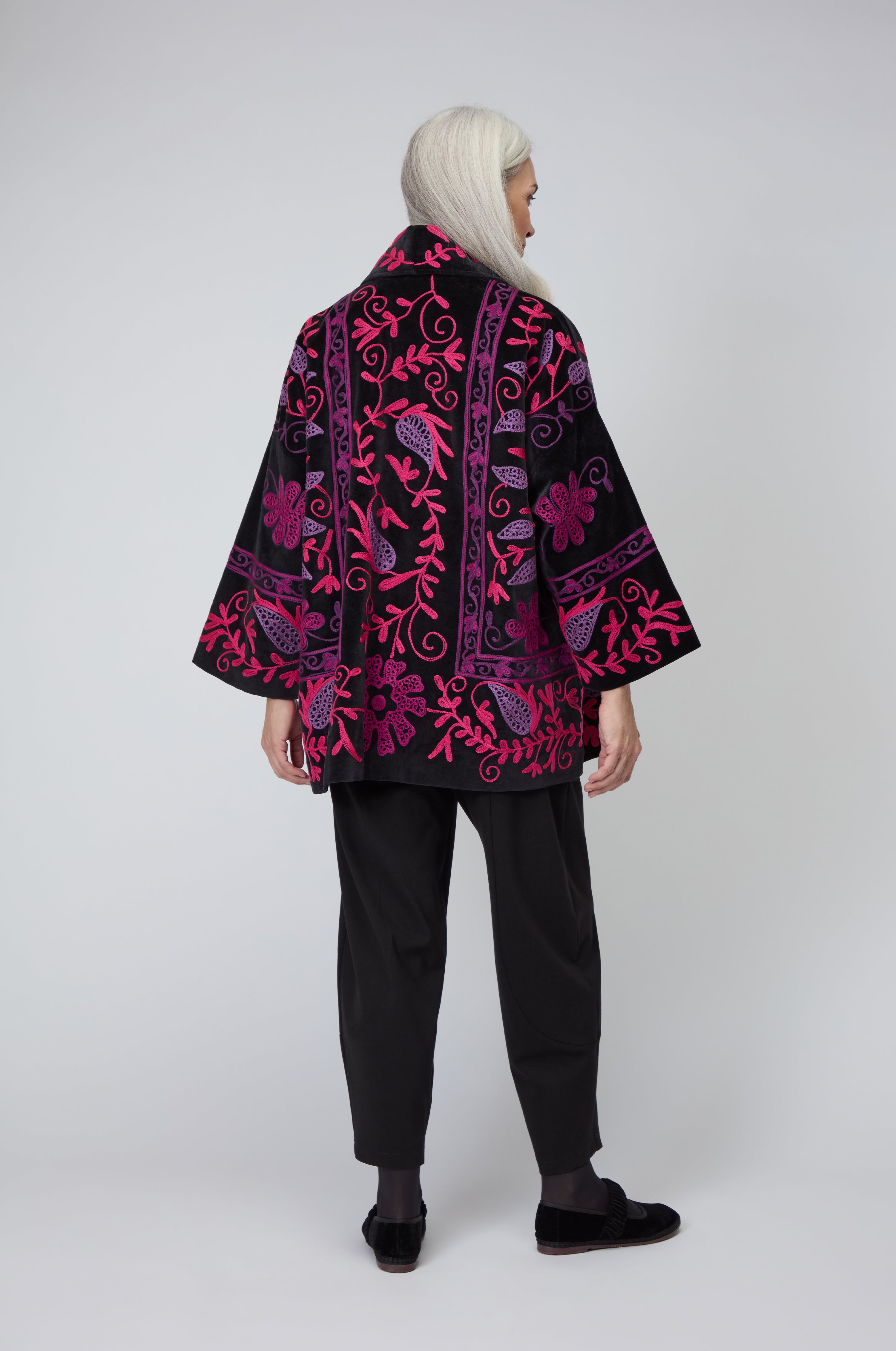 The Sahara Winter Embroidered Jacket showcases intricate embroidery across a soft base, each stitch adding dimension and artistry. The relaxed cut, with long sleeves, side seam pockets, and an open front, makes it easy to layer while ensuring the embroidery takes focus.