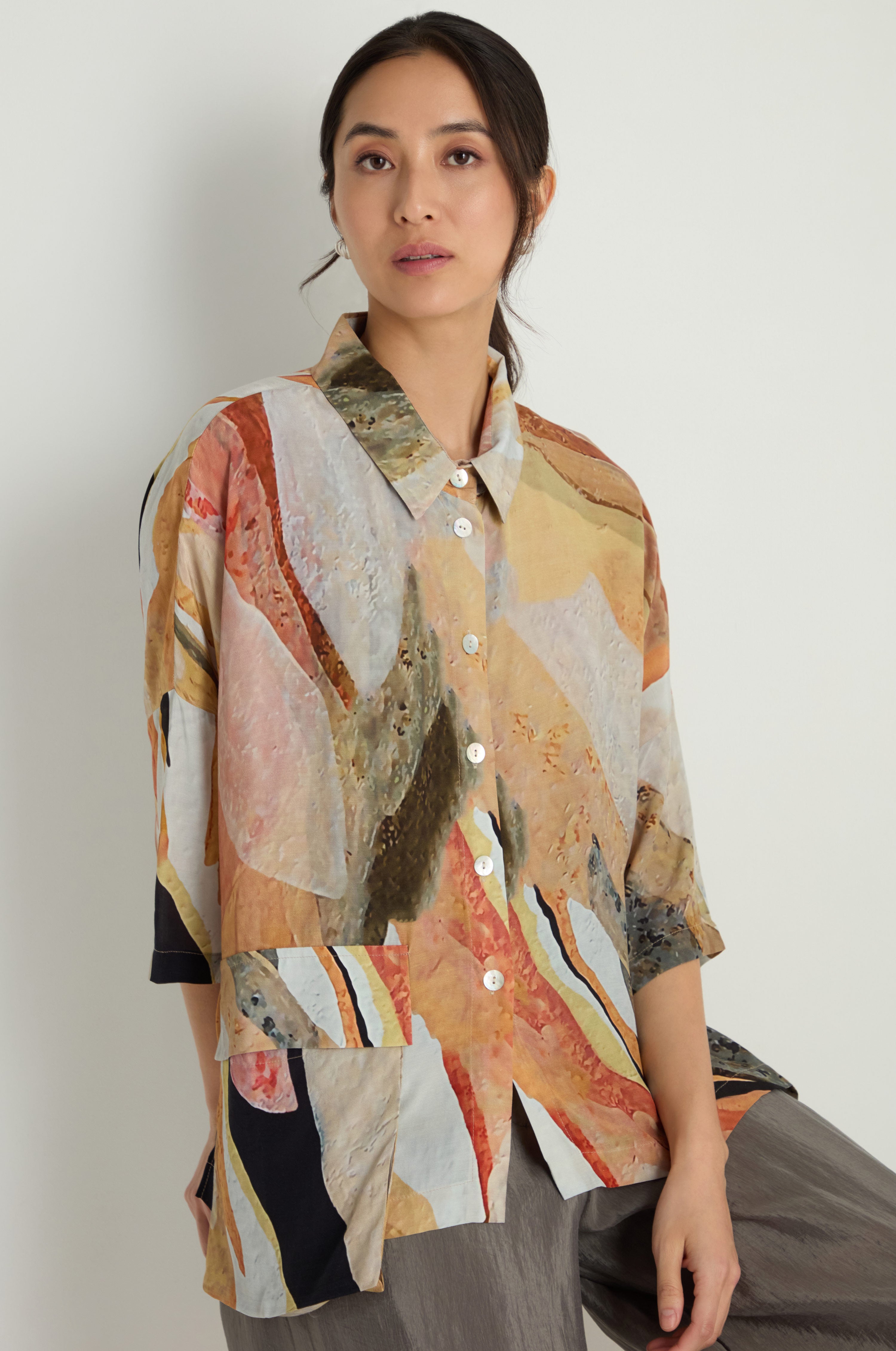 The Bize Abstract Earth Print Shirt has a grounded, almost landscape feel to it. The tones are warm and layered, giving the print a sense of depth rather than surface decoration. Easy to wear, but with enough interest to carry an outfit.