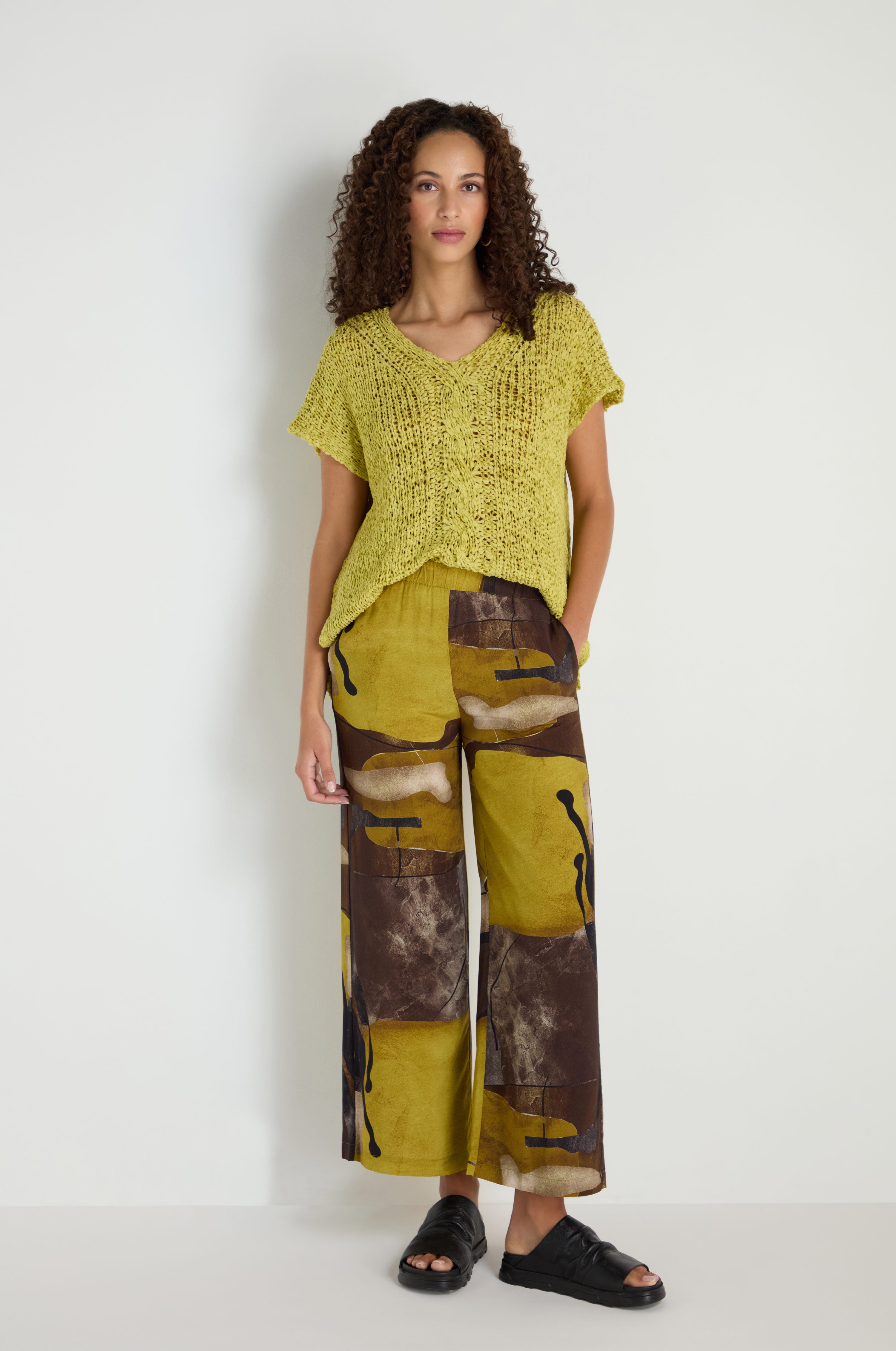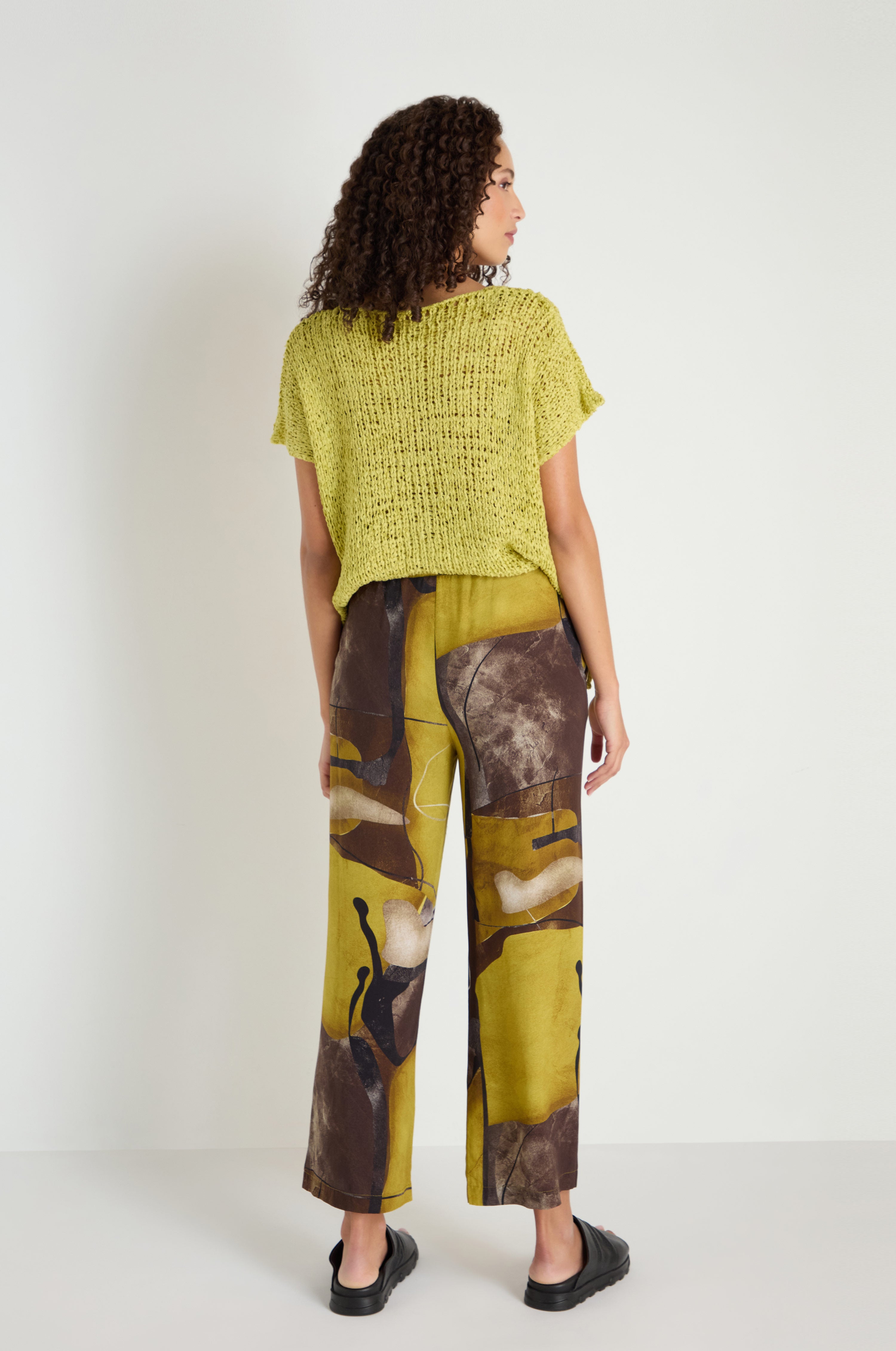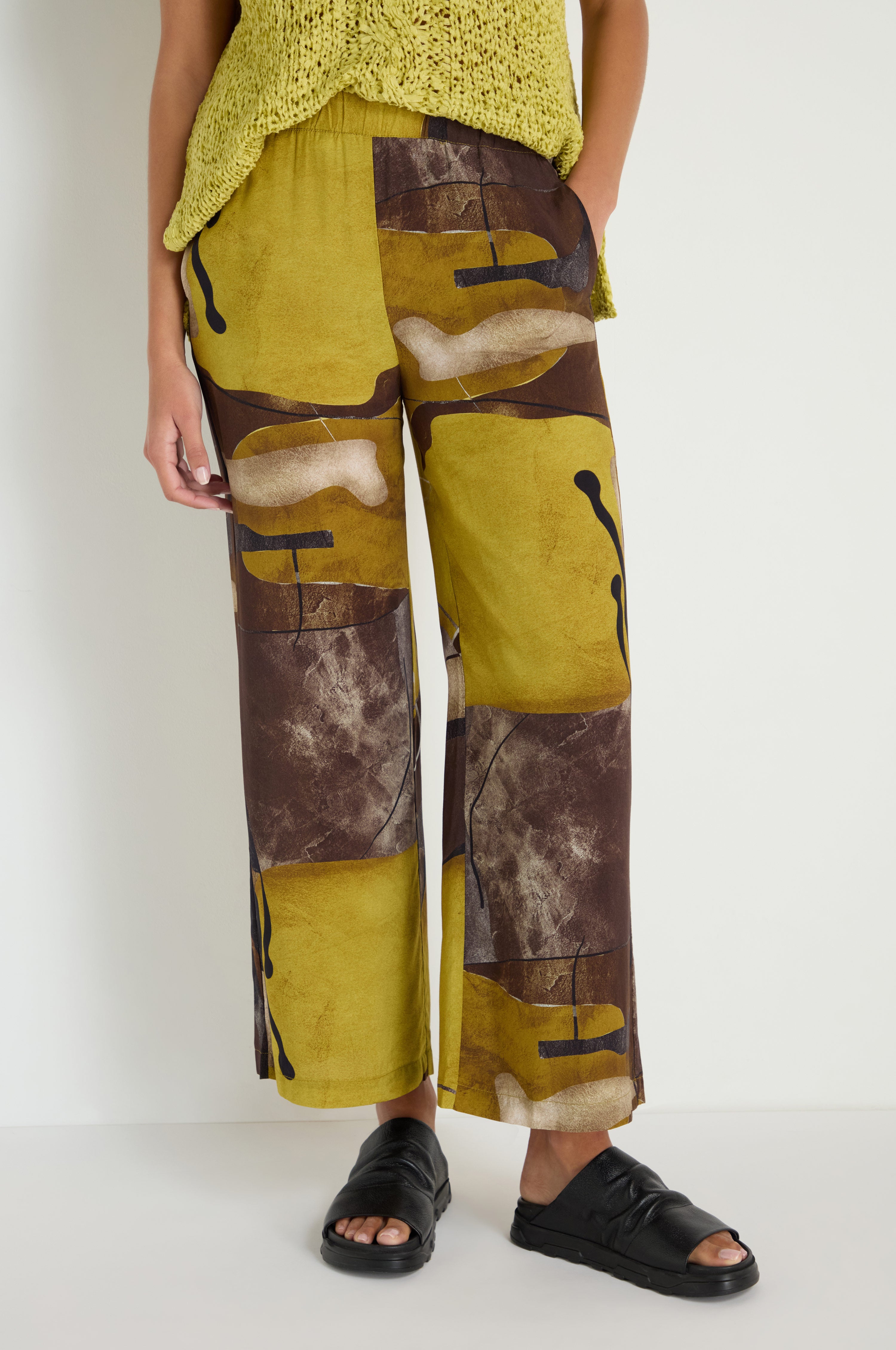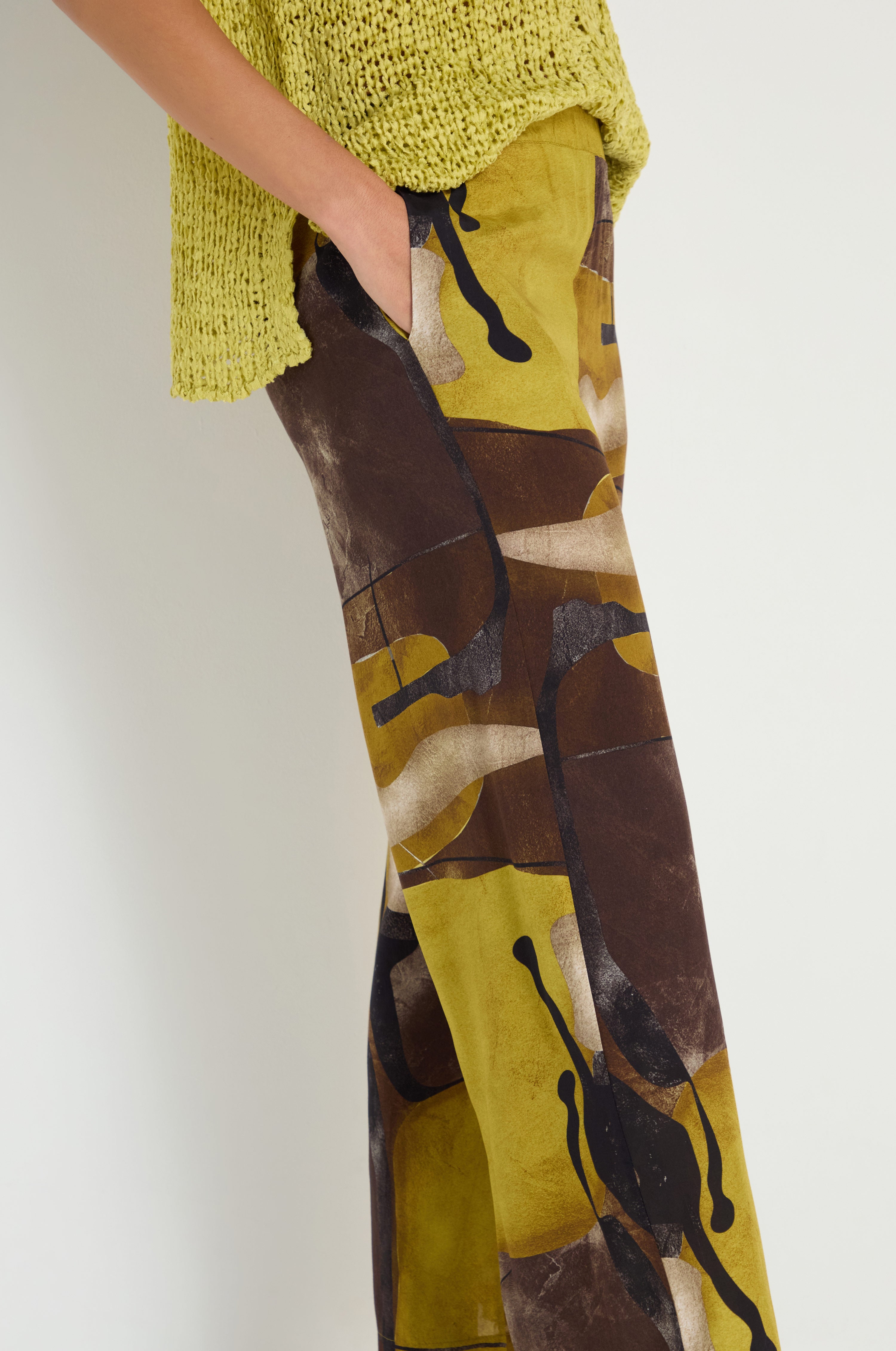 The Naya Abstract Print Trousers bring statement print into a relaxed, easy silhouette. The silky viscose allows the bold pattern to fall naturally through the leg, creating movement while maintaining a soft, effortless feel.