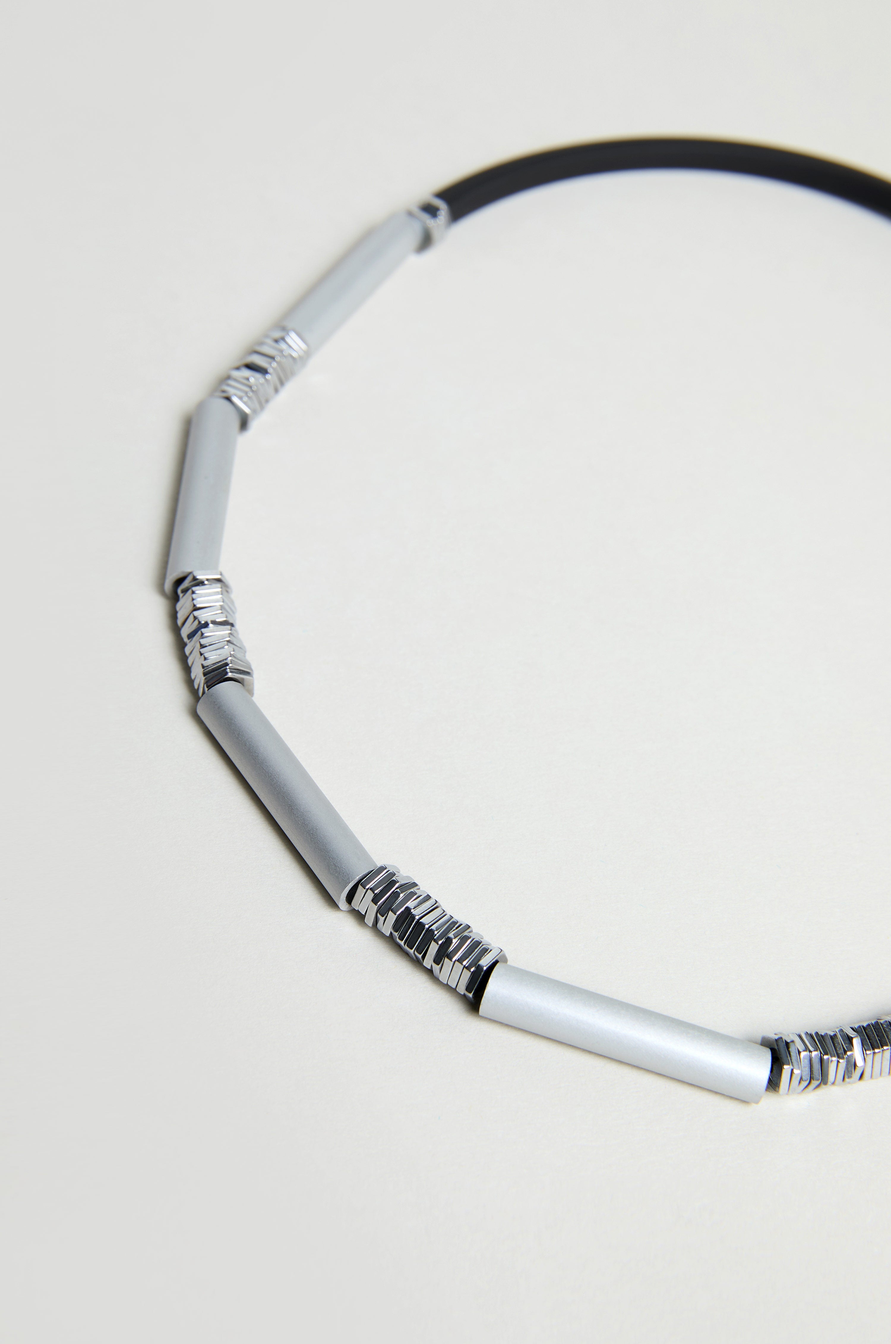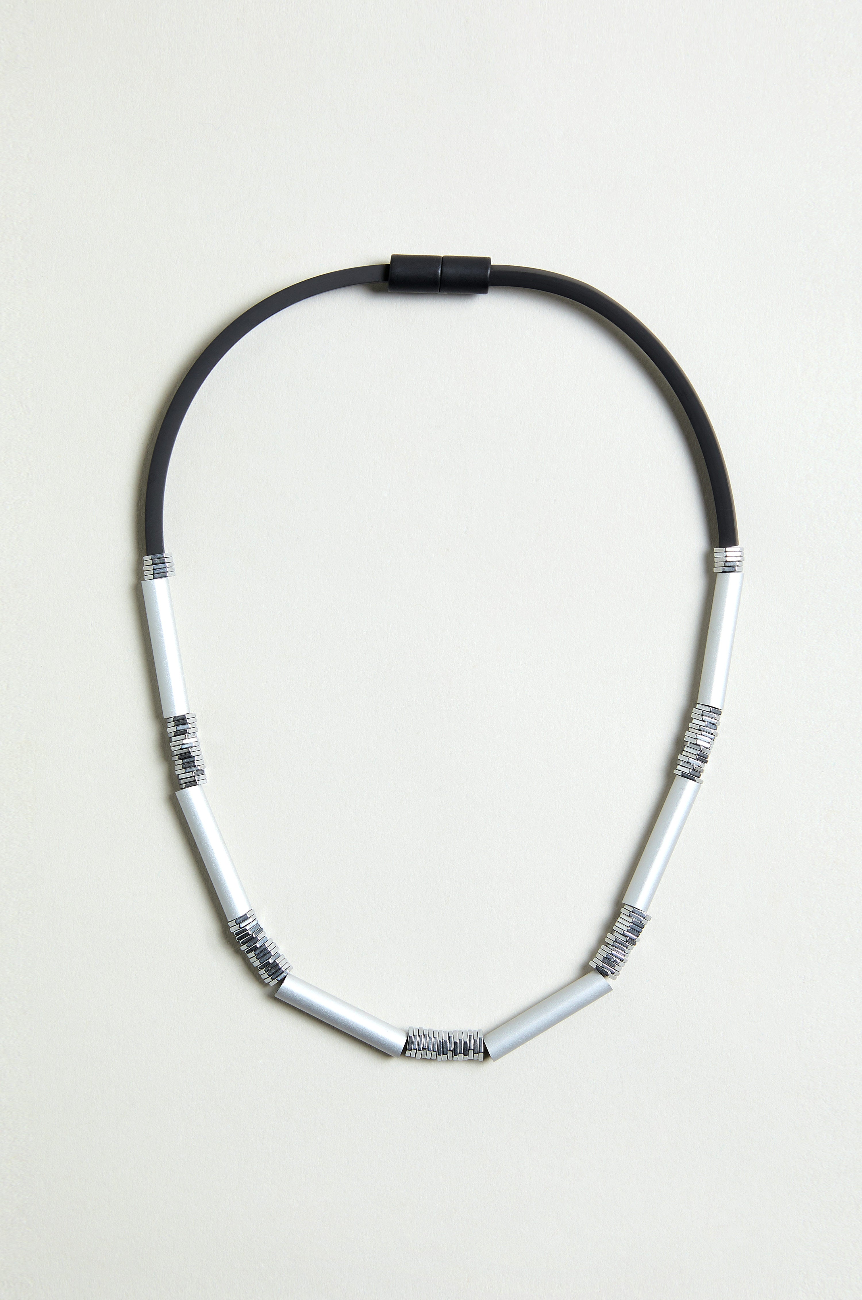 The Christina Brampti Multicolour Aluminium and Rubber Necklace is a sculptural piece that plays with contrast and form. A smooth rubber cord sets a clean foundation for alternating anodised aluminium tubes, punctuated with polished hematite spacers for subtle light play. Contemporary and architectural, it adds a modern edge to simple knits and monochrome looks.