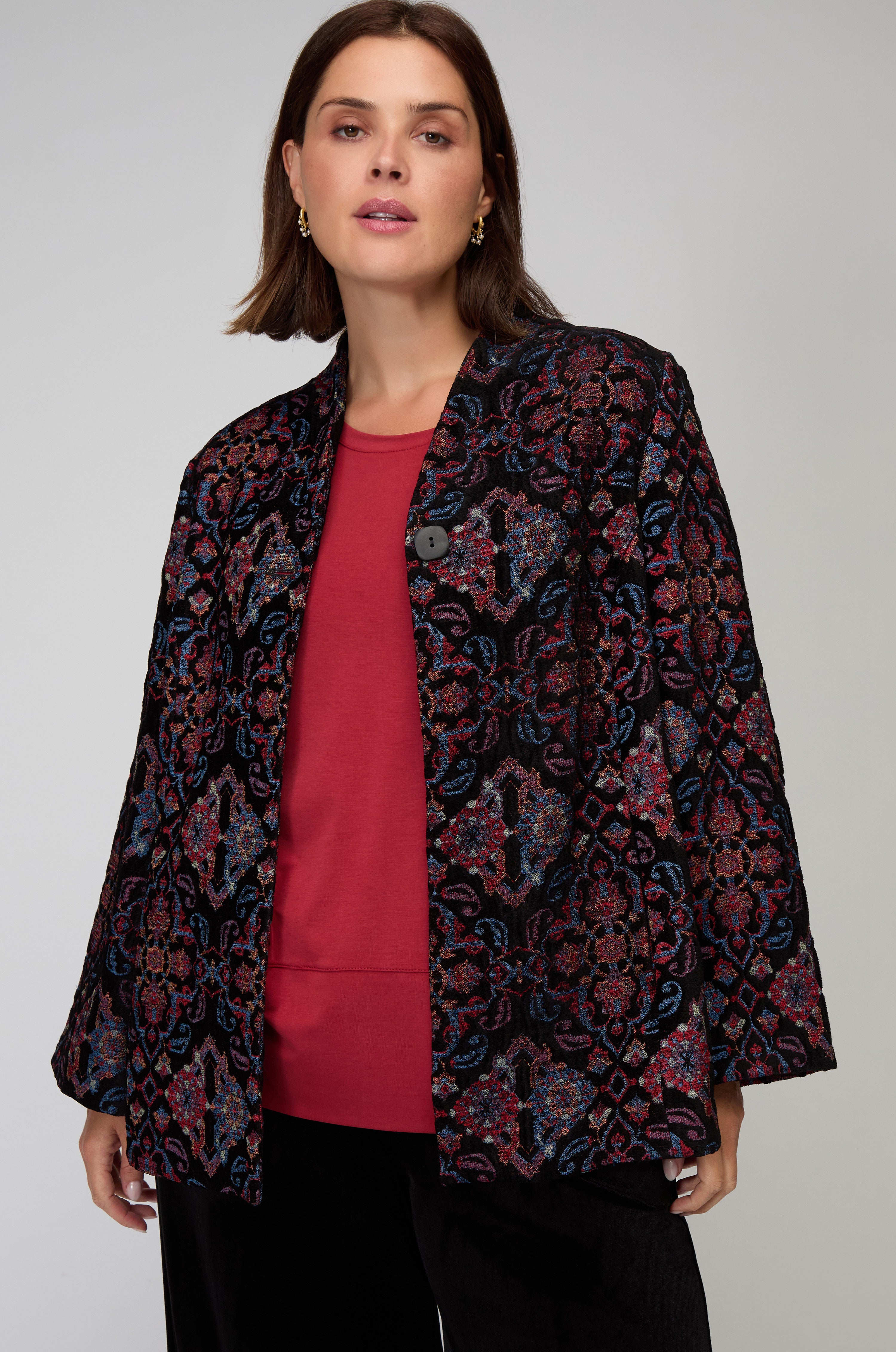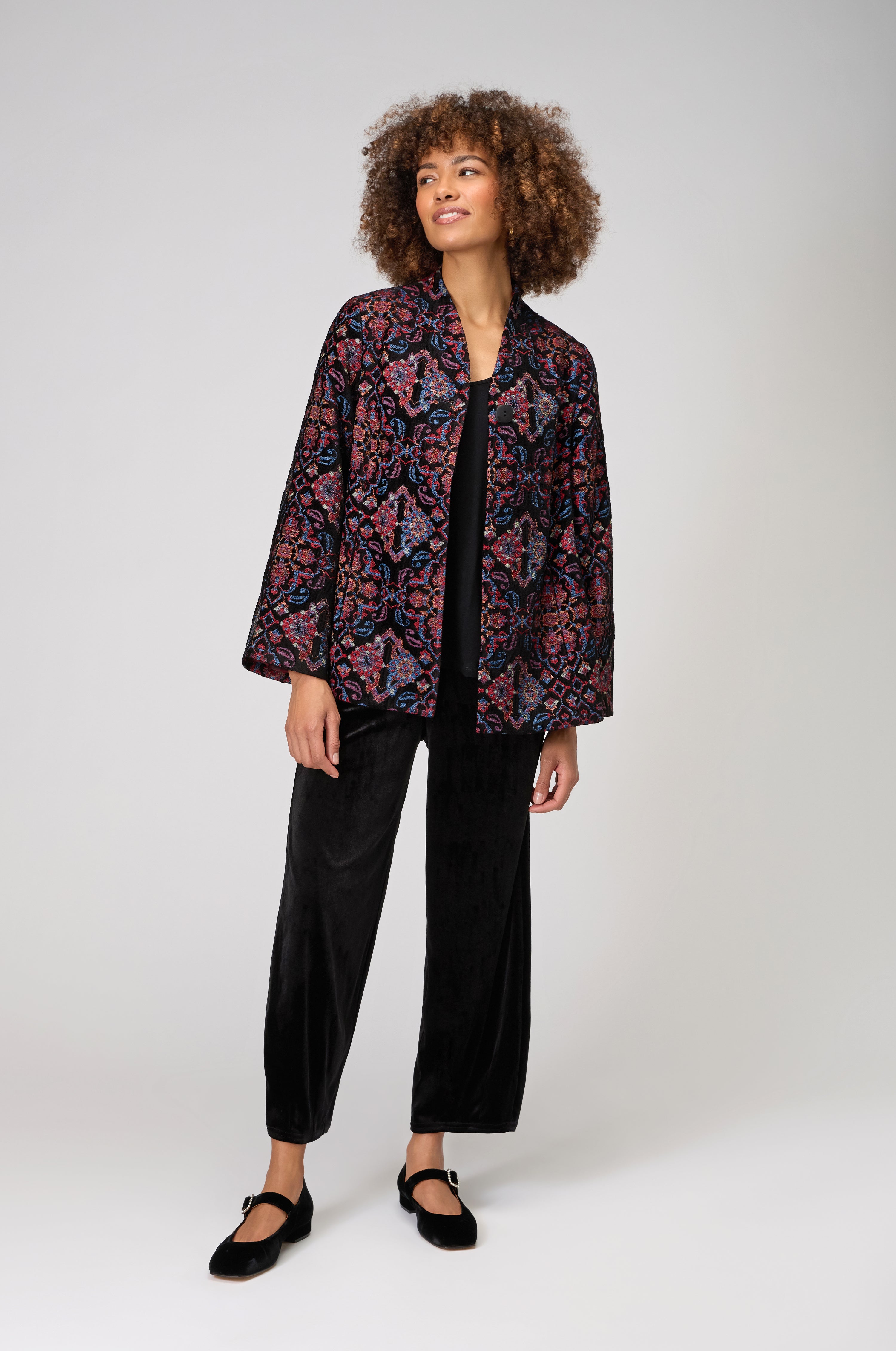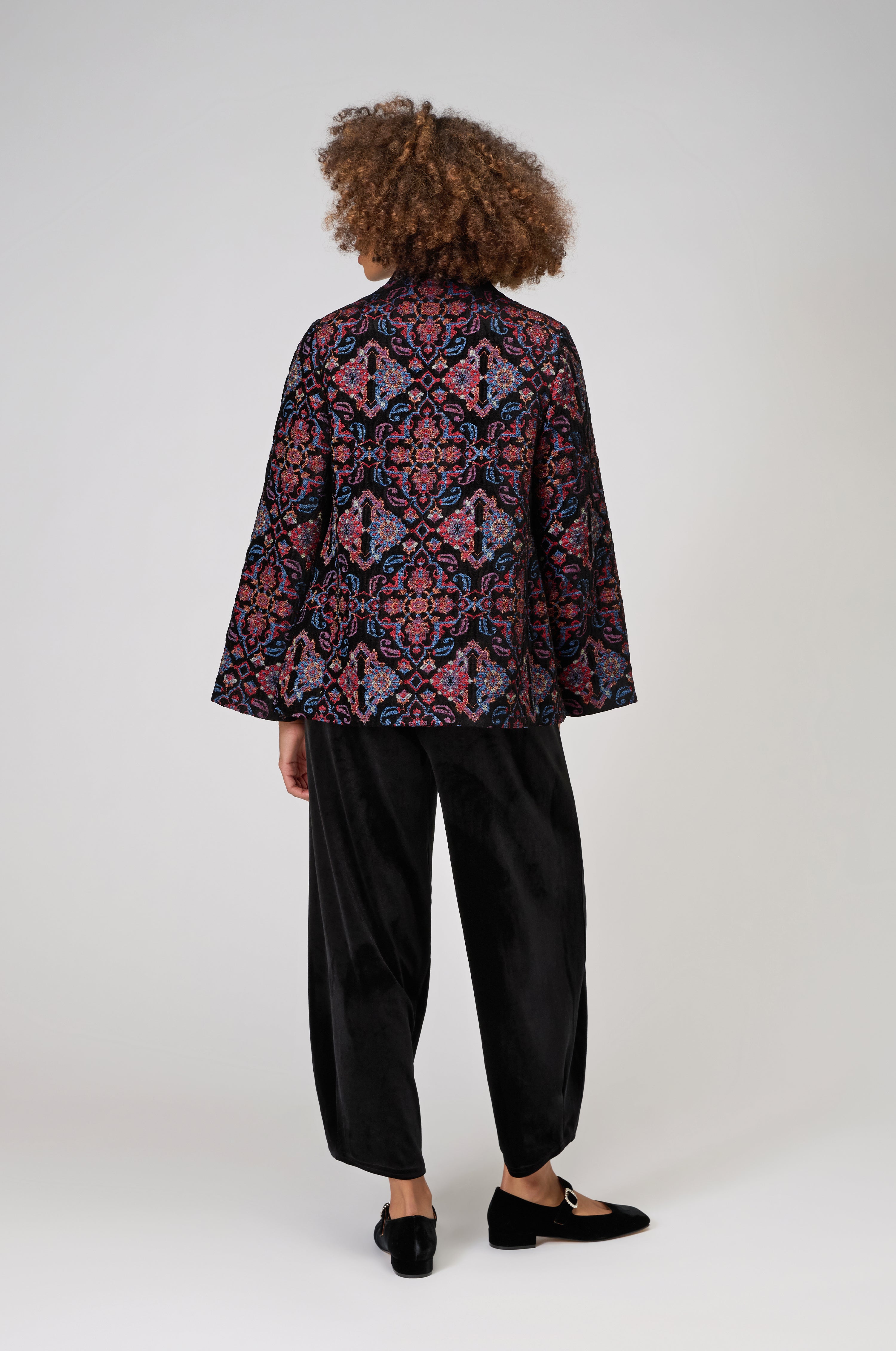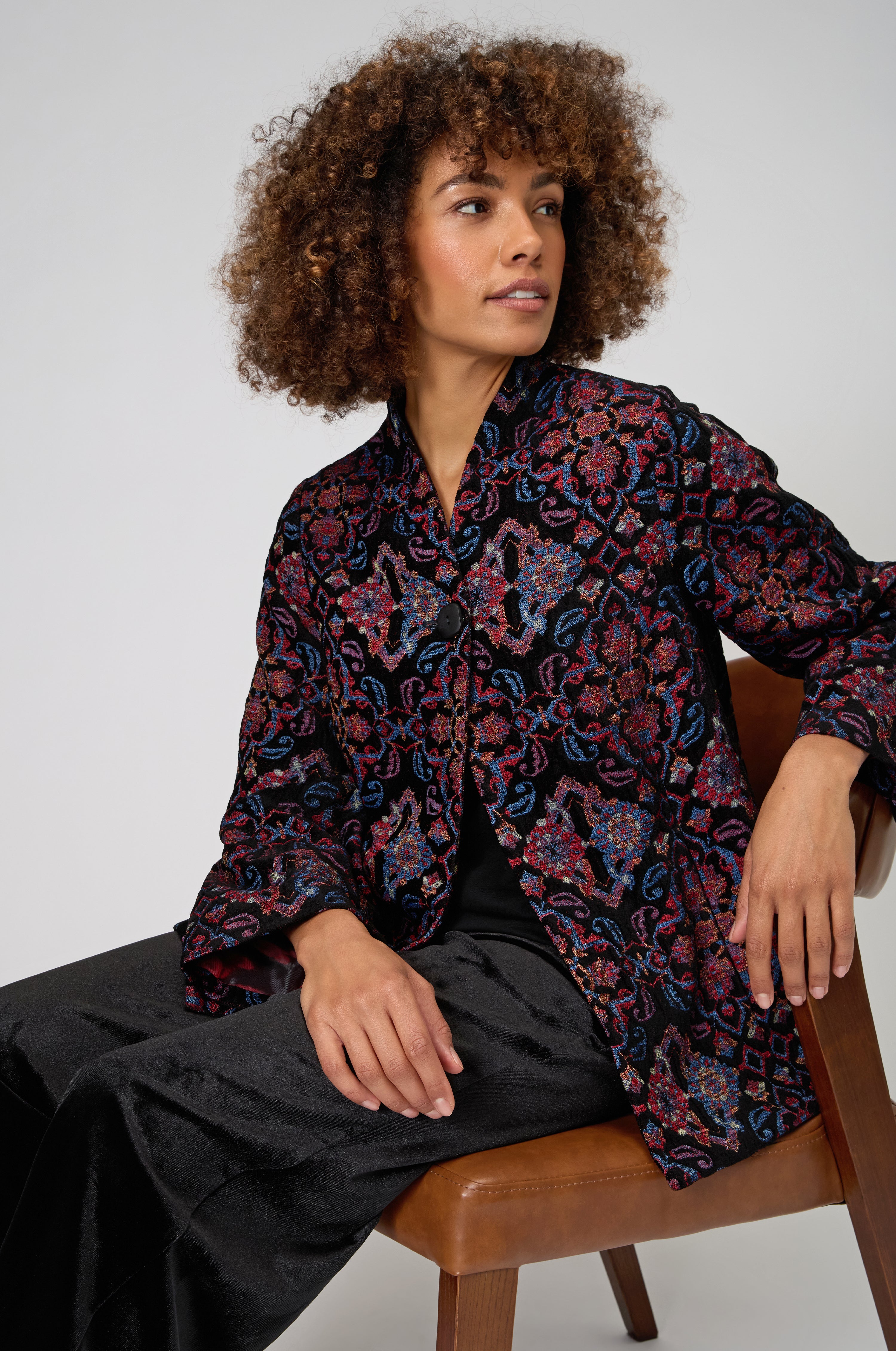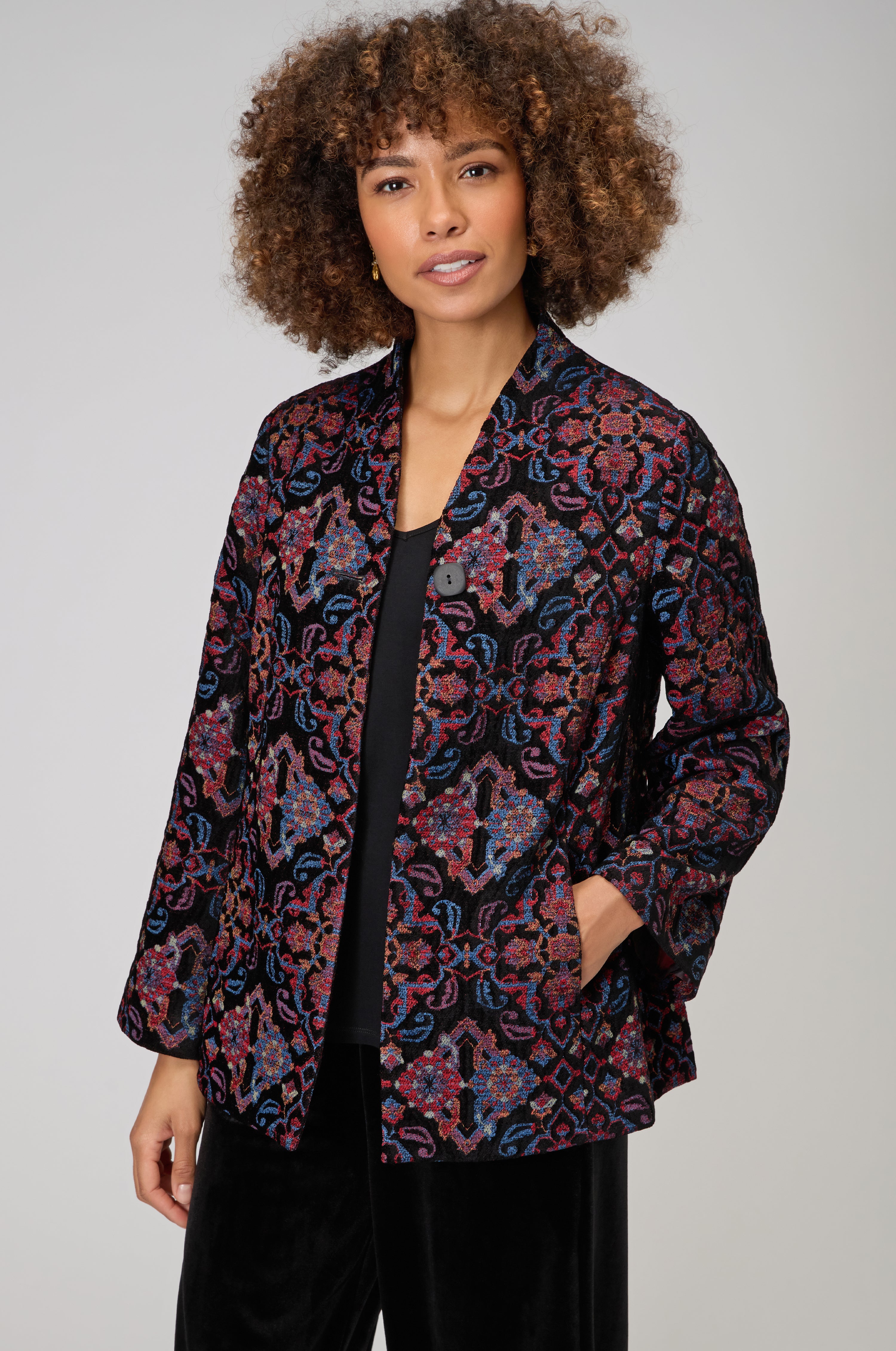 The Sahara Baroque Chenille Jacket is woven with ornate detailing that recalls the grandeur of baroque textiles. Crafted from plush chenille, the jacket has a luxurious handfeel and a subtle sheen that catches the light as it moves. The rich multi-hued pattern creates depth and drama, while the clean cut — with straight lines, a single button fastening, and discreet pockets — balances opulence with wearability.