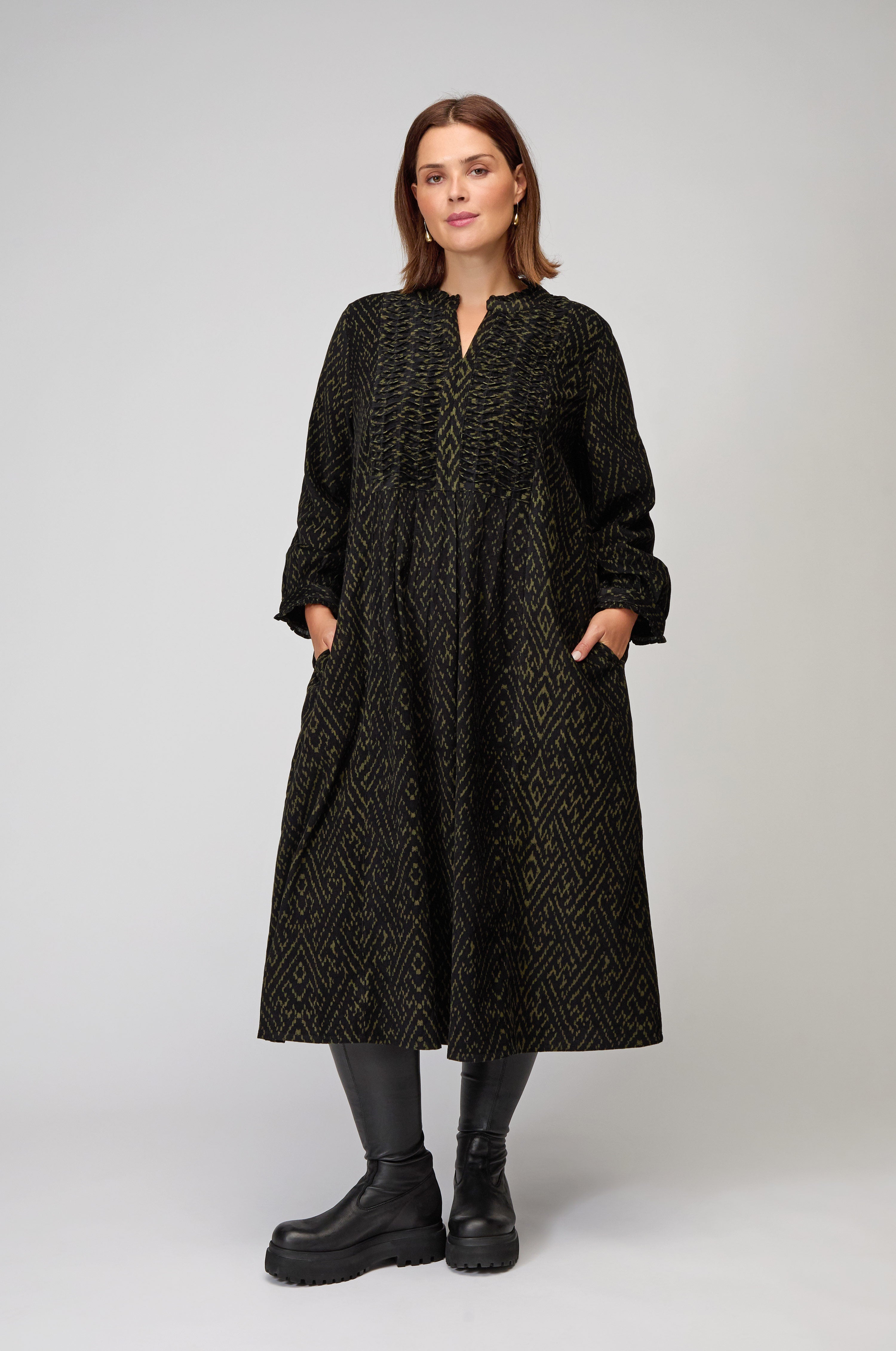 The Sahara Ornate Textured Cord Dress is crafted from tactile cord with an intricate all-over design in black and khaki. The fabric’s unique surface detail creates depth and richness, while the relaxed silhouette ensures comfort and ease of wear. Subtle seaming and a flattering cut make this dress a statement piece for the season.