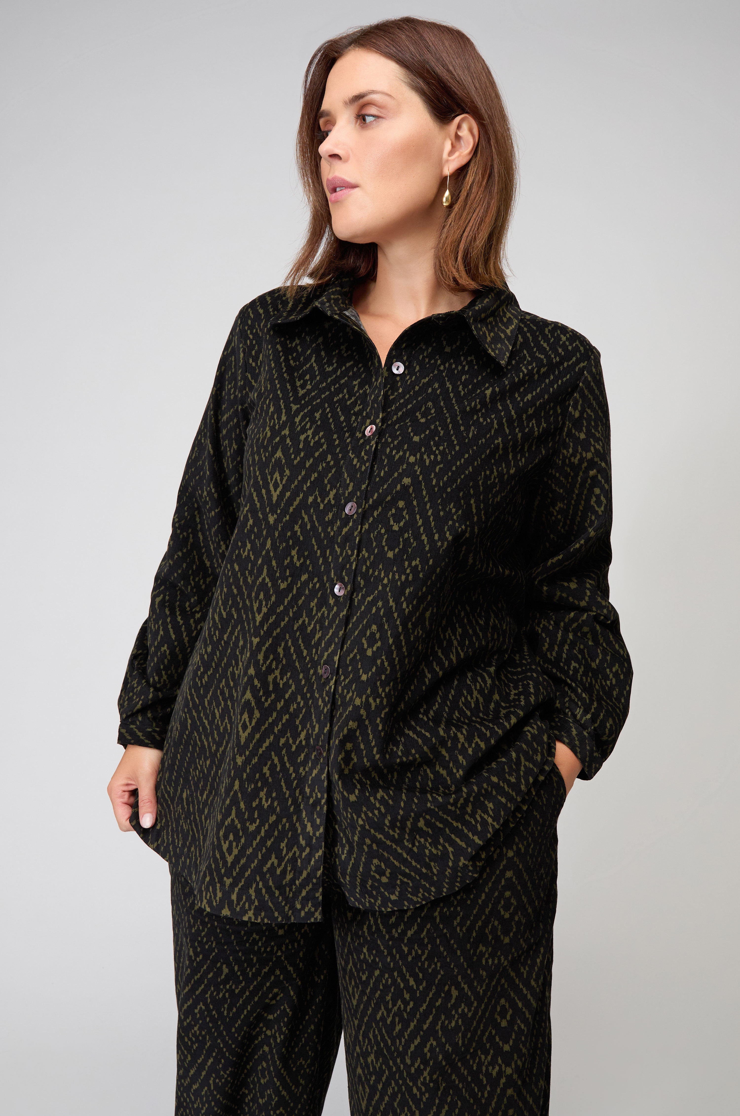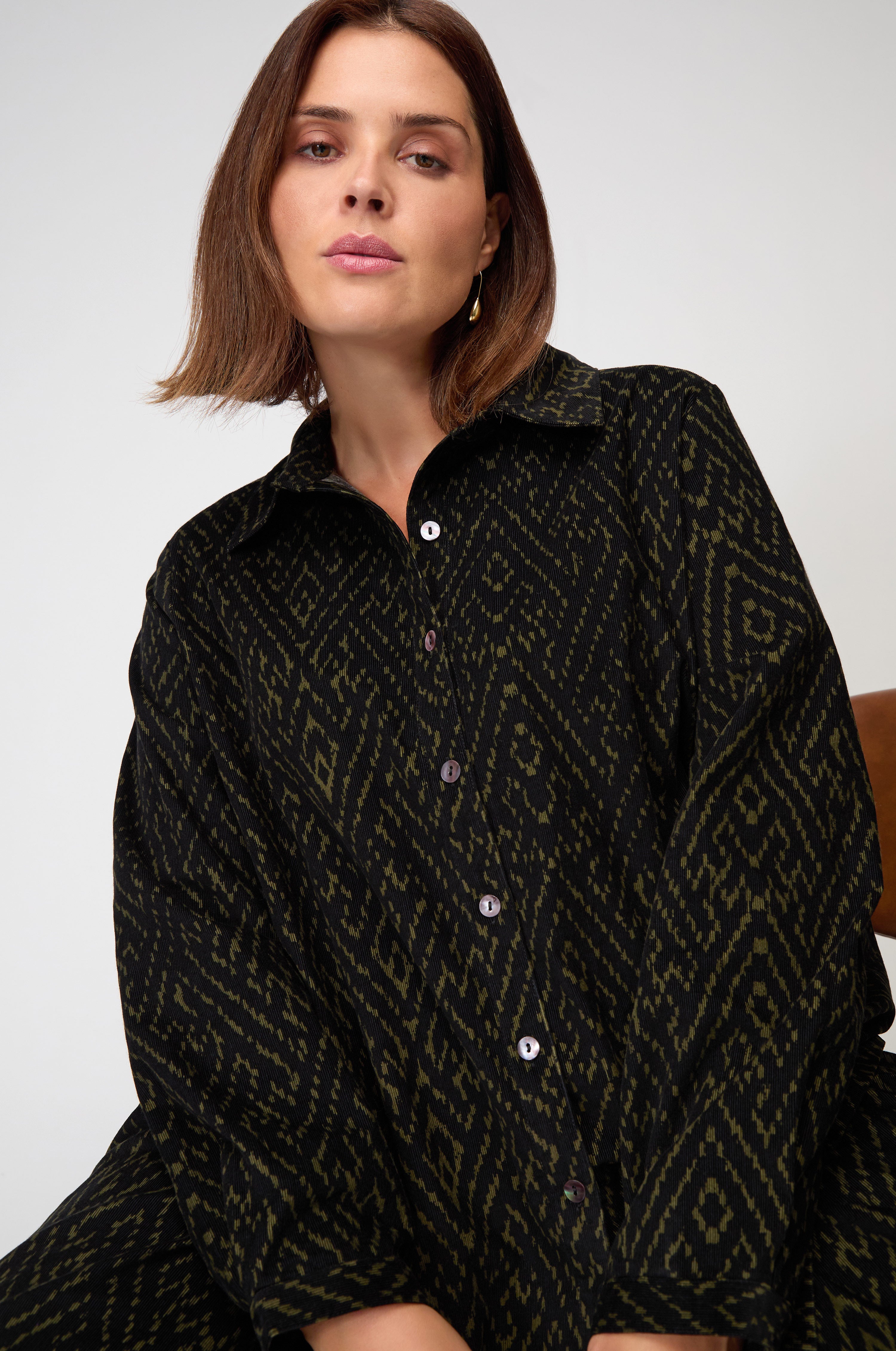 The Sahara Ornate Textured Cord Shirt reimagines a classic shape in richly detailed cord. The black and khaki palette highlights the ornate print, while the relaxed fit ensures effortless wear. Finished with a button front and soft collar, this shirt is both striking and easy to style.