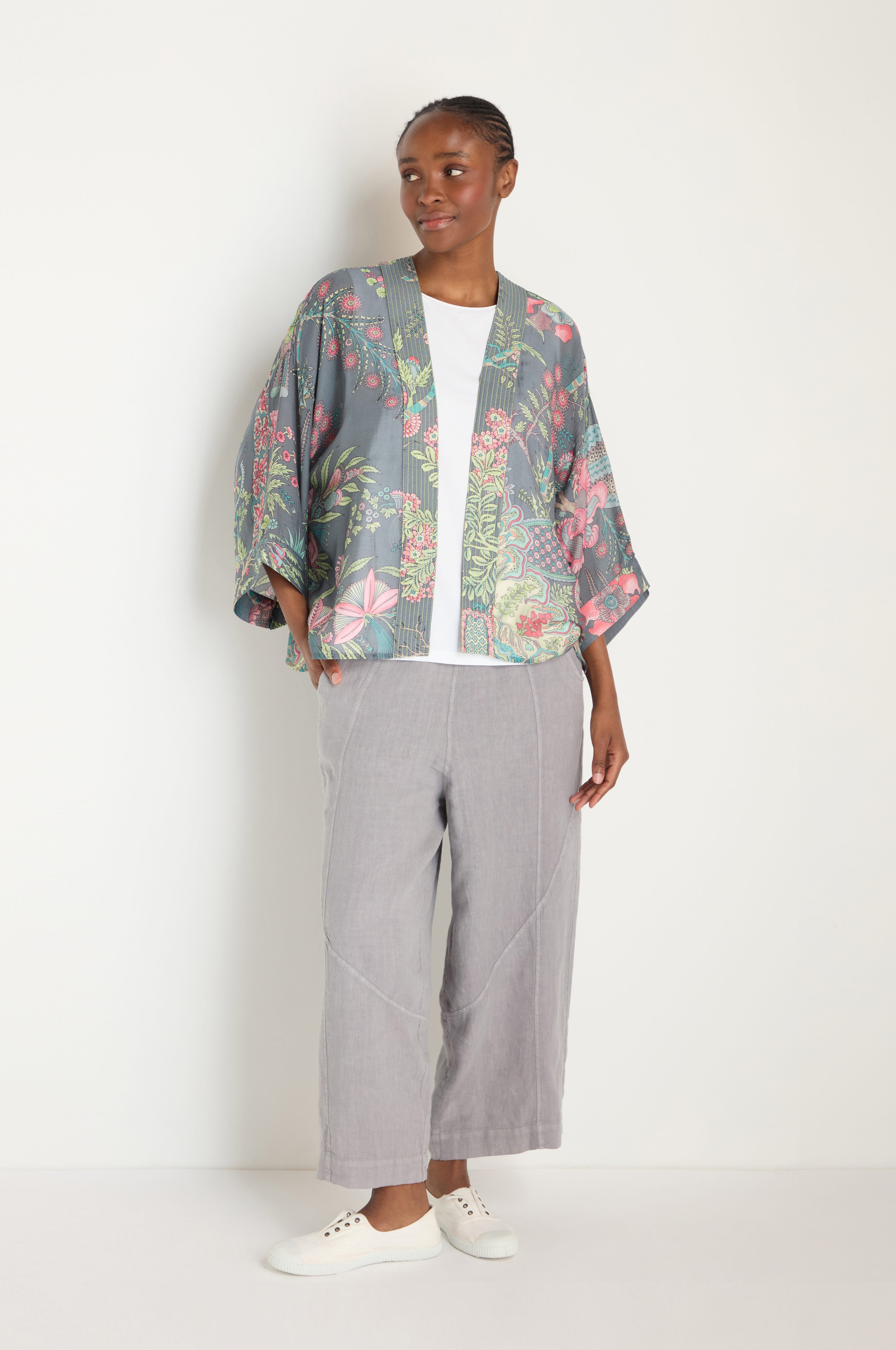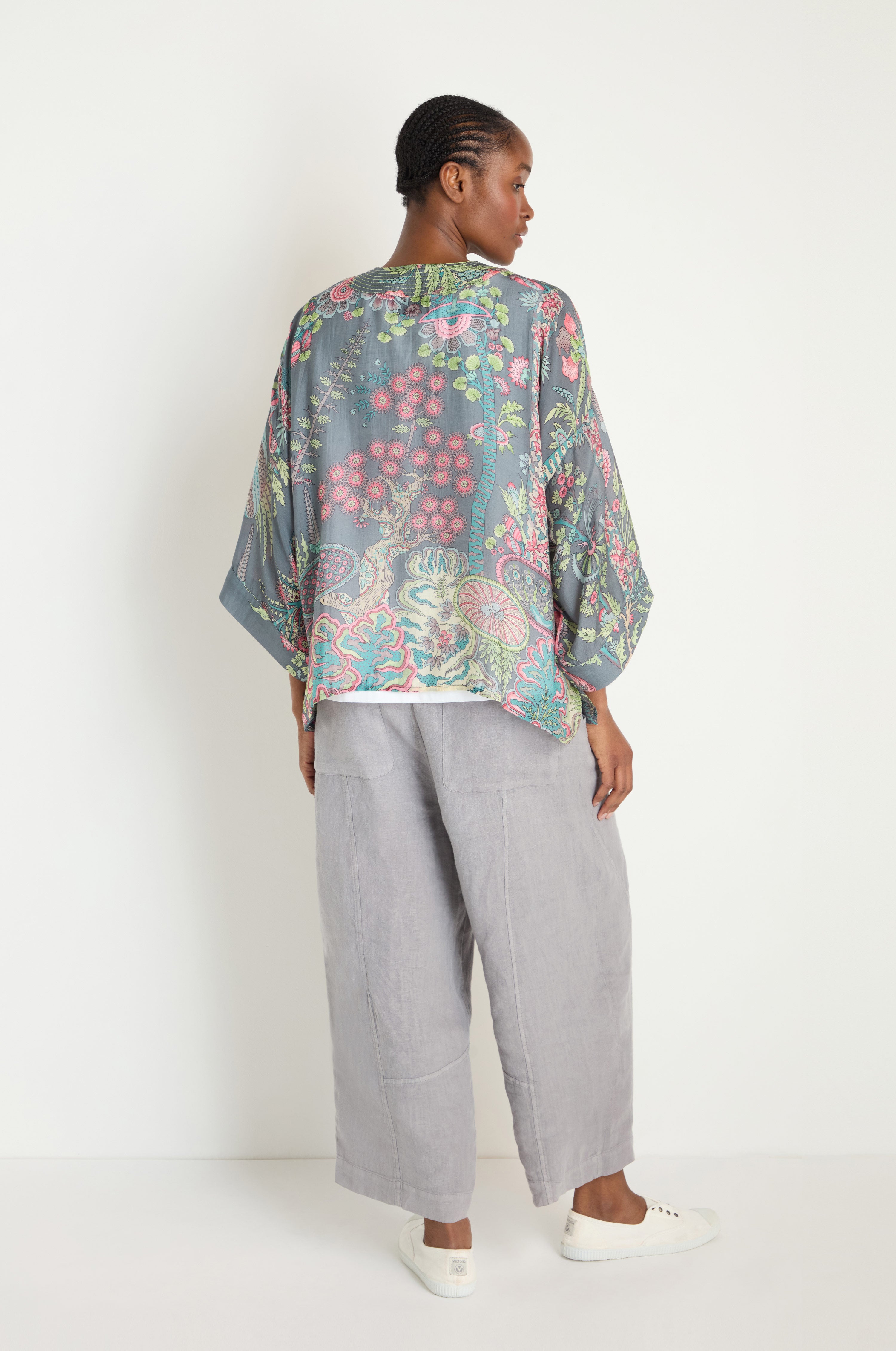 One Hundred Stars Boho Garden Print Kimono showcases the label’s mastery of archive-inspired pattern, known for its richness and fine detail. The print feels almost illustrative in quality, with carefully placed foliage and floral forms that reward close looking, all set against a smoky grey backdrop that keeps the overall effect balanced and refined.