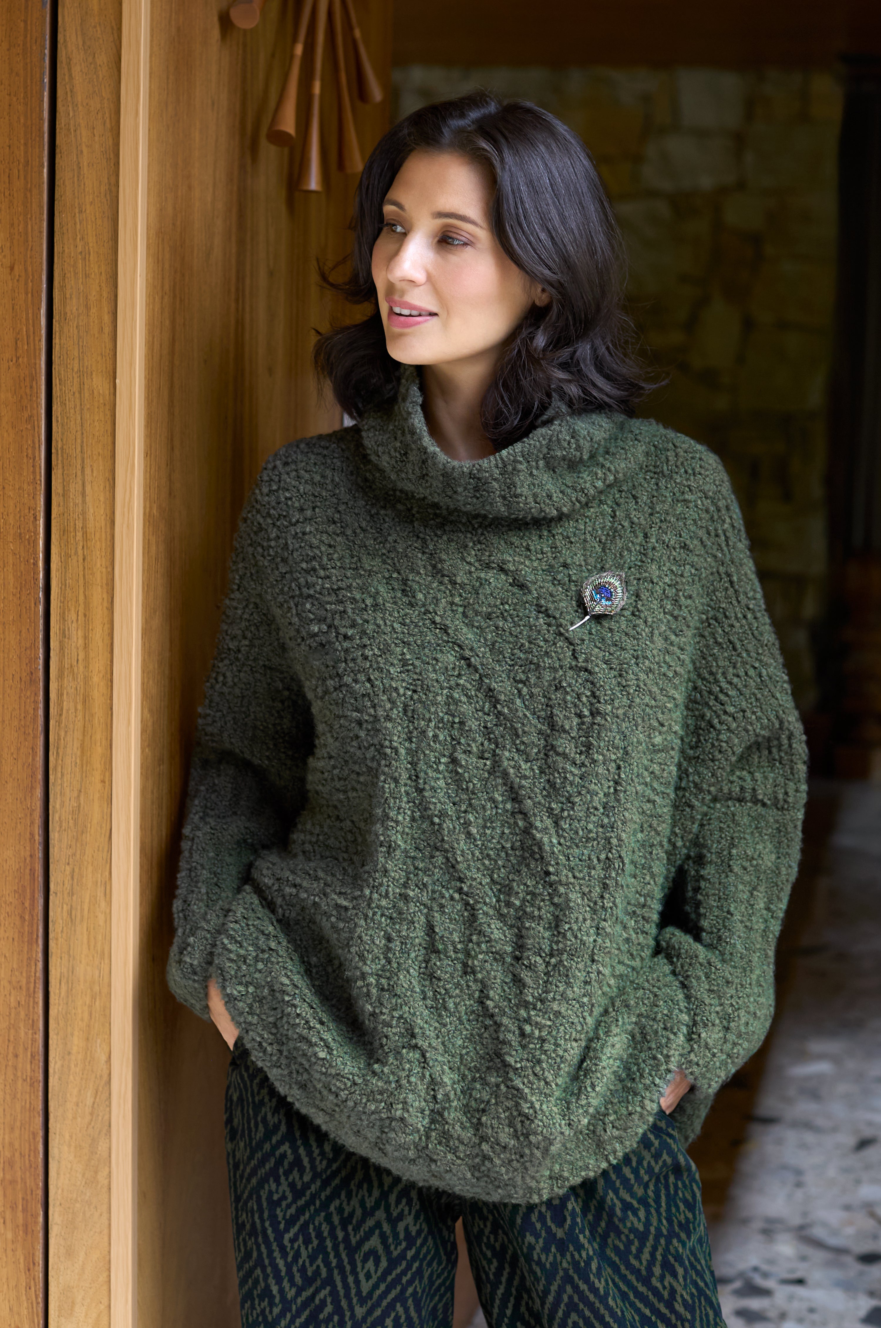 The Sahara Bouclé Cable Knit Jumper in khaki offers a fresh interpretation of classic knitwear. Woven from soft bouclé yarn, the jumper has a beautifully tactile finish, with loops of yarn giving the surface a rich, textural quality. The intricate cable pattern creates a sculptural effect, running through the body and sleeves with rhythmic precision. The relaxed silhouette, complete with dropped shoulders and gently ribbed trims, ensures comfort while maintaining a refined shape.