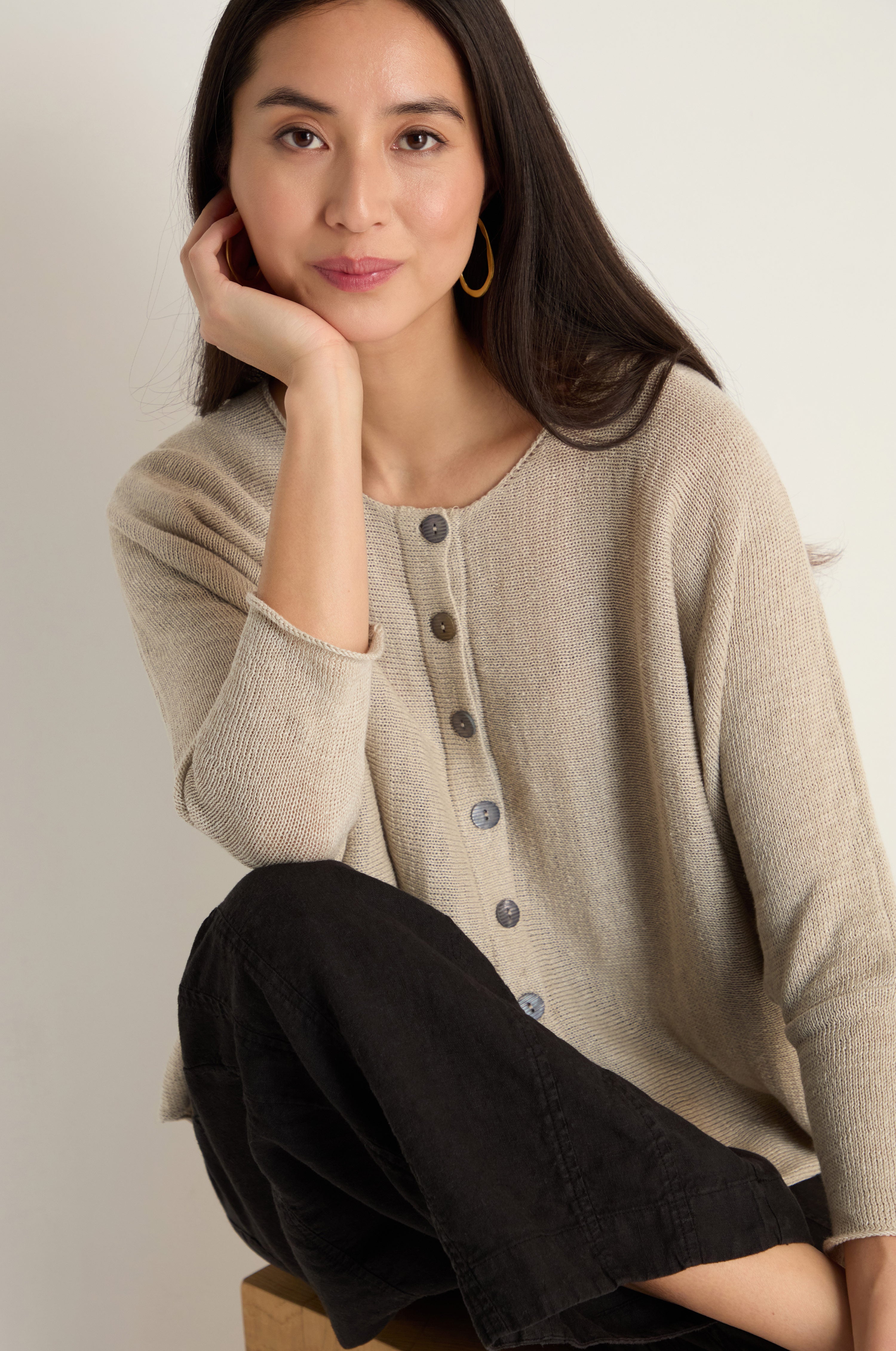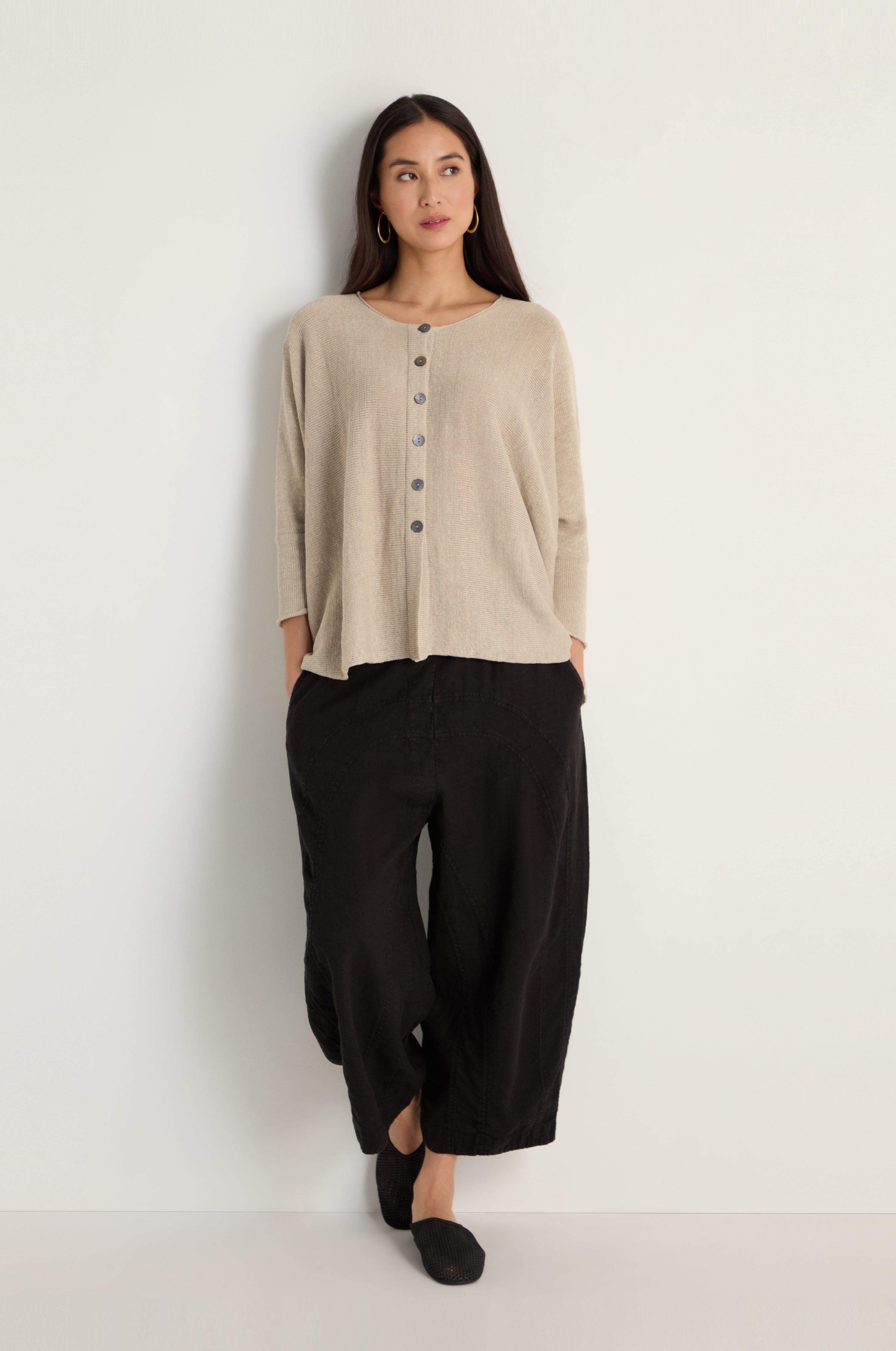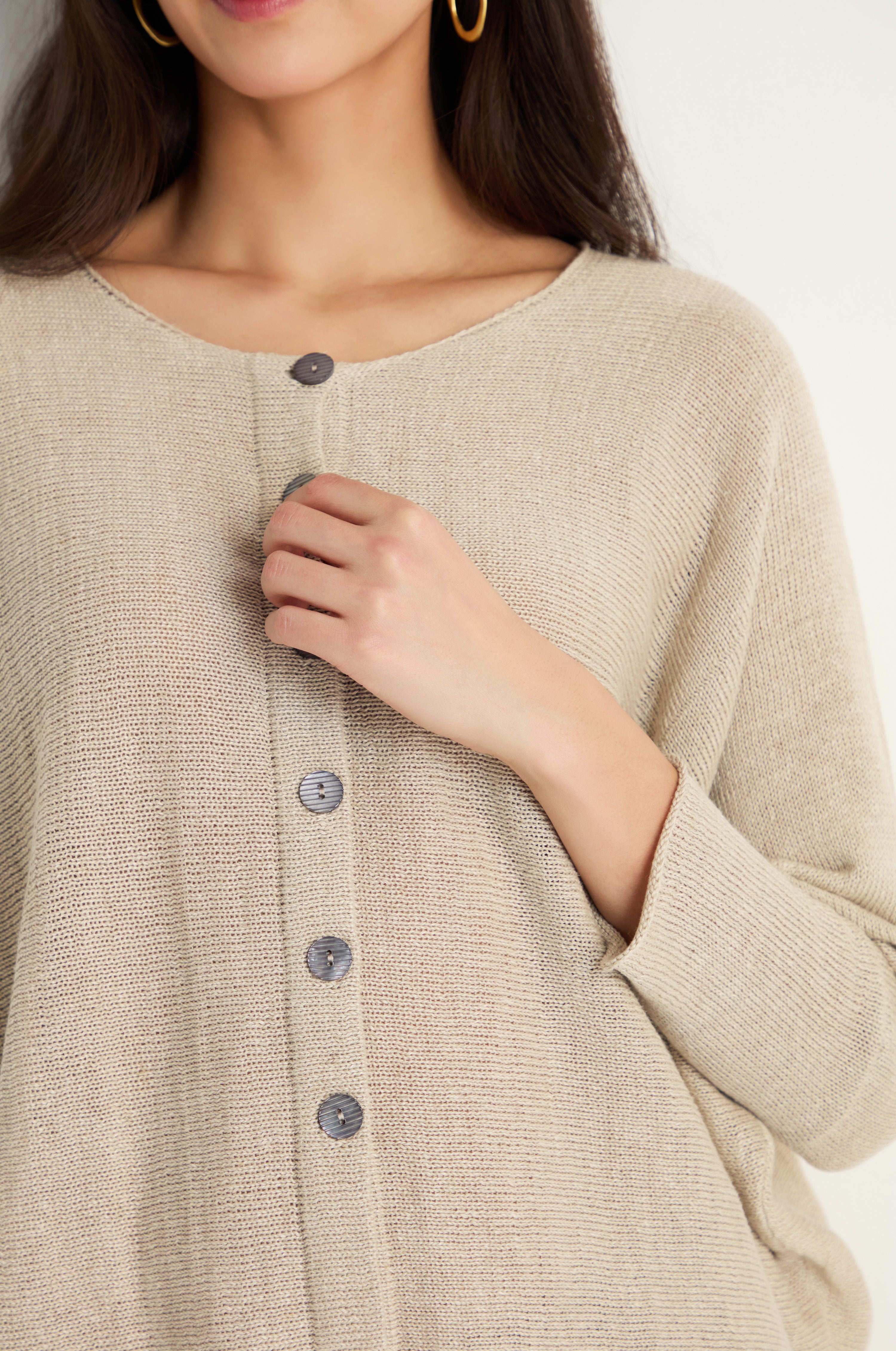Grizas' Boxy Linen Button Cardigan is a luxe, lightweight layering piece designed with relaxed proportions and an easy, everyday feel. The open-knit structure and simple button front make it a versatile option for layering over dresses, tops, and trousers.