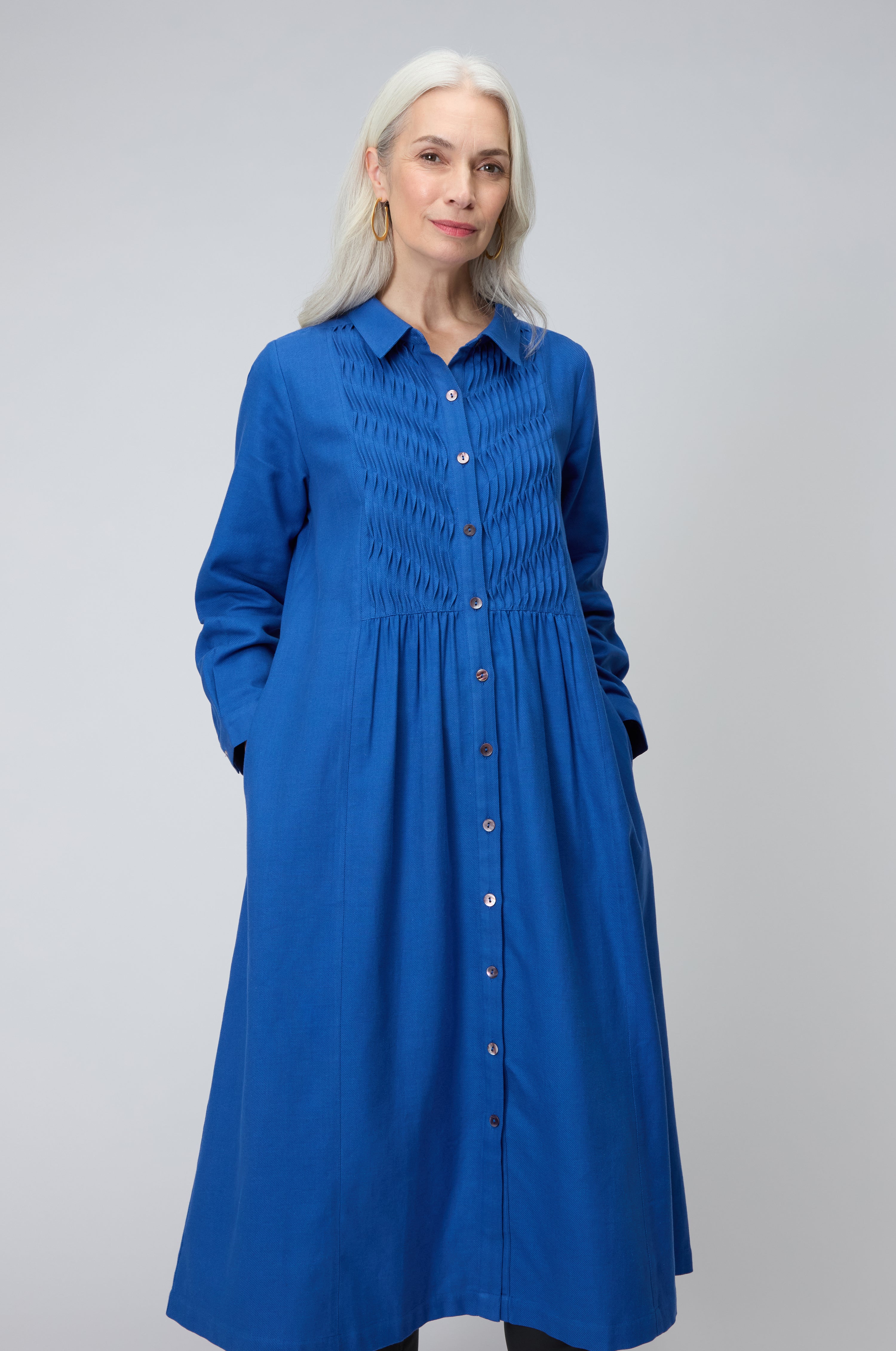 The Sahara Brushed Cotton Pintuck Detail A-Line Dress captures the elegance of structure in a fabric that feels naturally soft to the touch. Made from 100% cotton flannel with a brushed surface, it has a gentle velvety finish that drapes with quiet grace. The button-through front and classic collar are complemented by fine pintuck pleats through the bodice, creating subtle movement and texture. Full-length sleeves, side seam pockets, and delicate shell buttons complete the considered detailing.