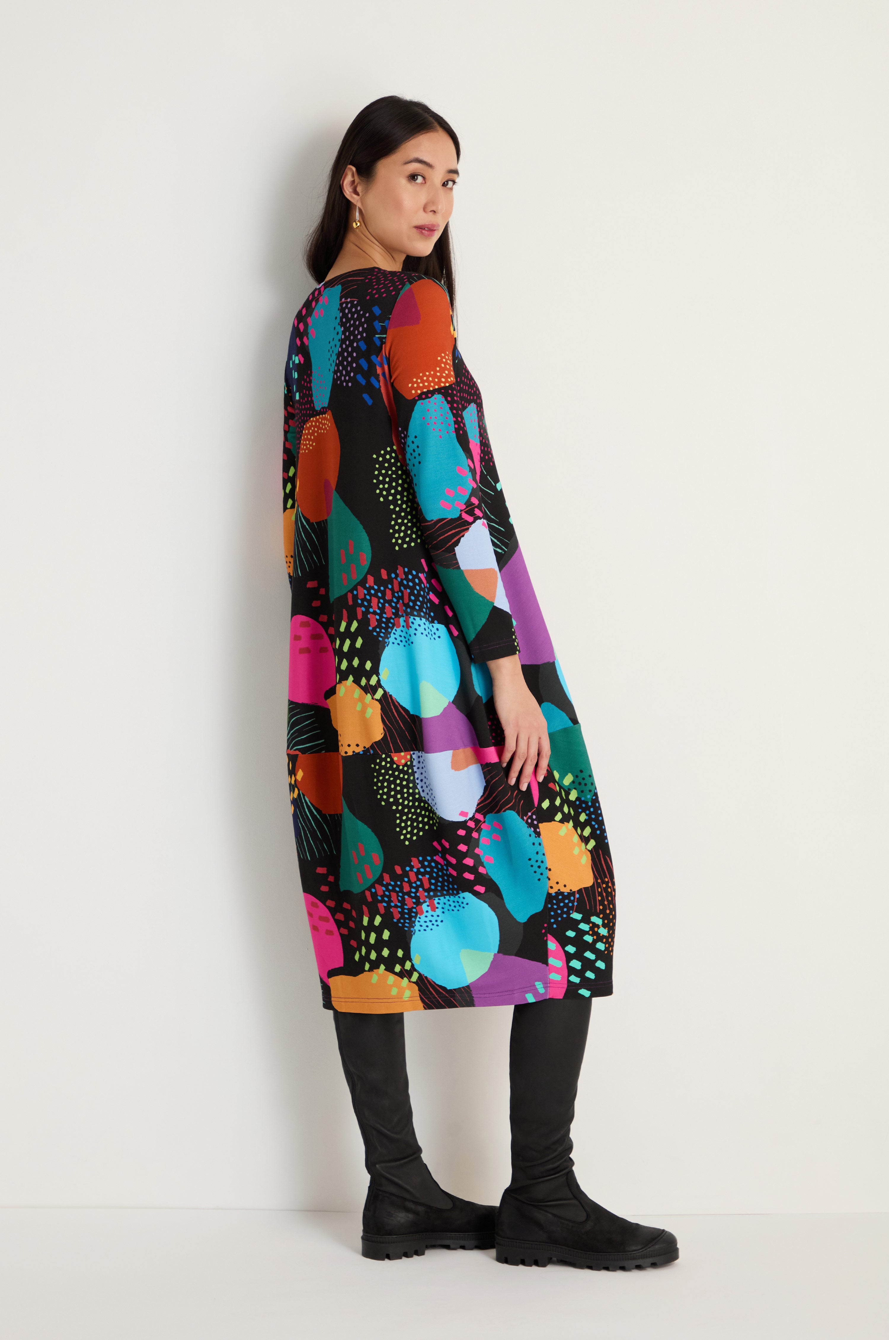 The Sahara Colour Play Print Jersey Bubble Dress brings colour and movement to everyday dressing, combining a bold printed surface with a softly draped silhouette. Designed for comfort and joyful impact, it is an easy statement piece with a relaxed, wearable feel.