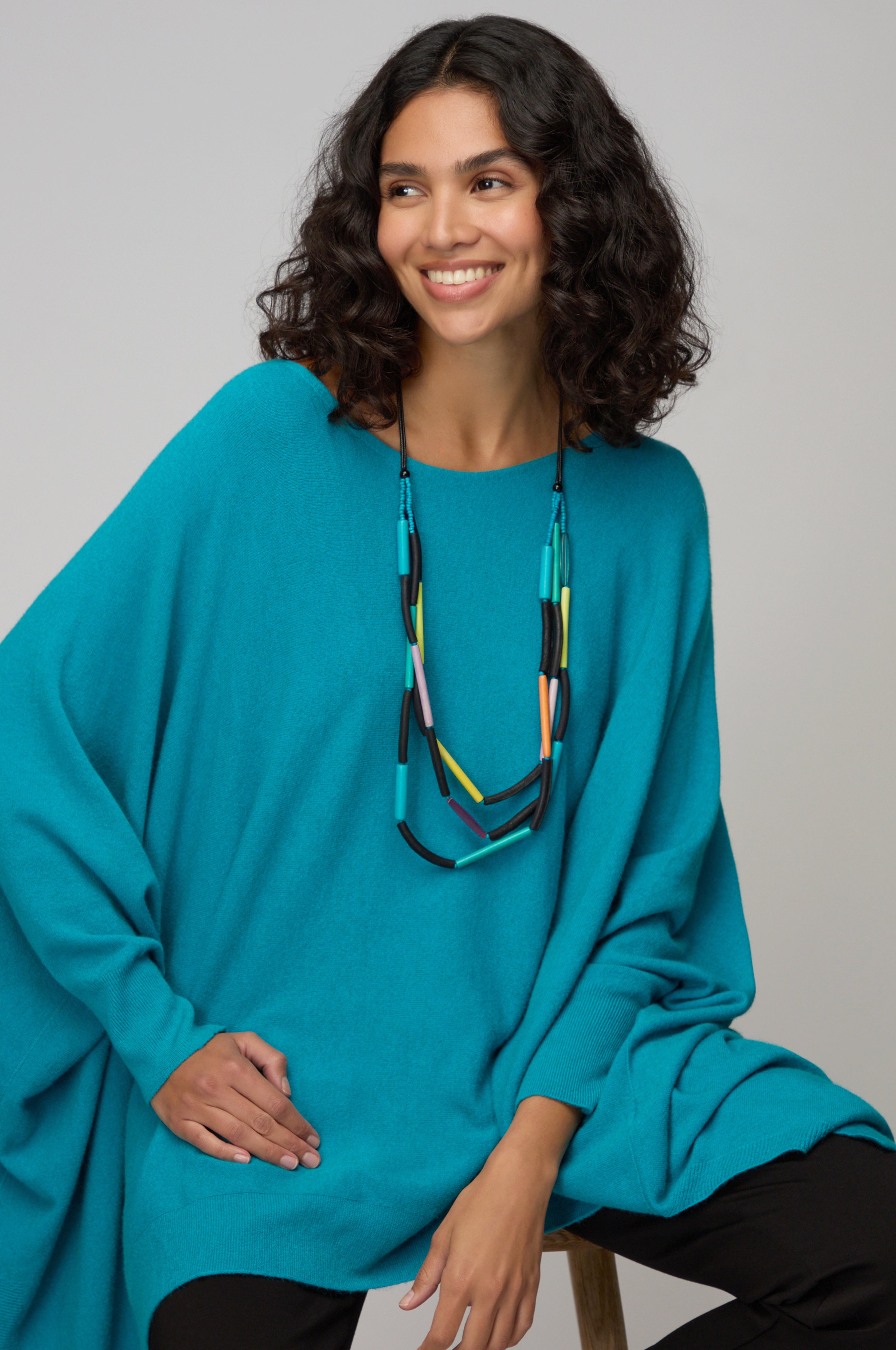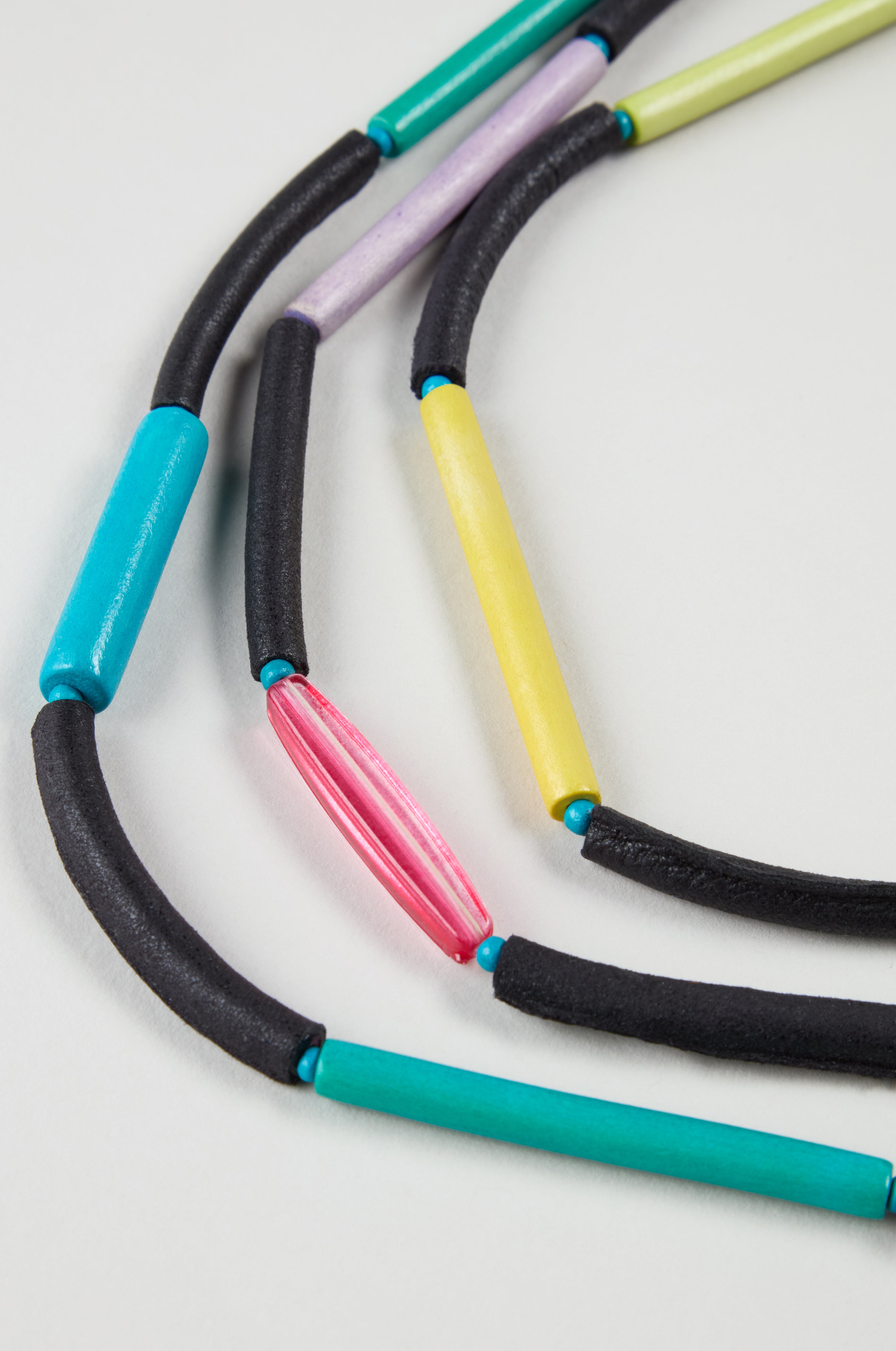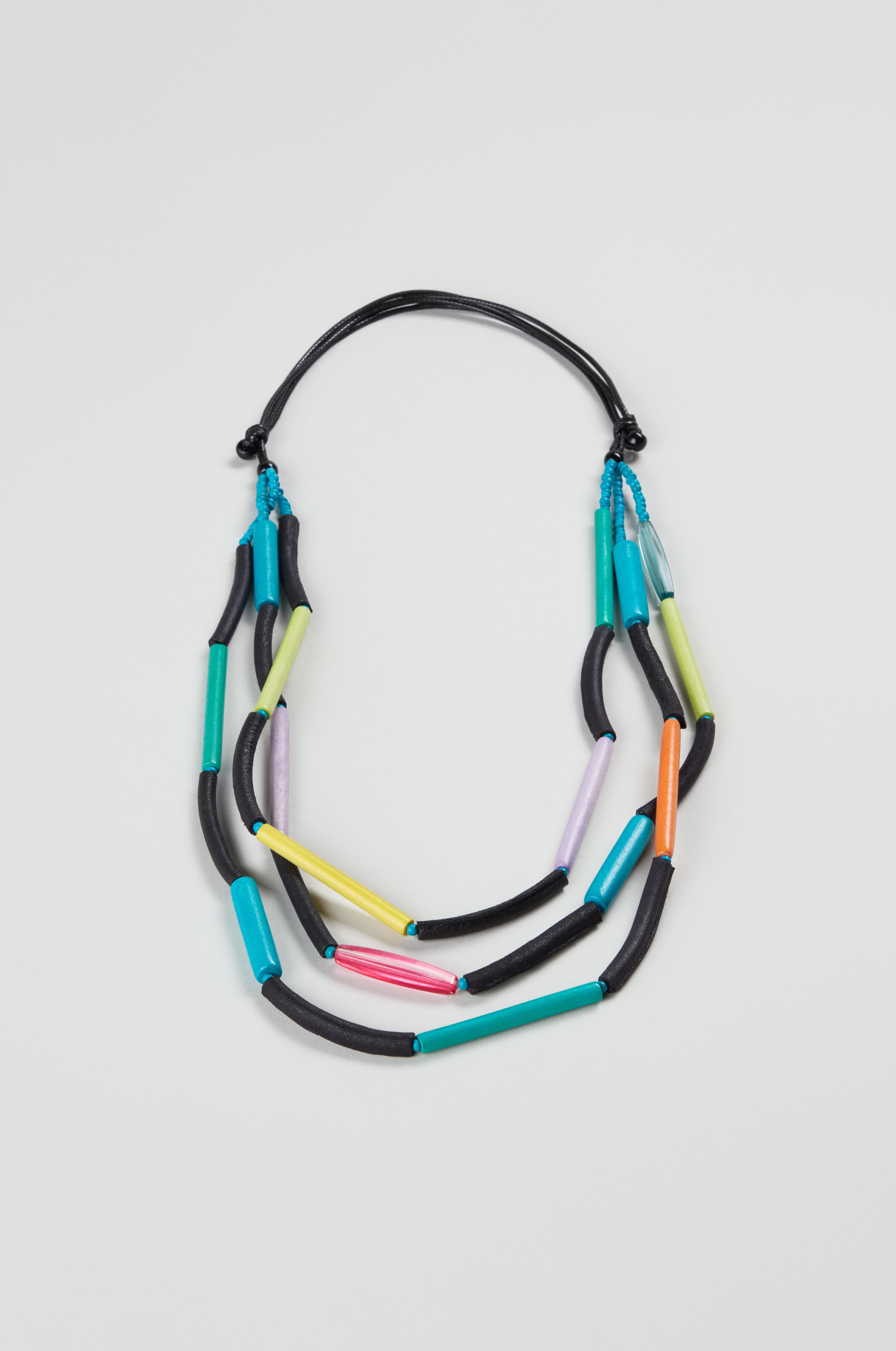 The Sahara Colourful Cylinders Necklace combines sculptural form with vibrant detailing. A series of cylindrical beads in black and multi-coloured tones are strung along a longline chain, creating a rhythmic pattern that feels both graphic and contemporary. The mixed palette gives it a playful versatility that layers easily with prints or textured fabrics.
