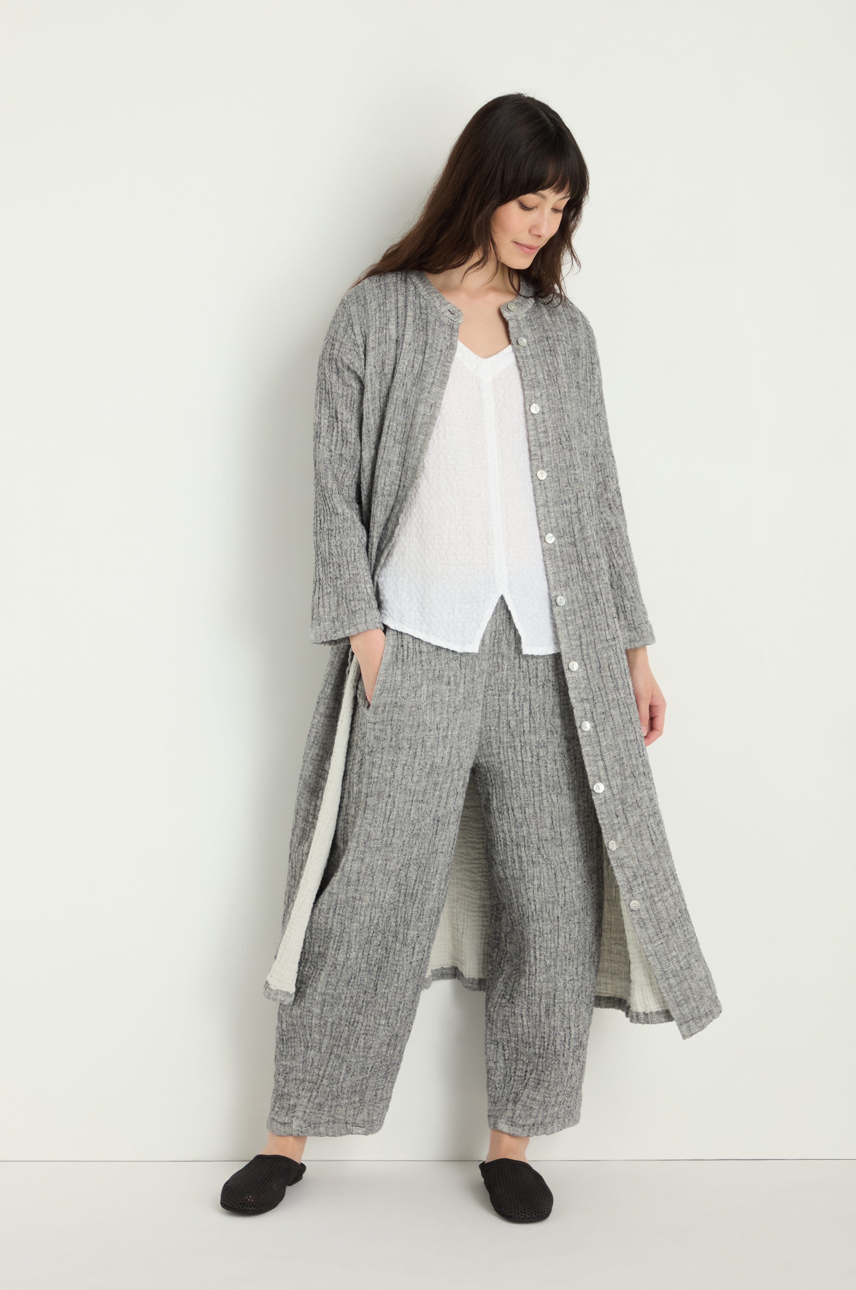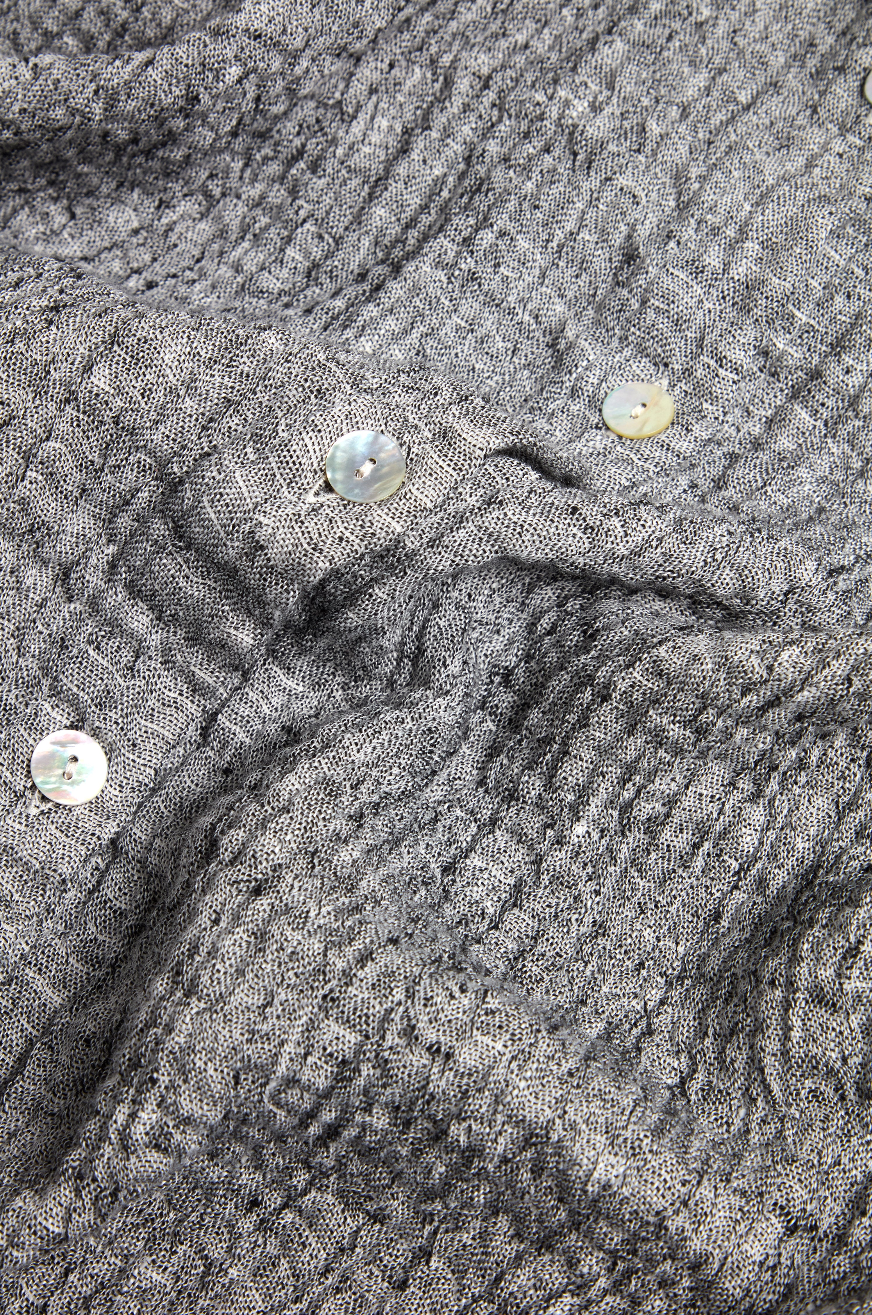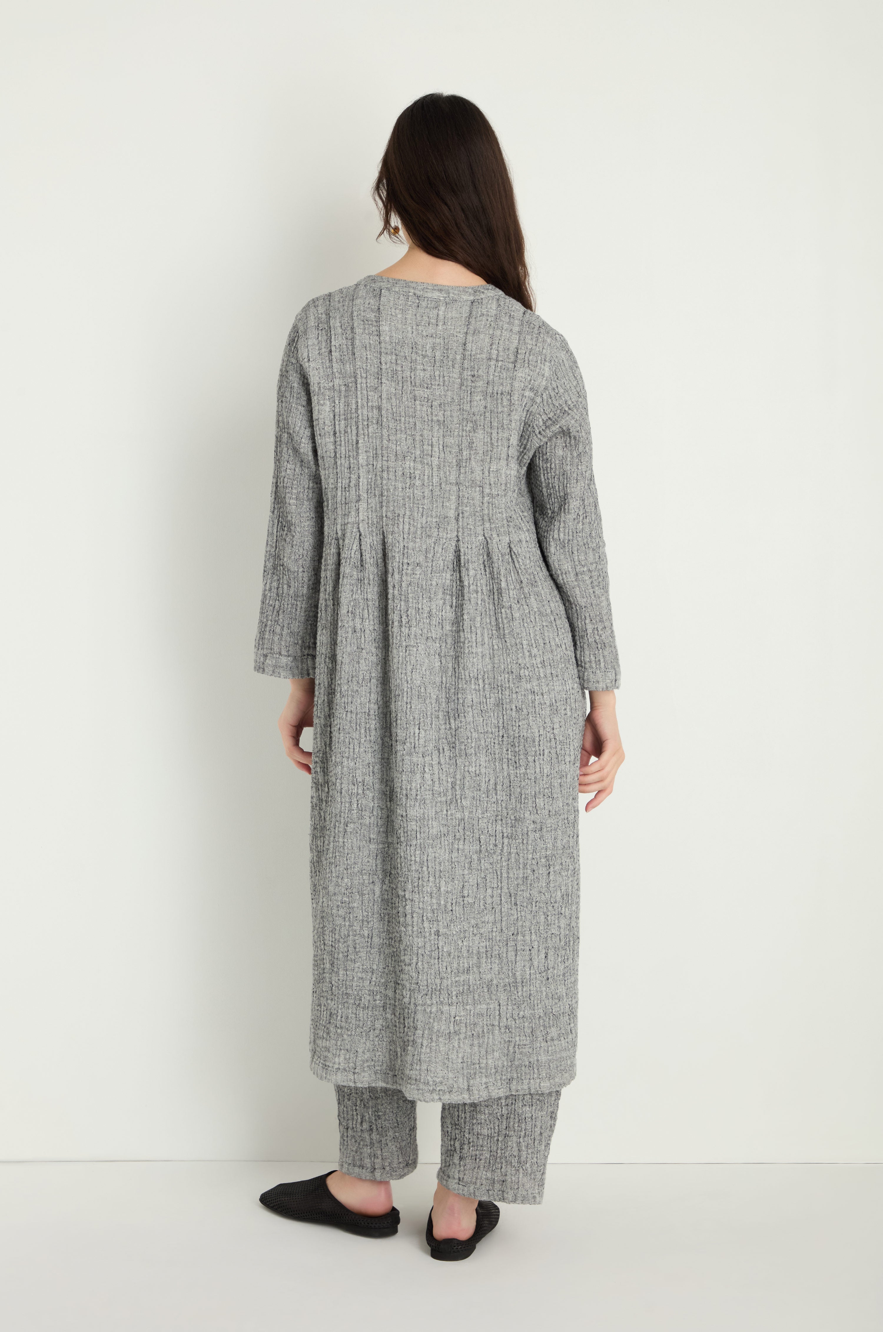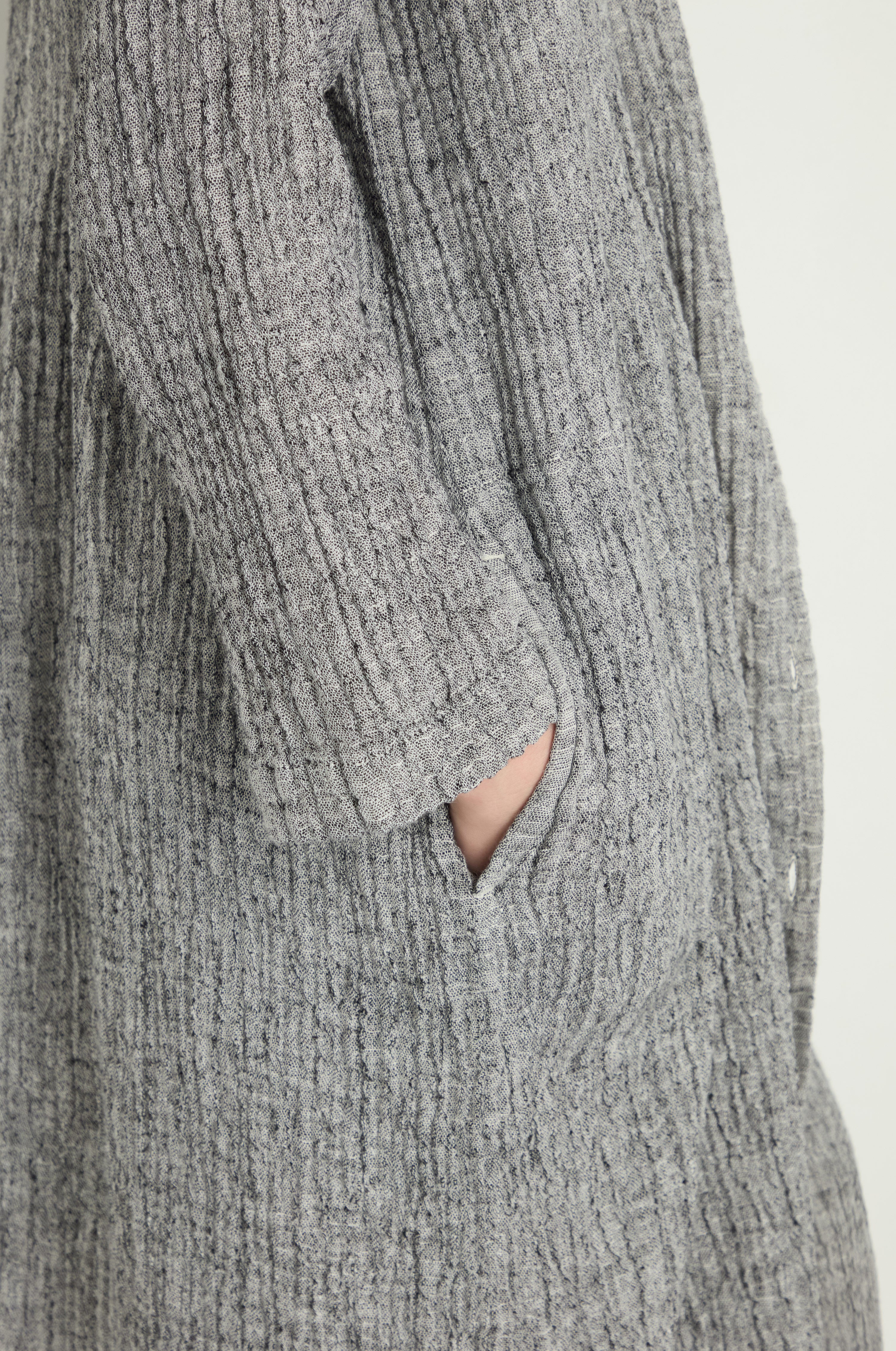 A masterclass in textile craftsmanship, this Sahara Crinkle Double Face Linen Shirt Dress is crafted from textured double-faced fabric, with bold grey on the outside and soft pale grey within. Turn back the cuffs to reveal the contrast, a subtle detail that elevates the look. The crinkle finish adds depth and character, while the relaxed silhouette offers versatile styling. Wear it buttoned through, belted, or open over a simple T-shirt for an effortlessly modern feel.