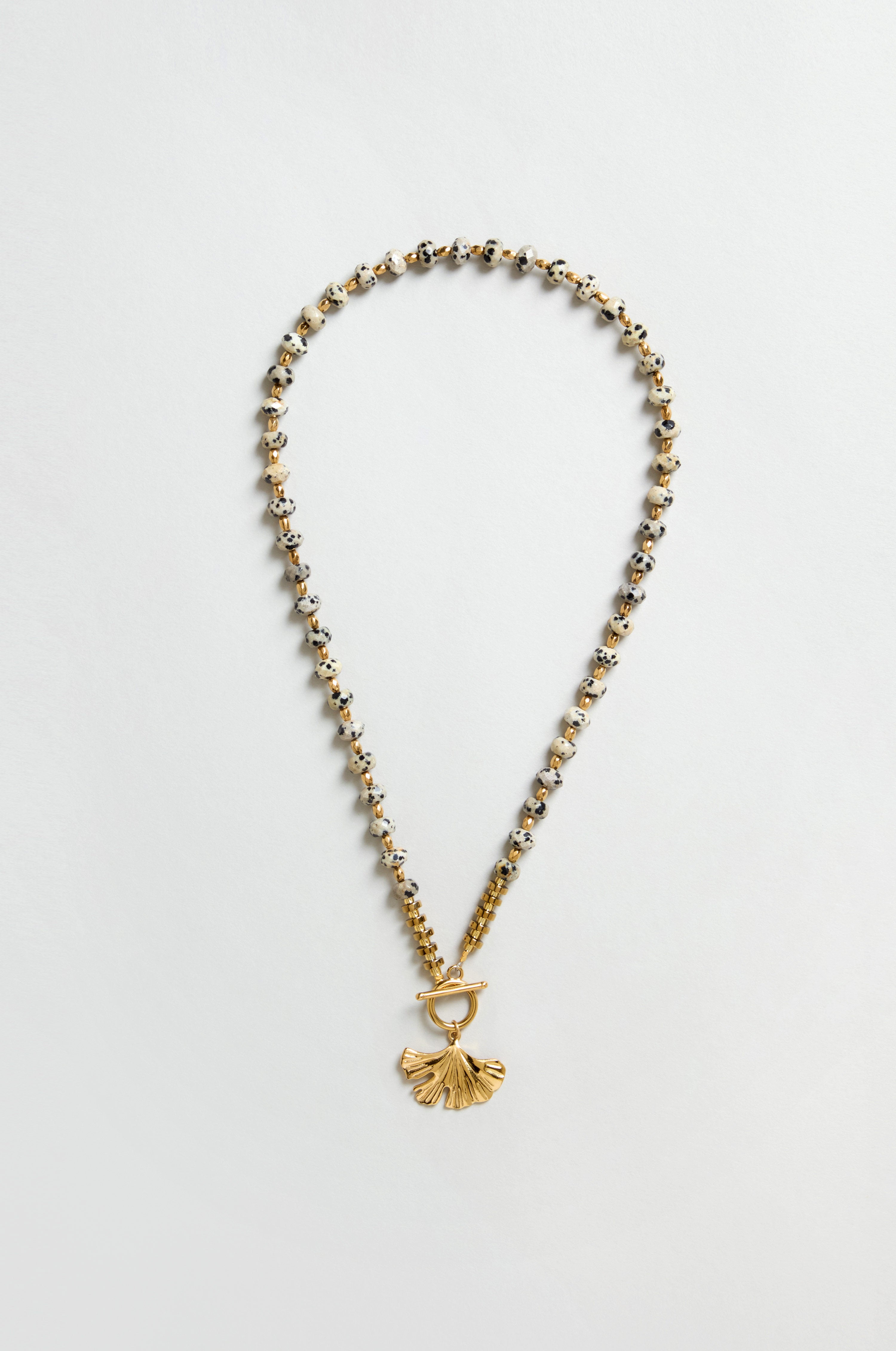 The Arran Bay Dalmatian Stone Ginkgo Leaf Necklace brings together organic texture and sculpted gold, with speckled stones that feel naturally varied and a softly polished ginkgo charm that adds a sense of warmth. The longer length gives it presence without heaviness, designed to lie effortlessly over simple layers.