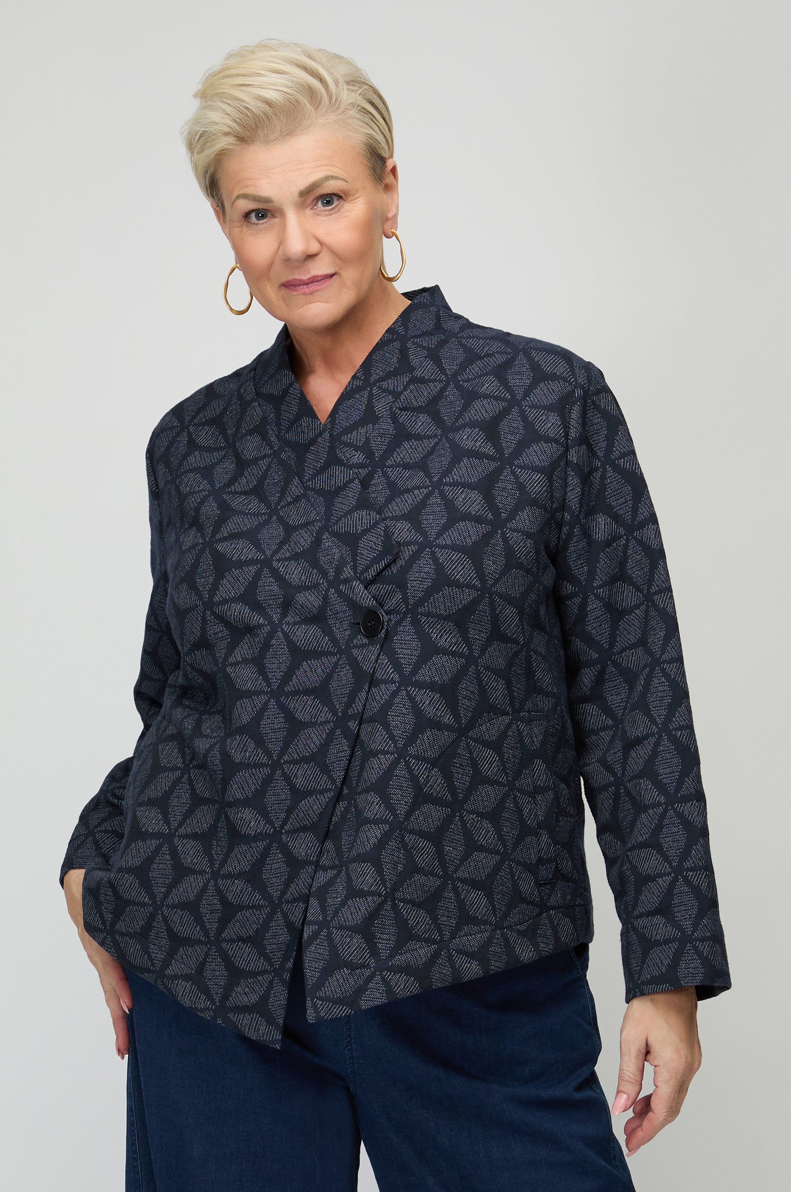 The Sahara Diamond Floral Indigo Jacket is a statement piece designed to bring texture and individuality to your wardrobe. Crafted in a rich indigo palette, the jacquard fabric showcases an intricate diamond floral design that adds depth and movement to the surface. The relaxed cut ensures ease of wear, while the single corozo button and discreet pockets offer both function and refined detail.