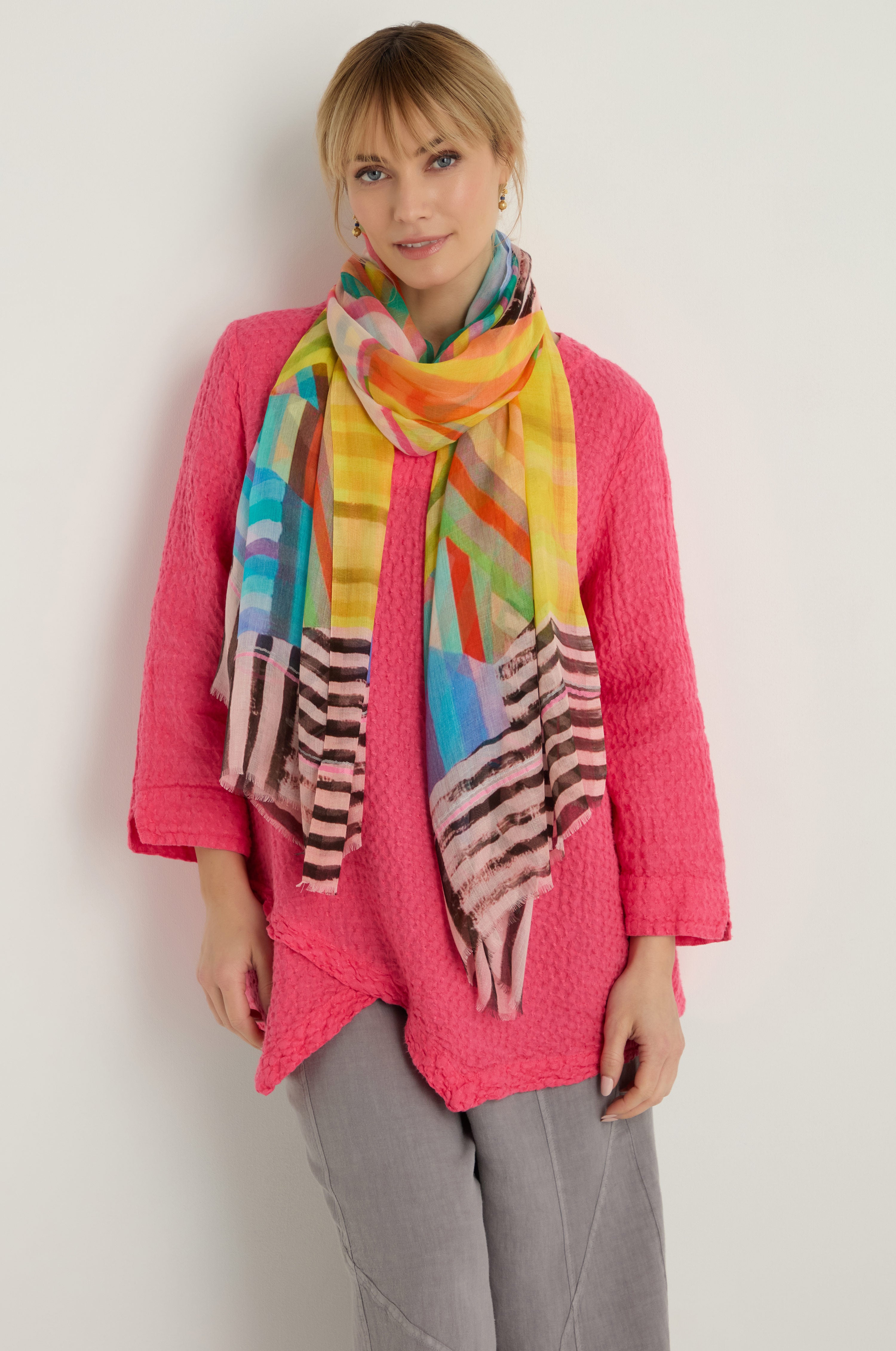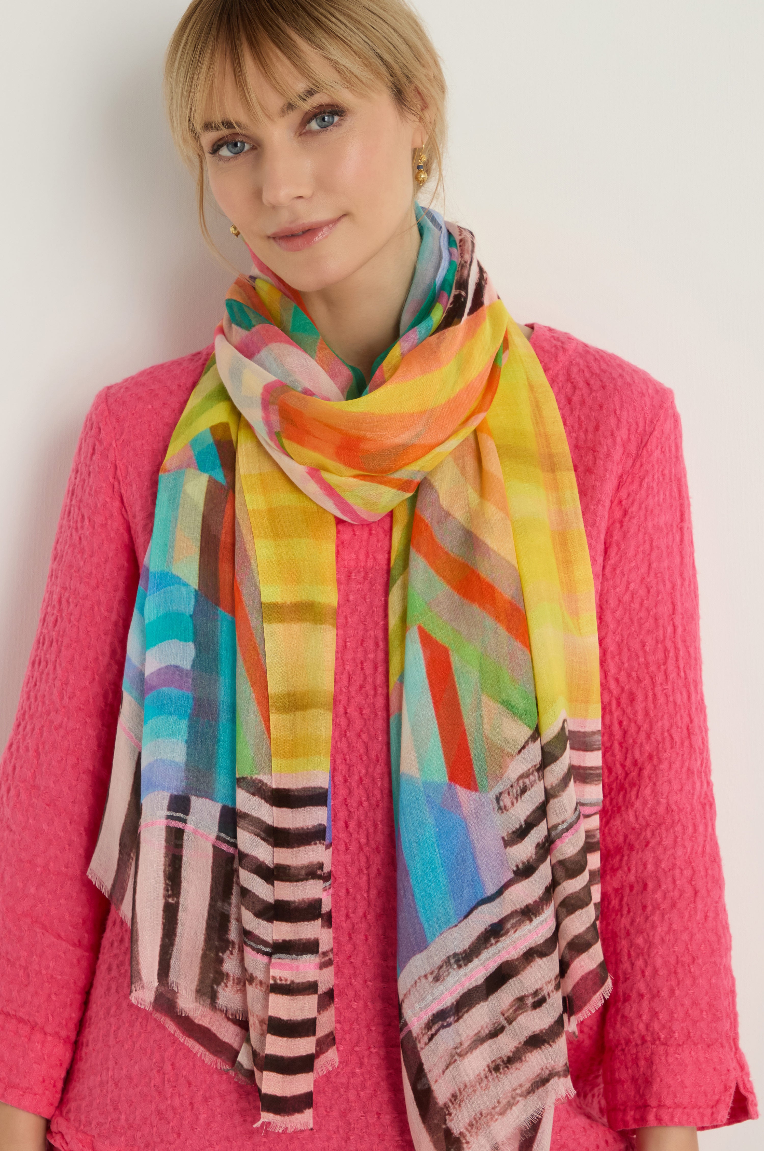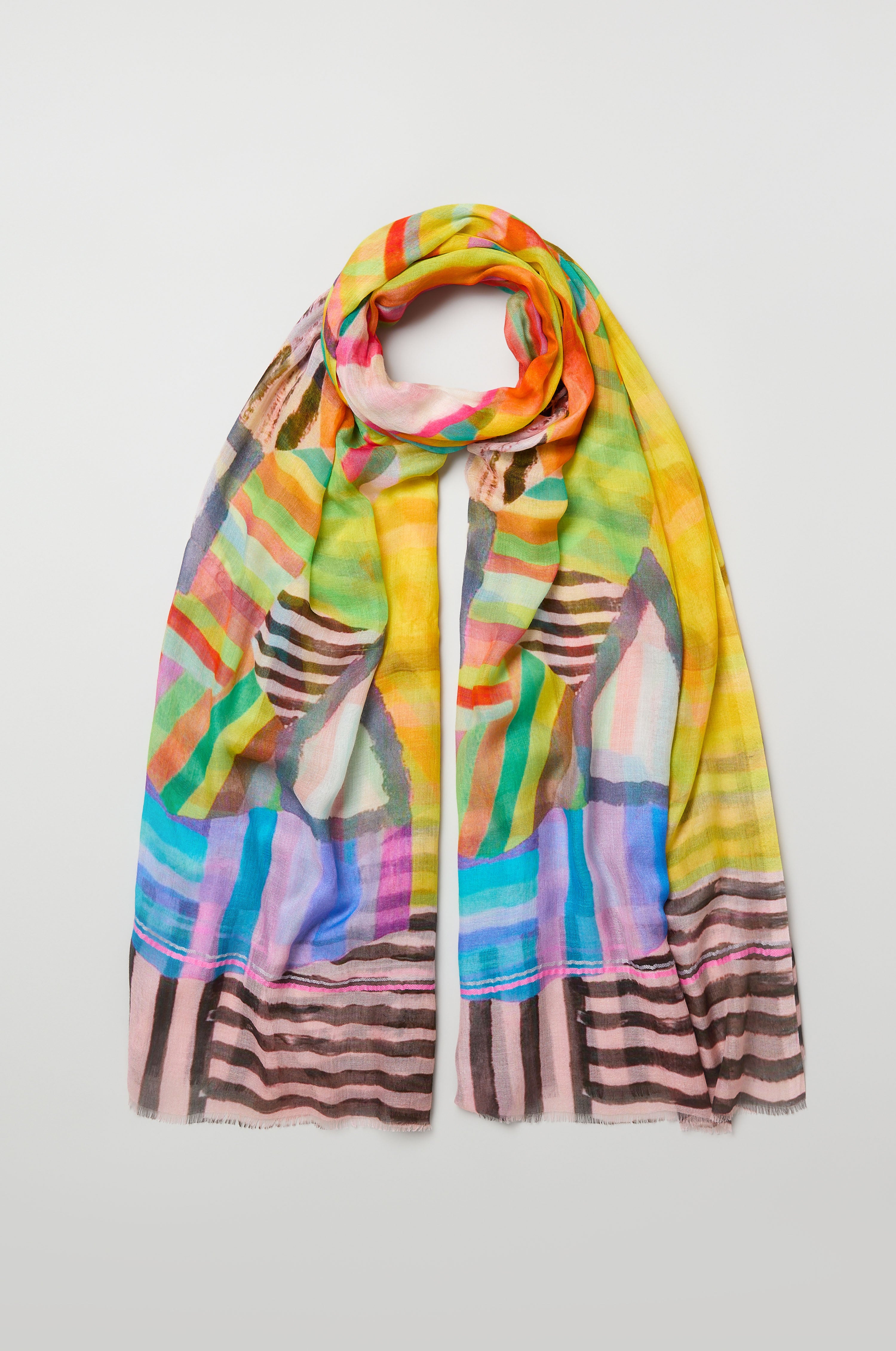The Sahara Directional Stripe Modal Blend Scarf is a lightweight layer designed to bring softness and subtle pattern to everyday dressing. Woven in a fluid modal and silk blend, it drapes beautifully while the tonal stripe adds gentle dimension. The softly frayed edges give it an easy, relaxed finish that works across seasons.