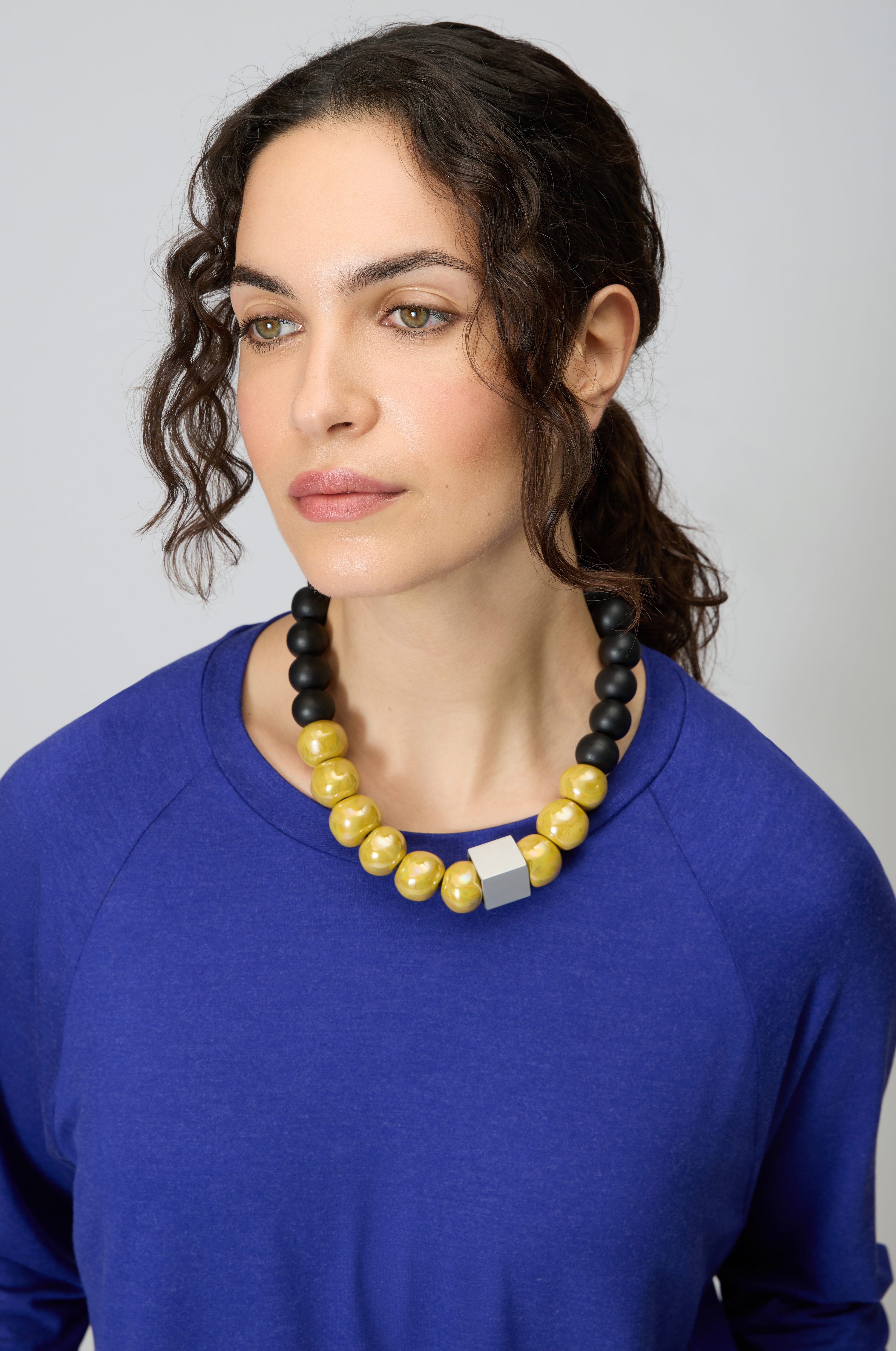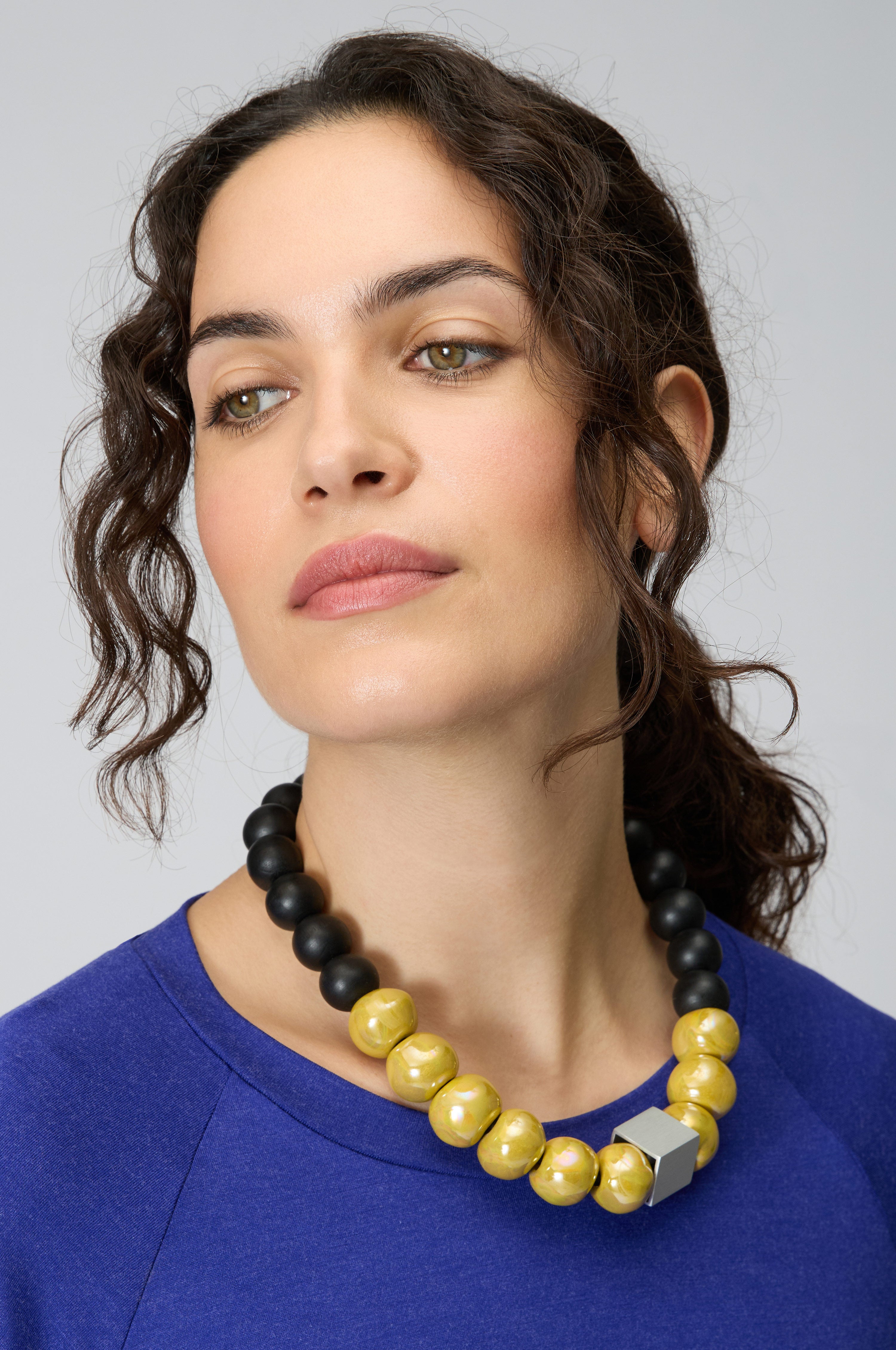 This Christina Brampti Elements Necklace balances natural texture with contemporary form, pairing matte black wooden beads with glossy ochre ceramic and a central anodised aluminium cube. It sits comfortably at the neck, adding sculptural contrast and confident colour to neutral or monochrome outfits.