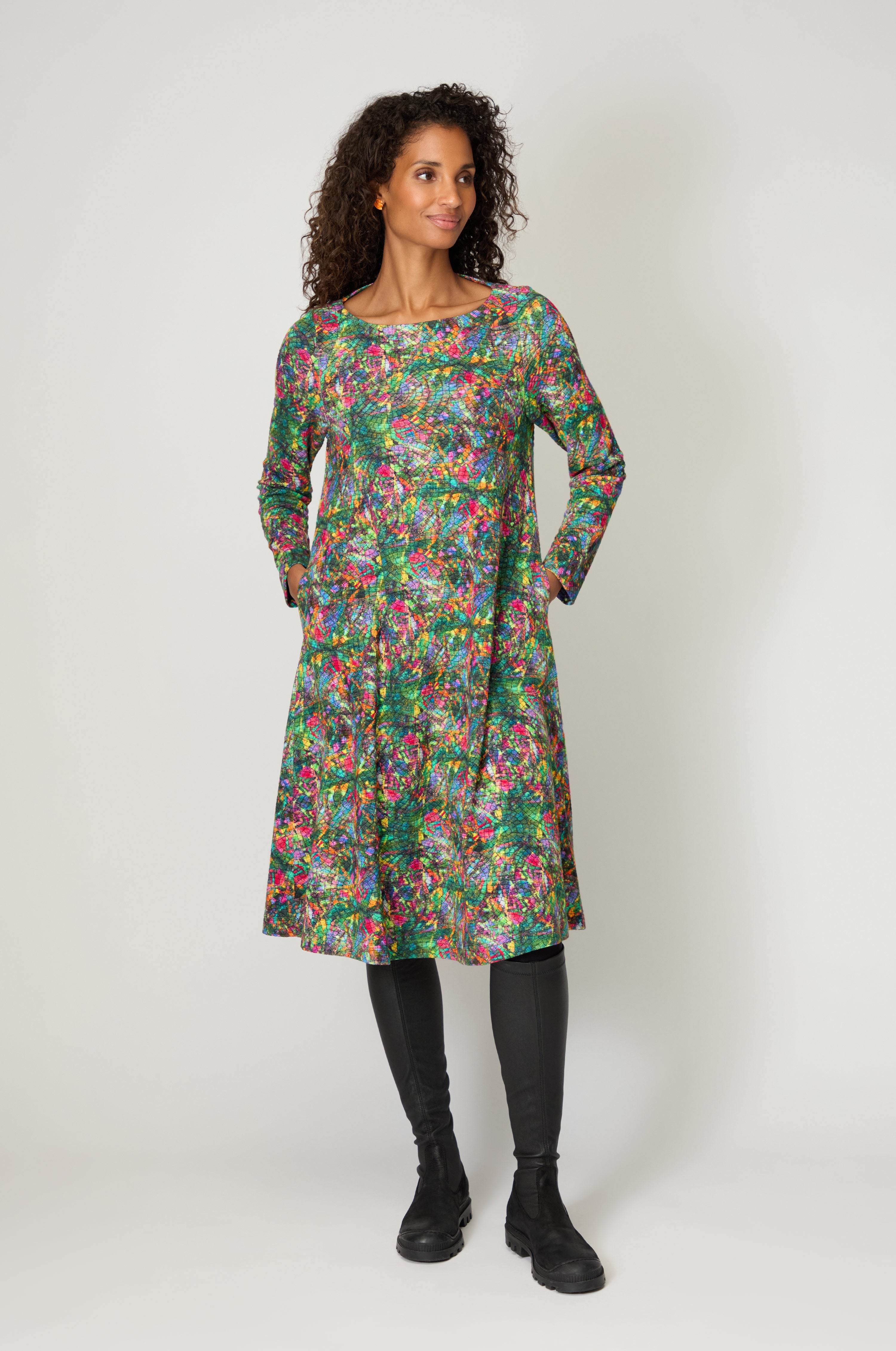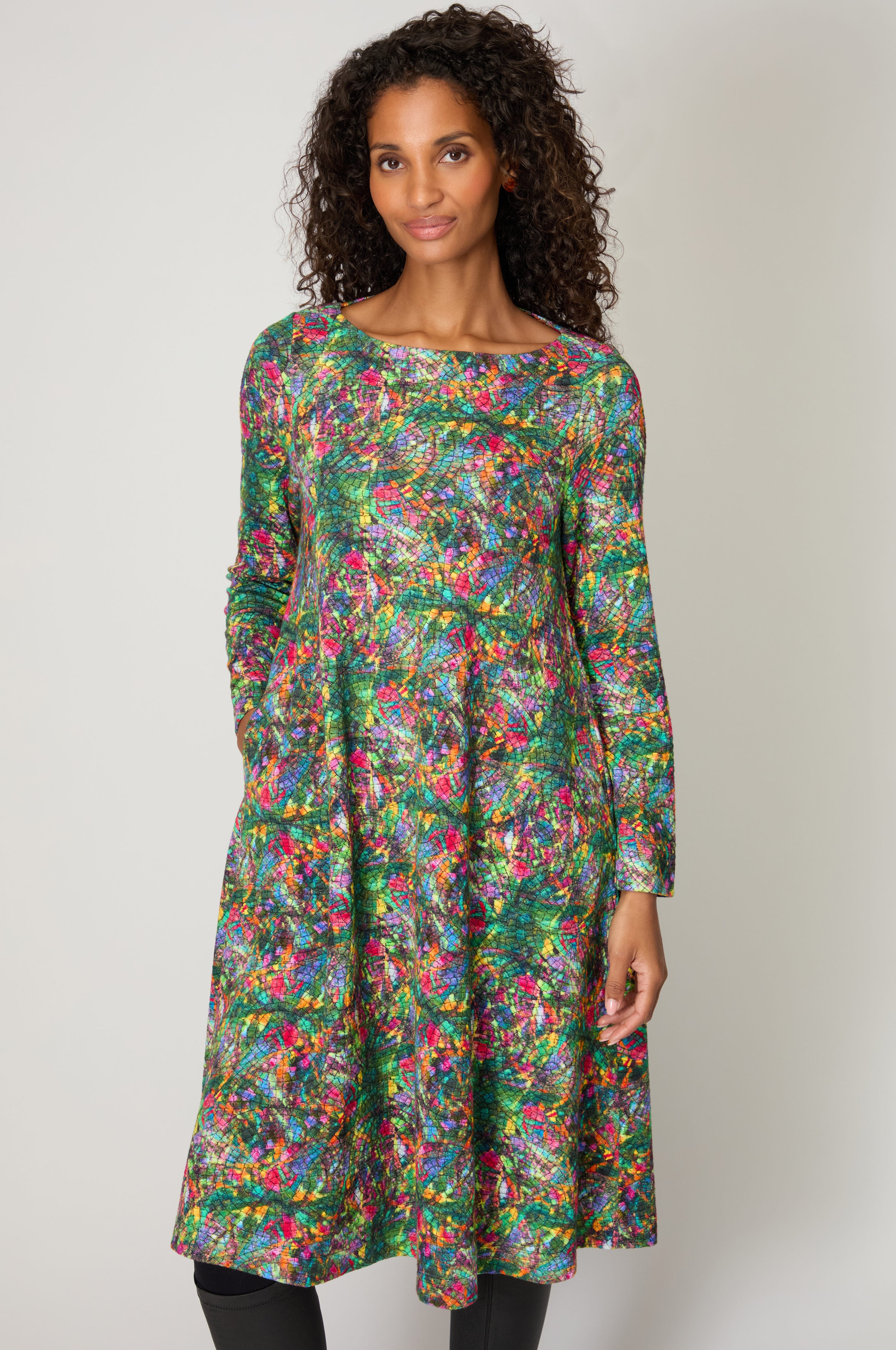 An expressive dress that moves effortlessly from day to evening, it layers well with knits or coats, allowing the pattern to remain the focal point.
