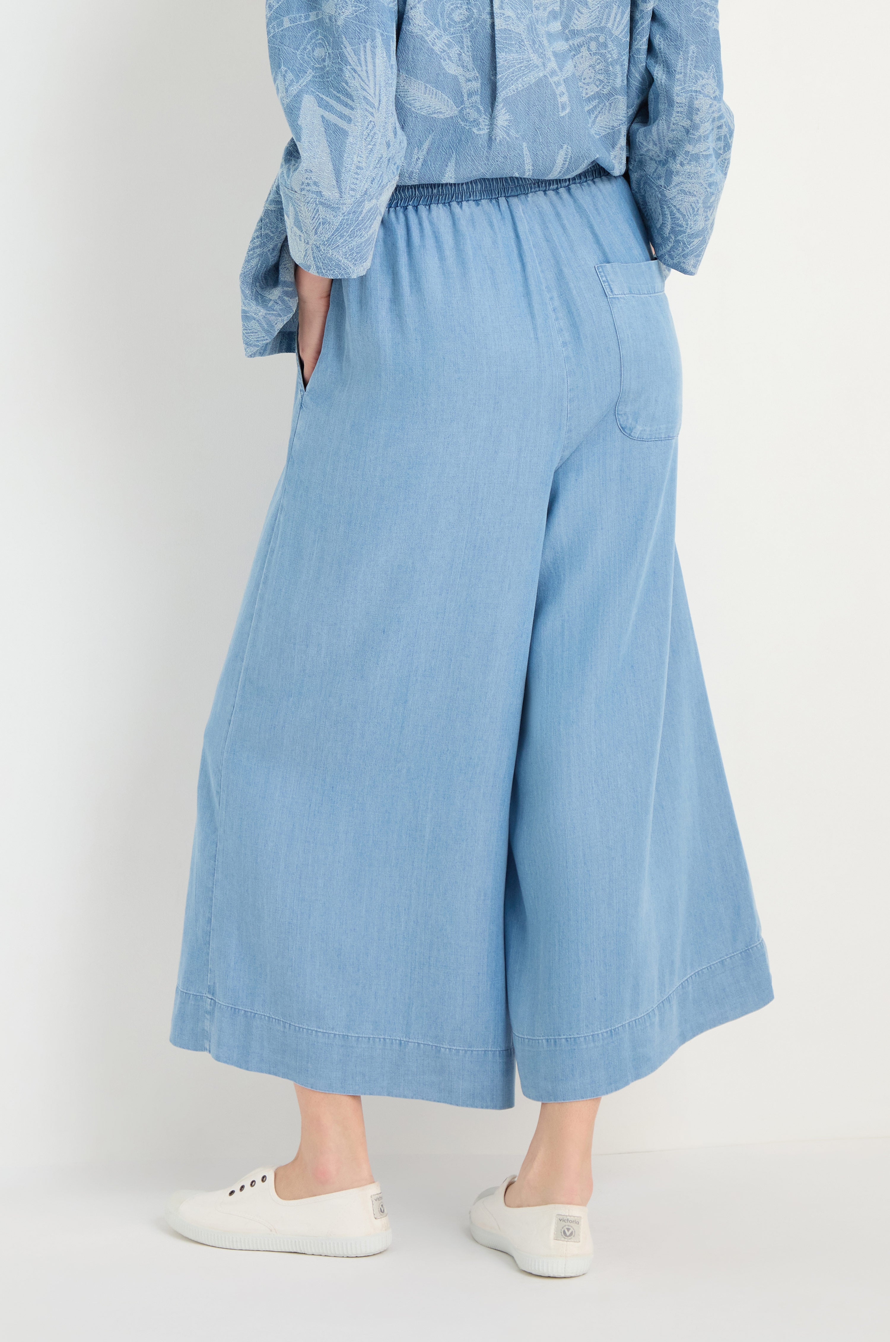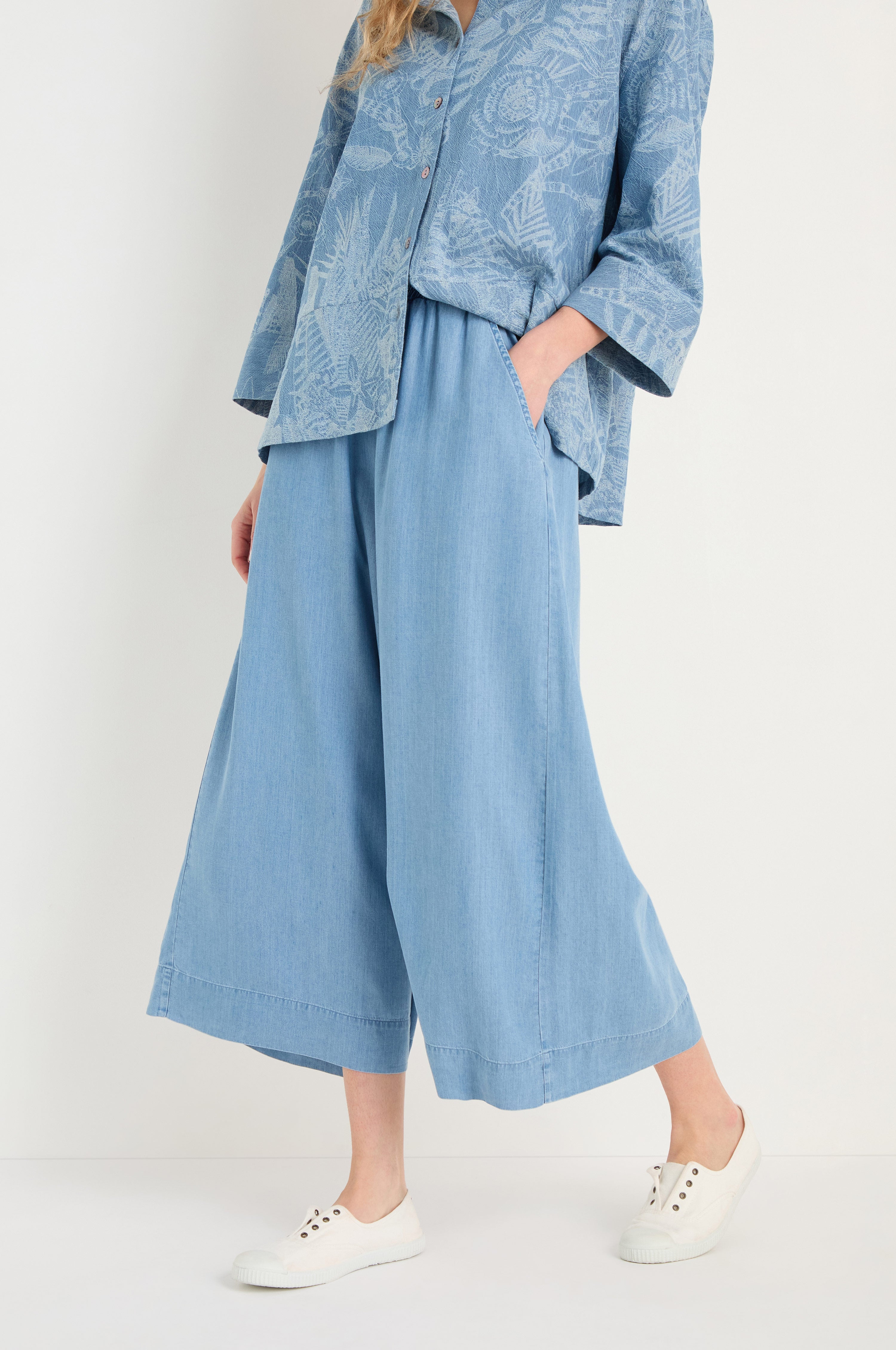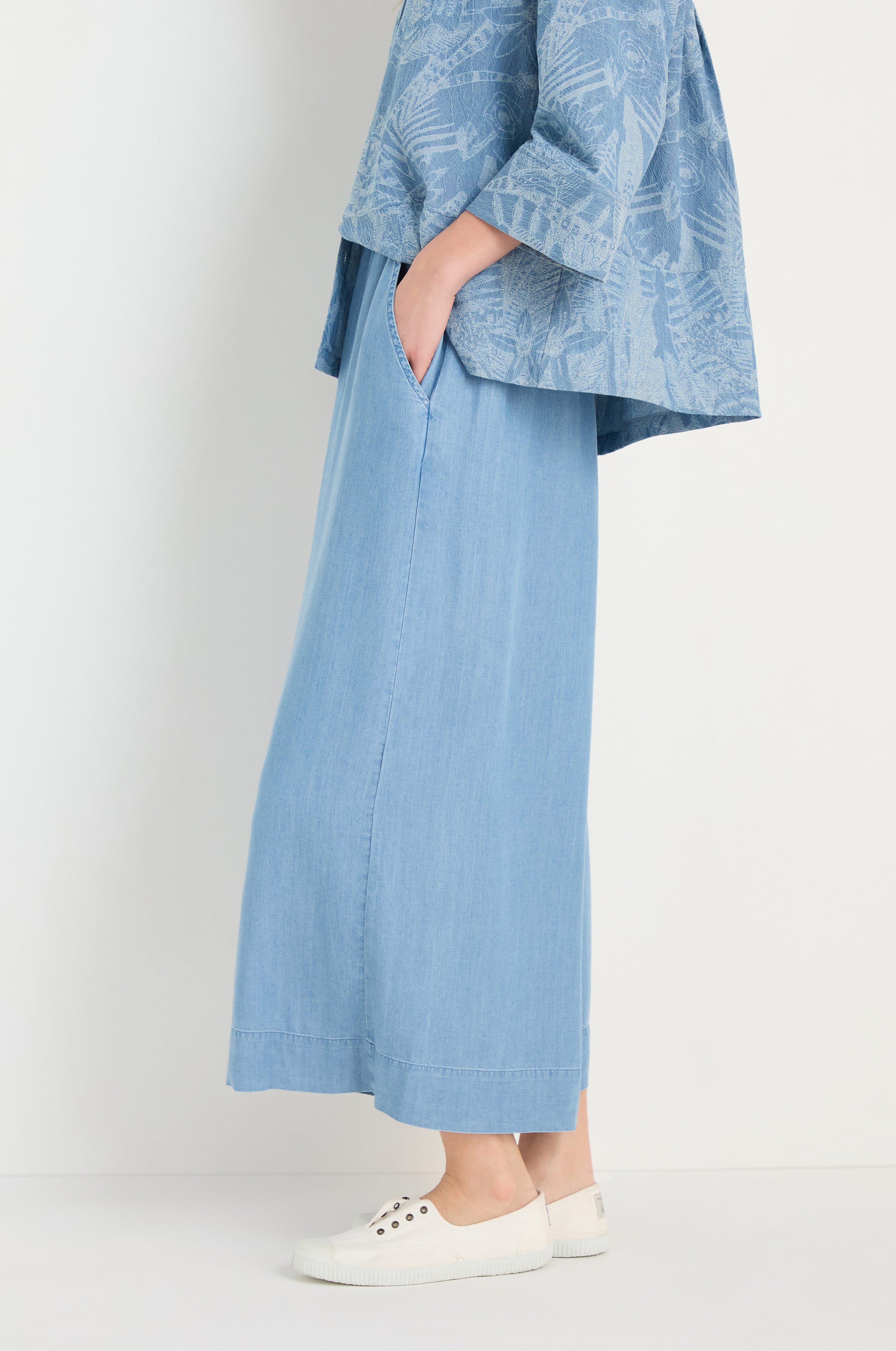 The Sahara Fluid Denim Wide Trouser pairs the character of denim with a softer feel. The wide leg silhouette creates a relaxed shape that moves easily with the body.