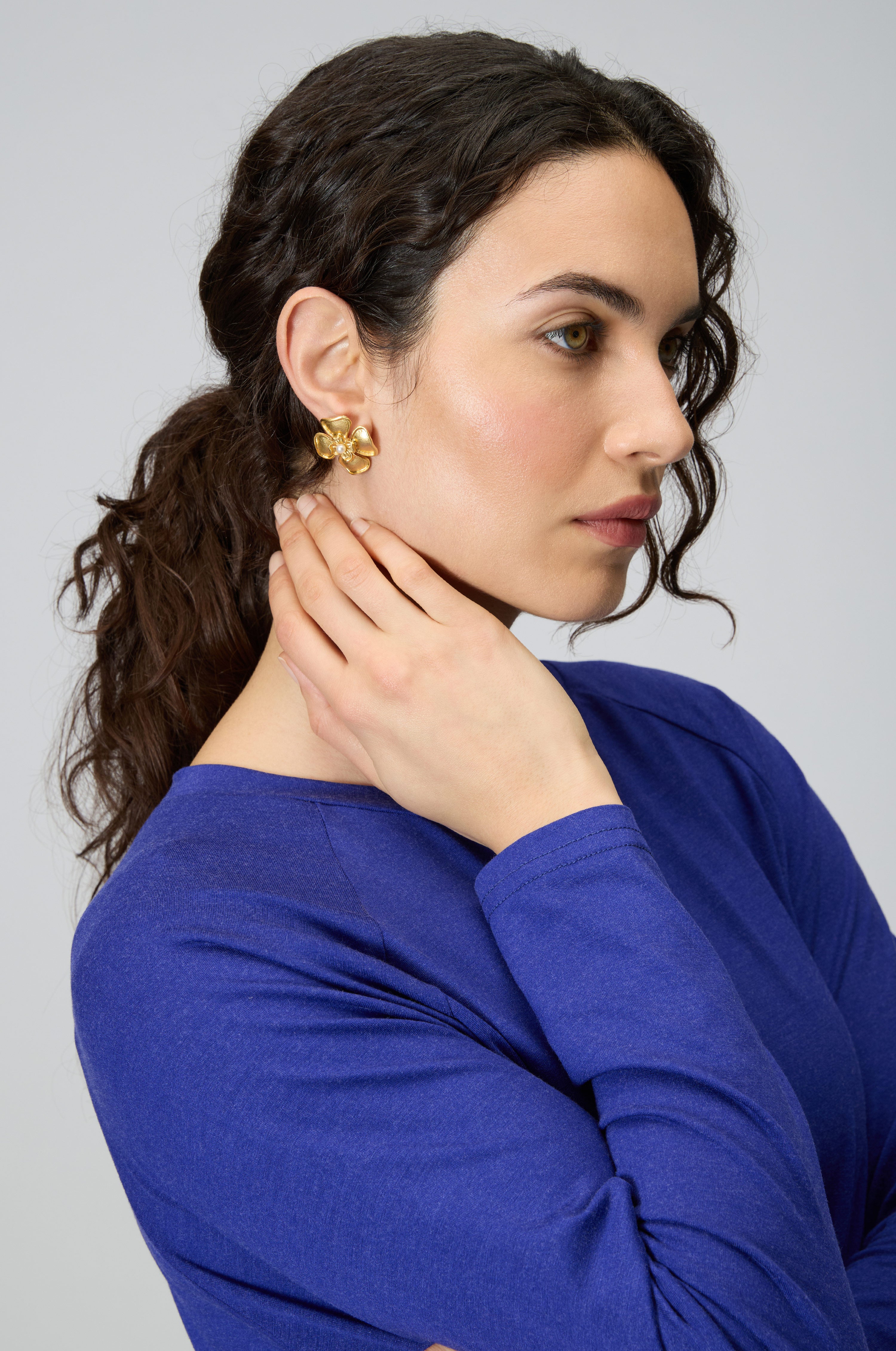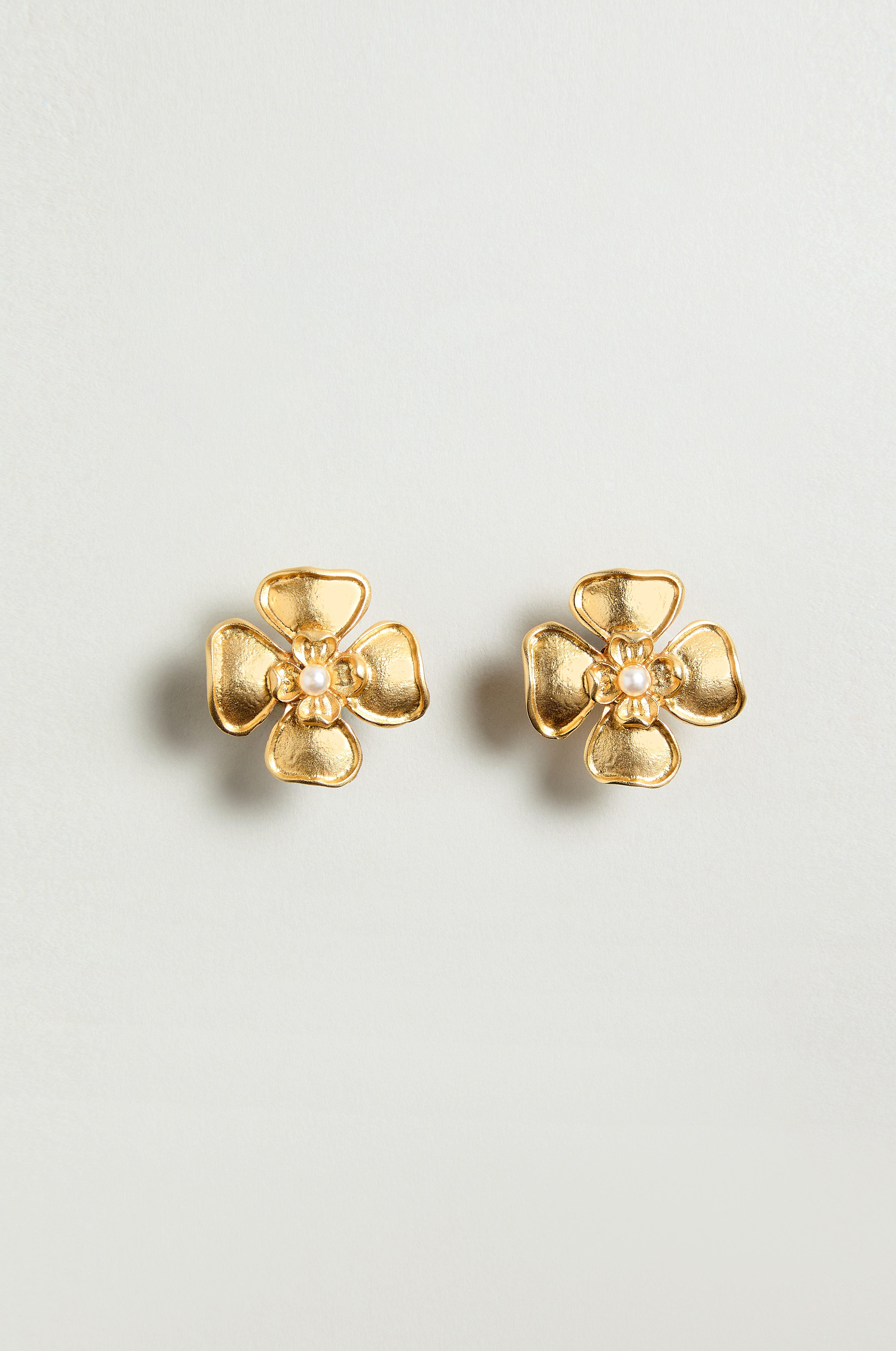 These sculpted earrings bring a soft glow to everyday dressing, combining fluid gold-plated forms with a delicate pearl centre. The flower design is expressive, catching the light with subtle texture while remaining easy to wear and refined.