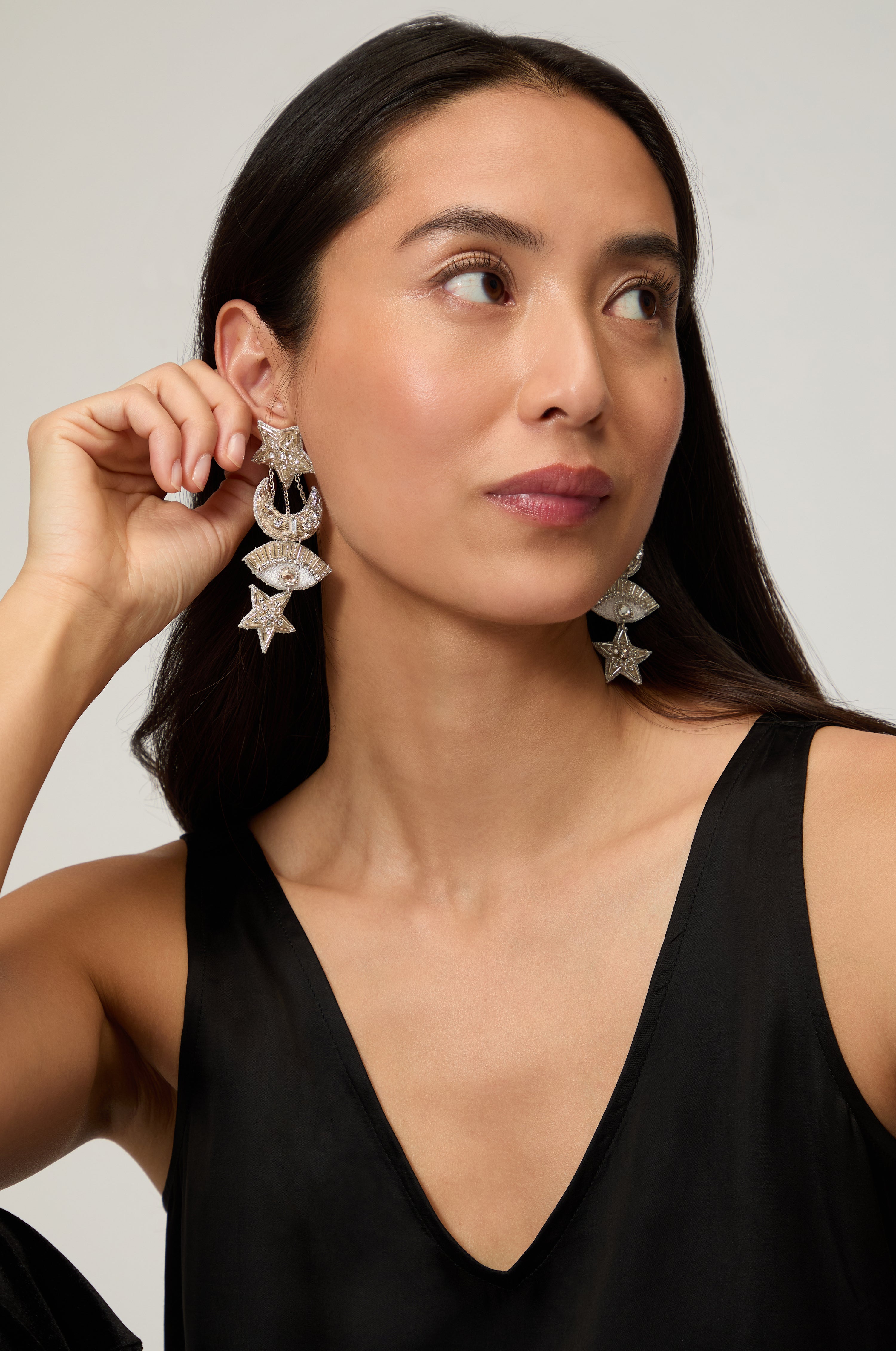 The Hand Beaded Celestial Silver Earrings by Psquuare Fashion Jewellery bring playful drama and sparkle to any outfit. These lightweight earrings feature a dazzling moon, star, and eye motif, intricately hand-beaded and suspended by two delicate chains.