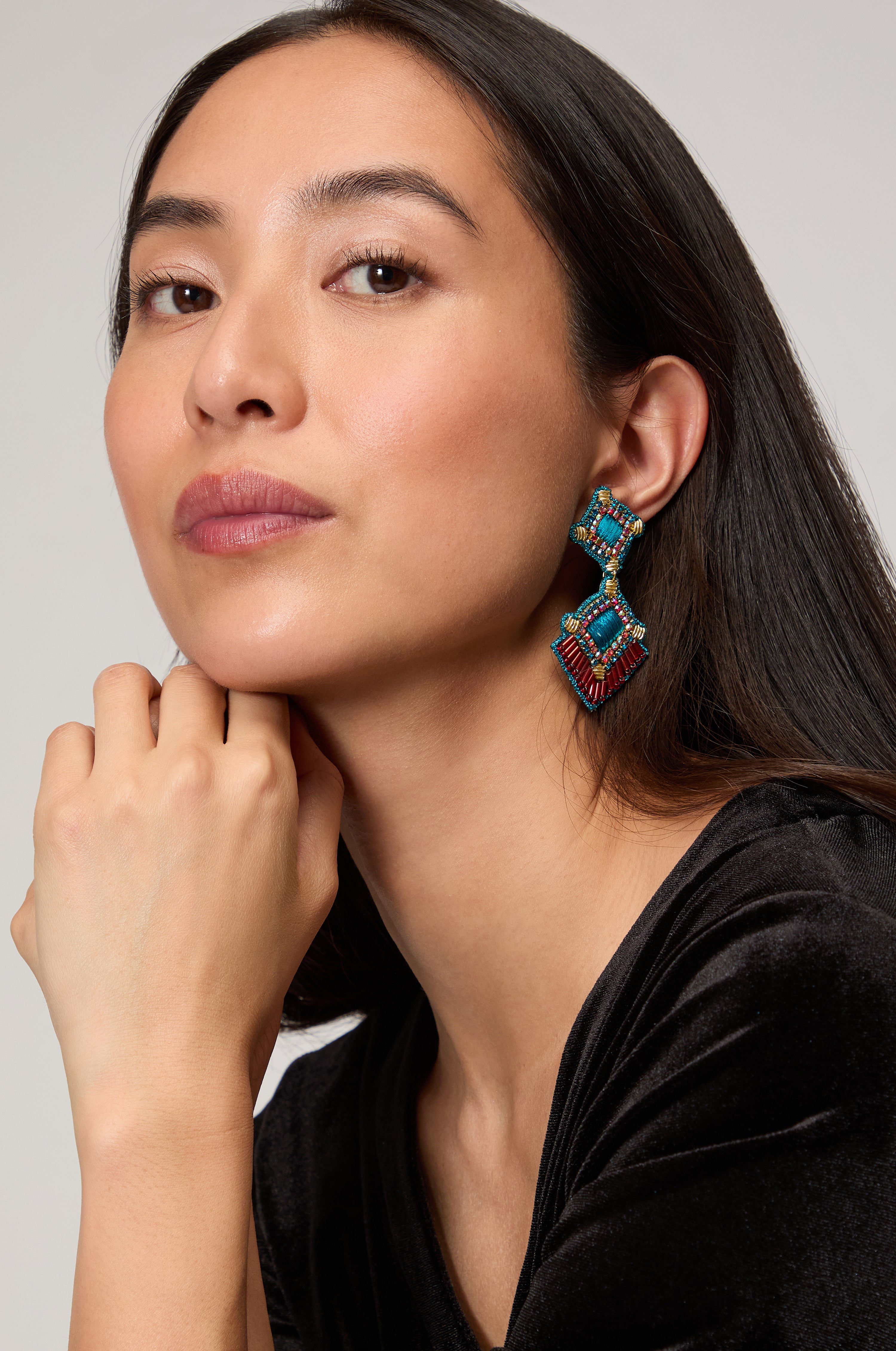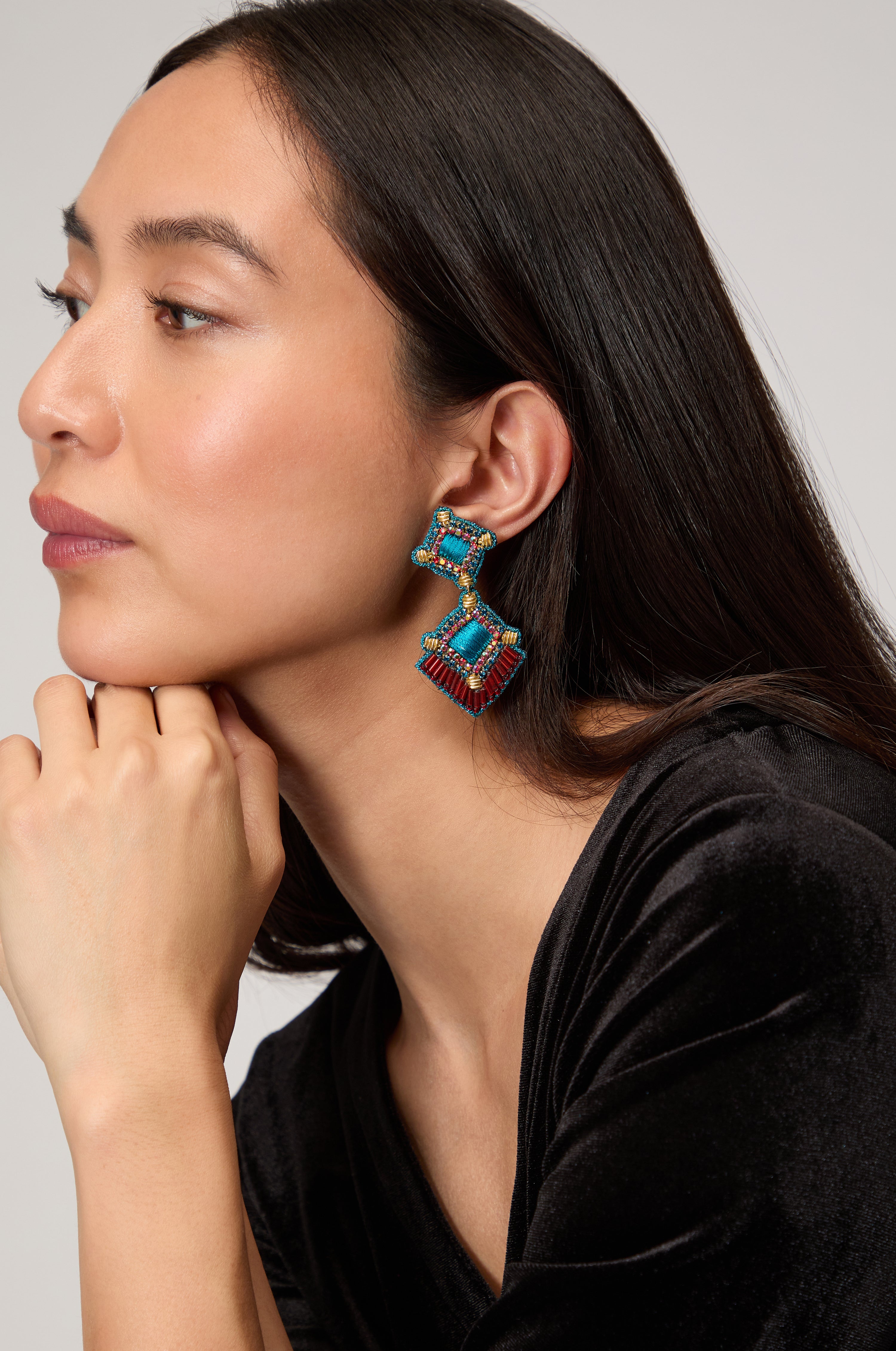 The Hand Embroidered Square Drop Earrings by Psquuare Fashion Jewellery make a playful statement with their bold, vibrant hues. Featuring two linked squares in striking blue and warm red, accented by metallic glinting beads, these handcrafted earrings catch the eye with every movement.