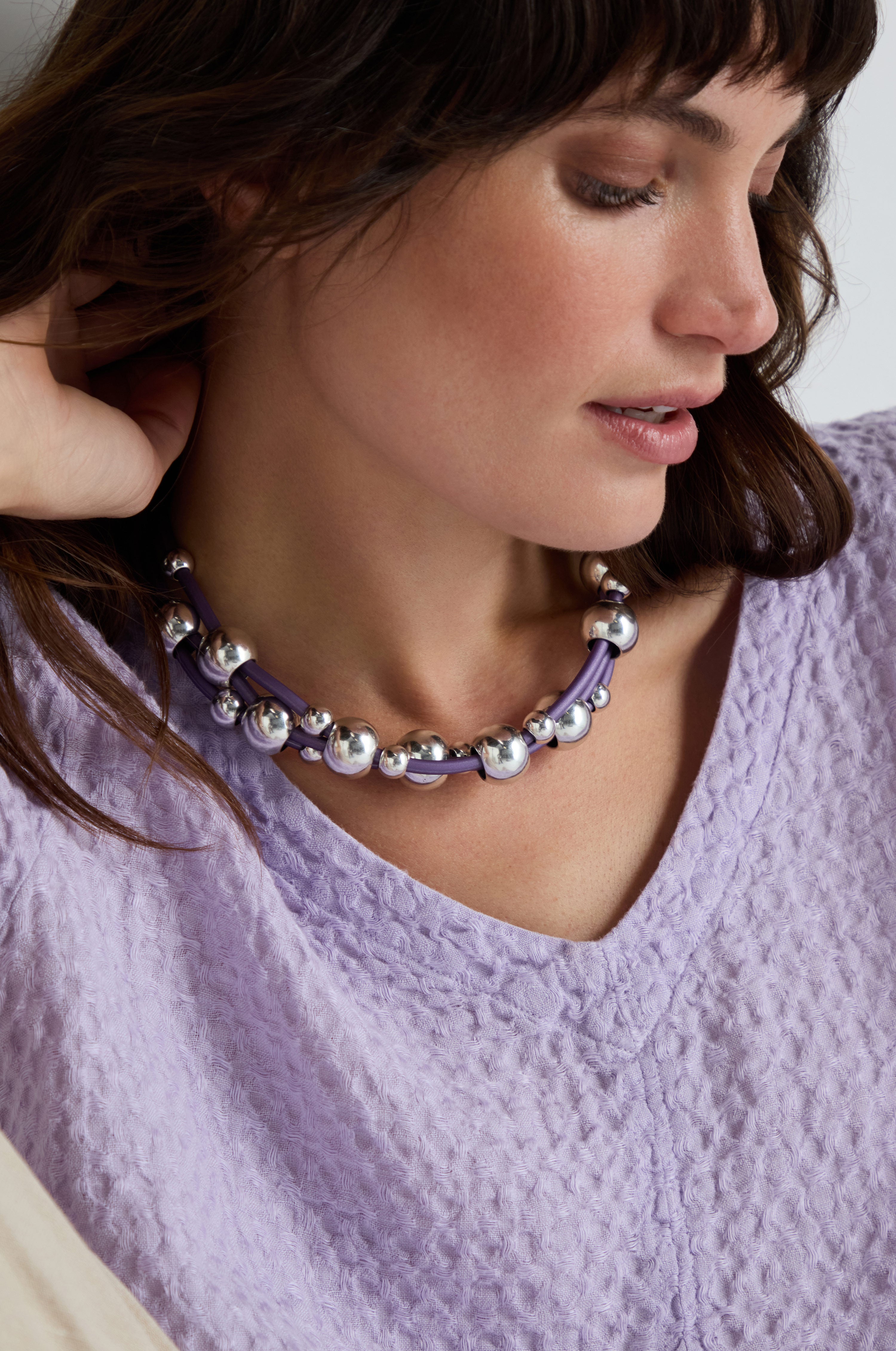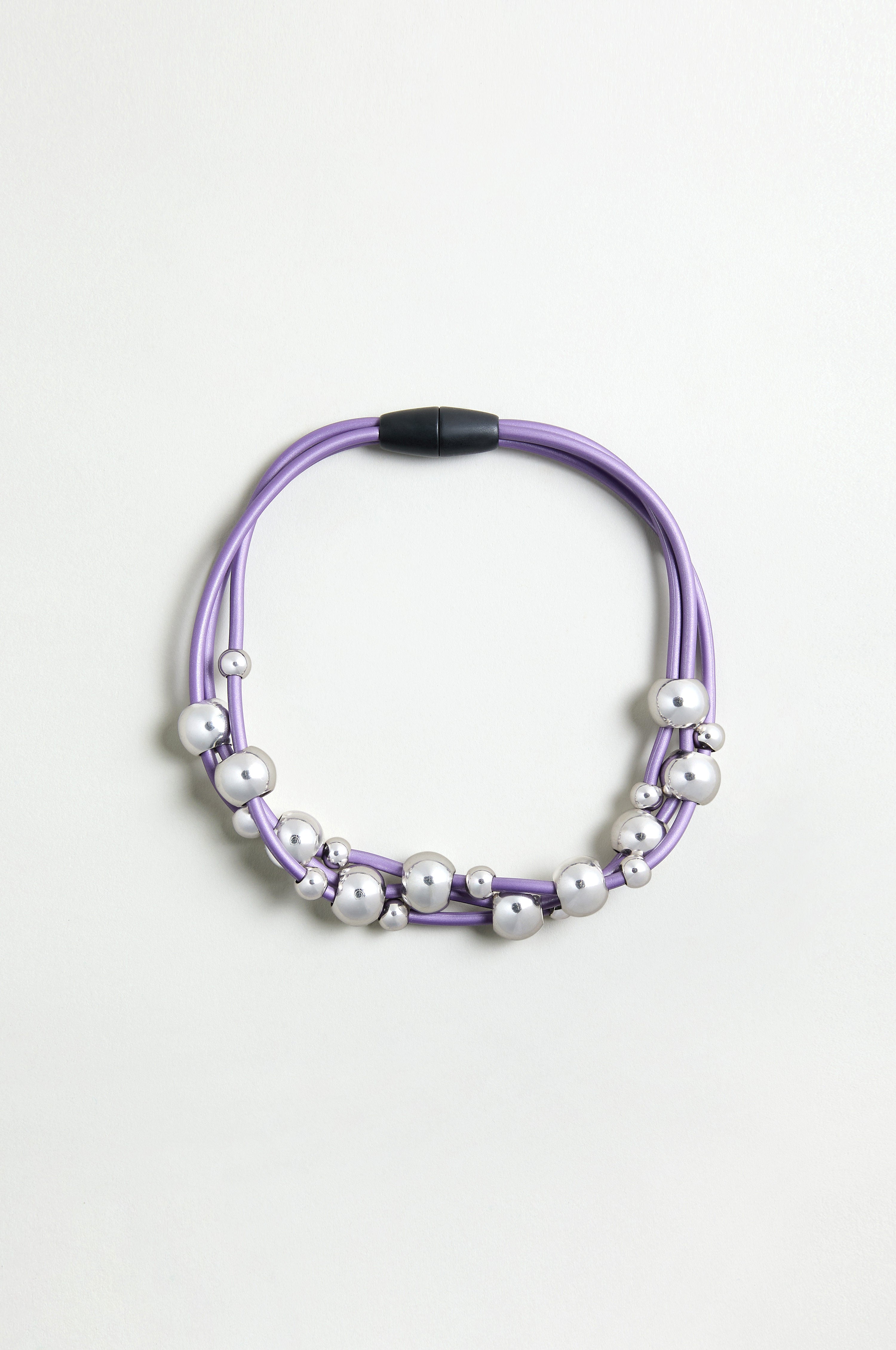 The Samuel Coraux Infinite Spheres Necklace pairs dramatic shine with a vivid strand of colour. Smooth silver acrylic spheres are arranged along layered violet PVC cords, creating a playful, dimensional necklace that sits neatly at the neck and fastens with a magnetic clasp.