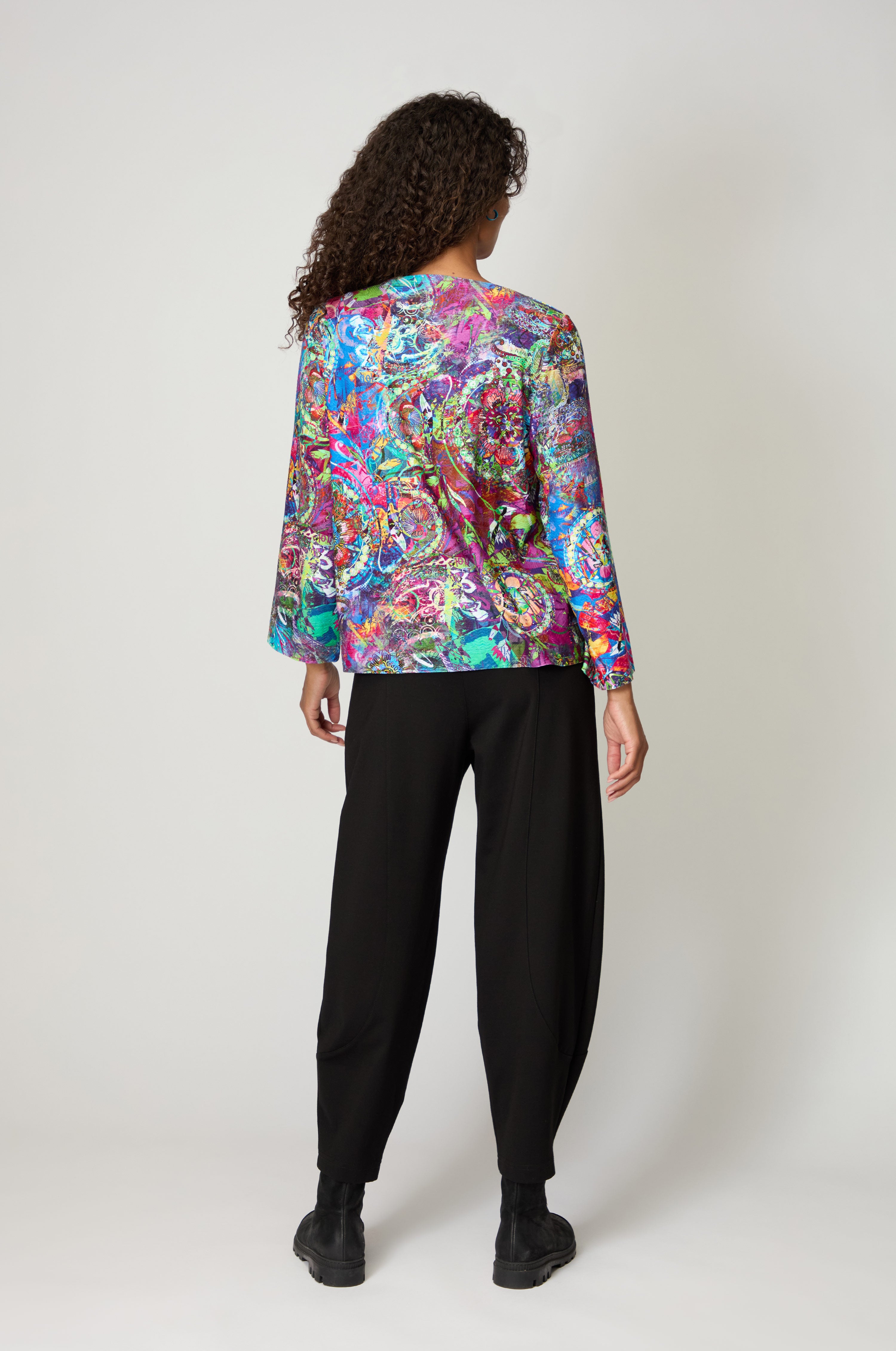 Whether layered under a jacket or worn alone with slim trousers, this top brings painterly energy into everyday dressing.