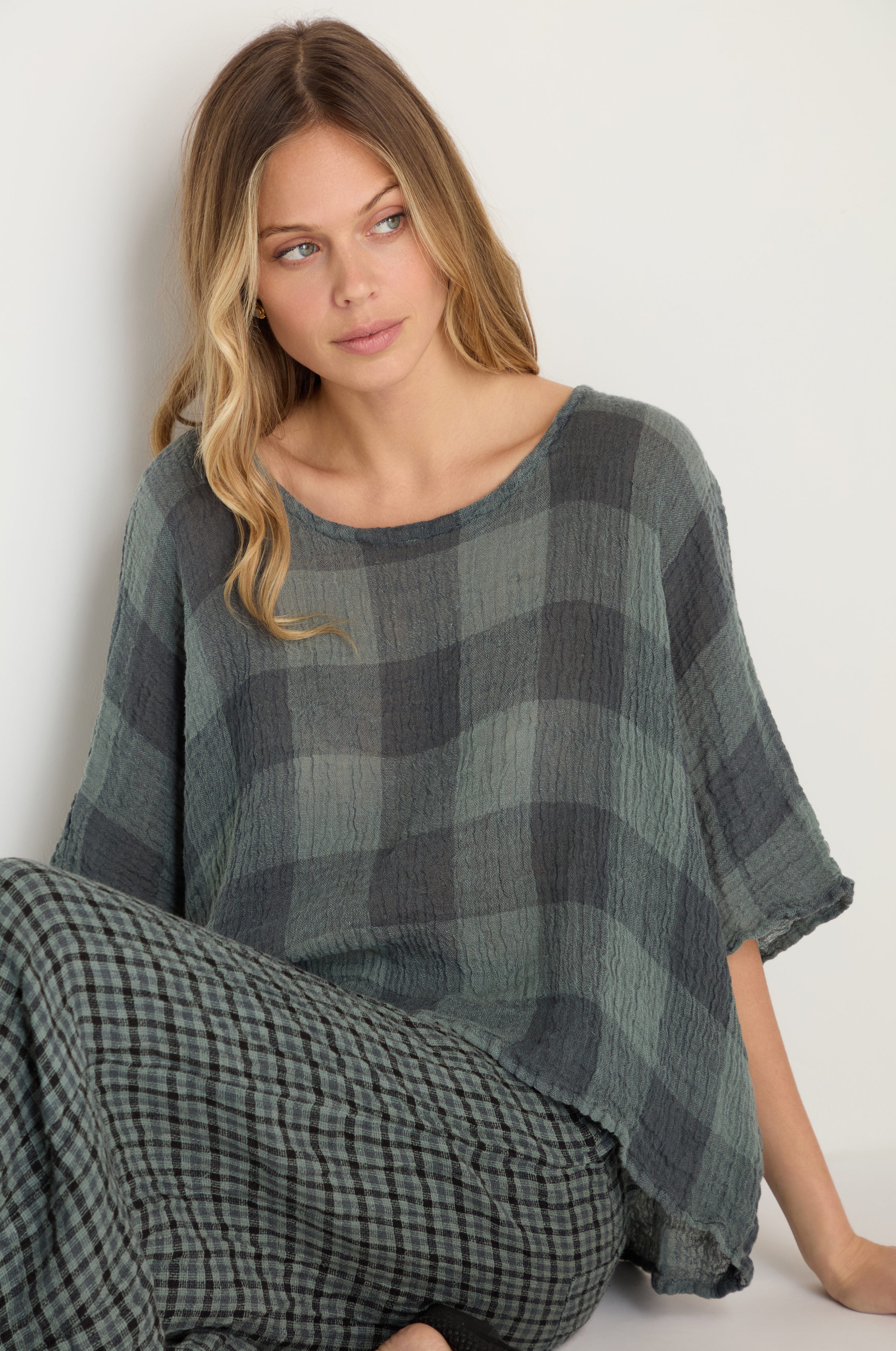 The Grizas Large Check Boxy Linen Top is a relaxed, modern silhouette with generous volume through the body and a soft, fluid drape. Lightweight, breathable, and subtly sheer, it adds texture and movement to everyday looks with effortless ease.