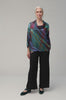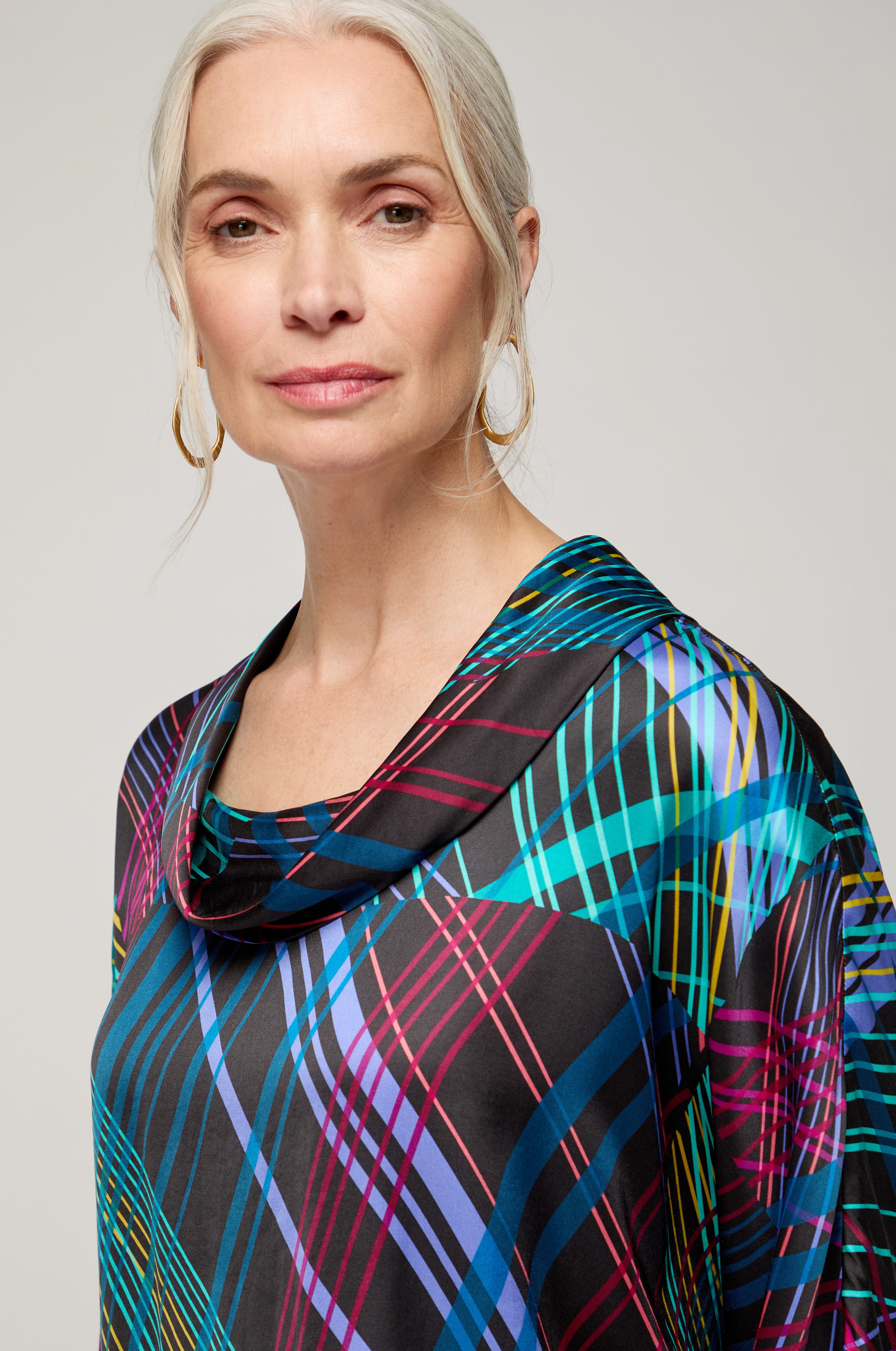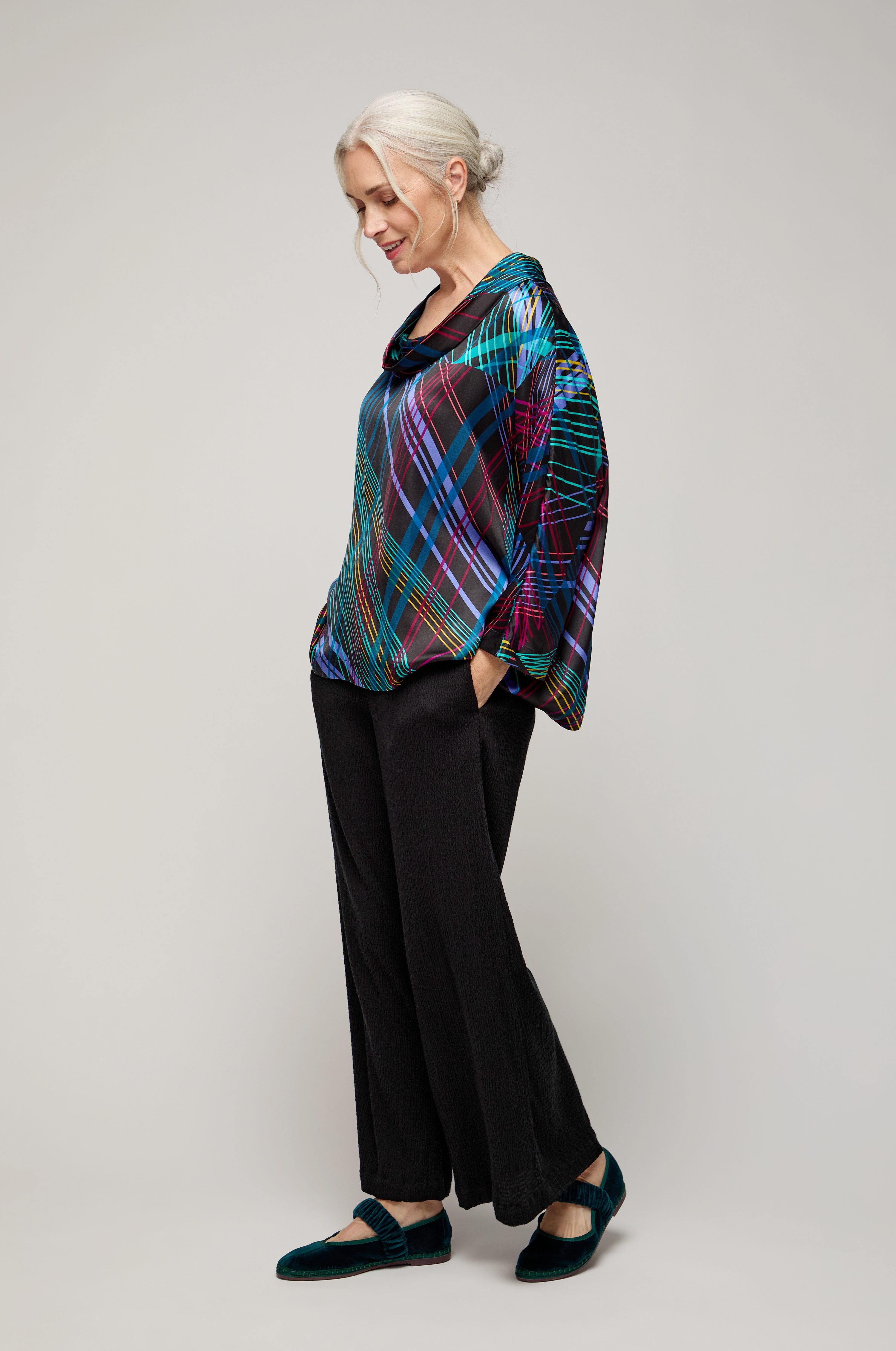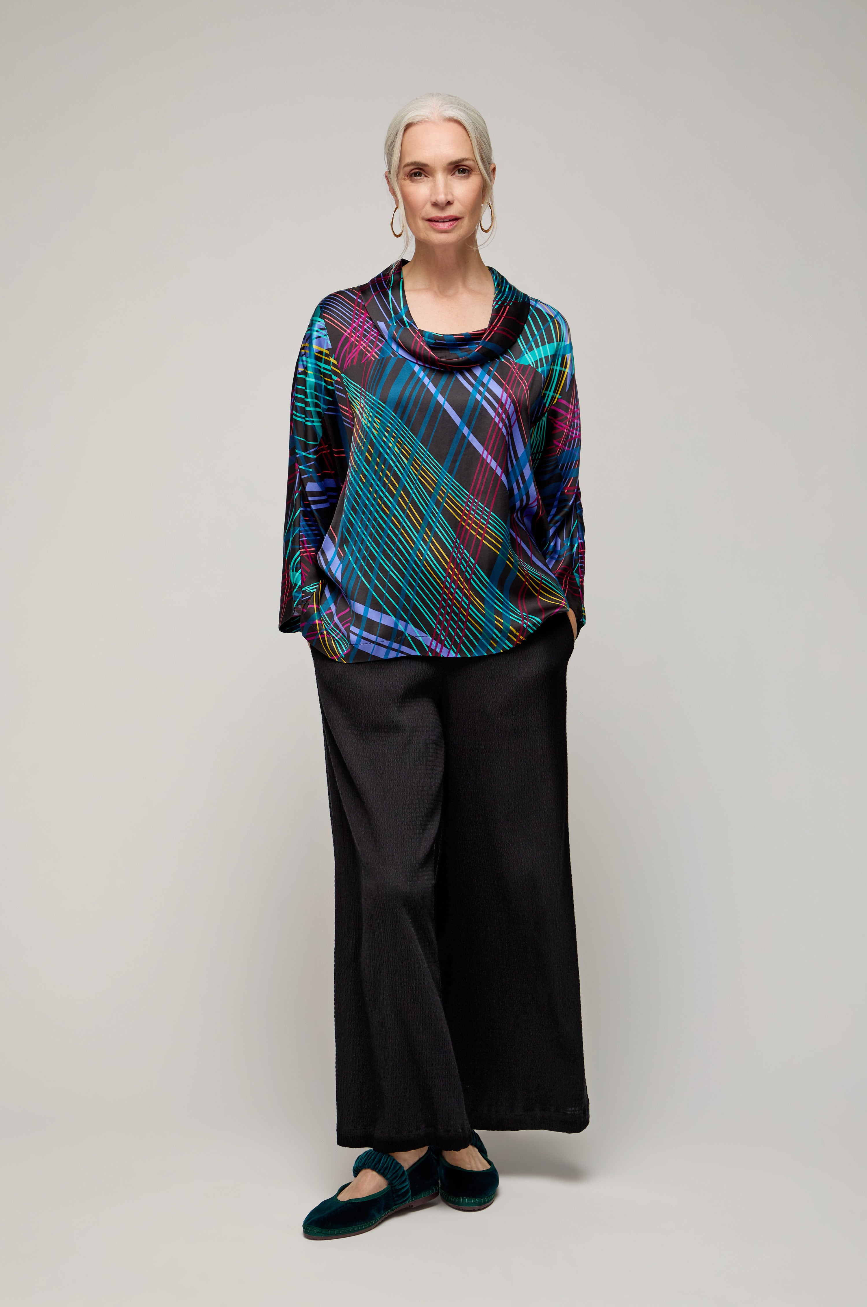 The Sahara Laser Lights Cowl Neck Top combines softness with expressive print. Crafted from silky viscose, it features a draped cowl neckline that adds dimension, while multicoloured linear strokes run across the surface, creating vibrancy and rhythm. The relaxed cut ensures comfort without sacrificing style.