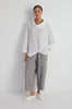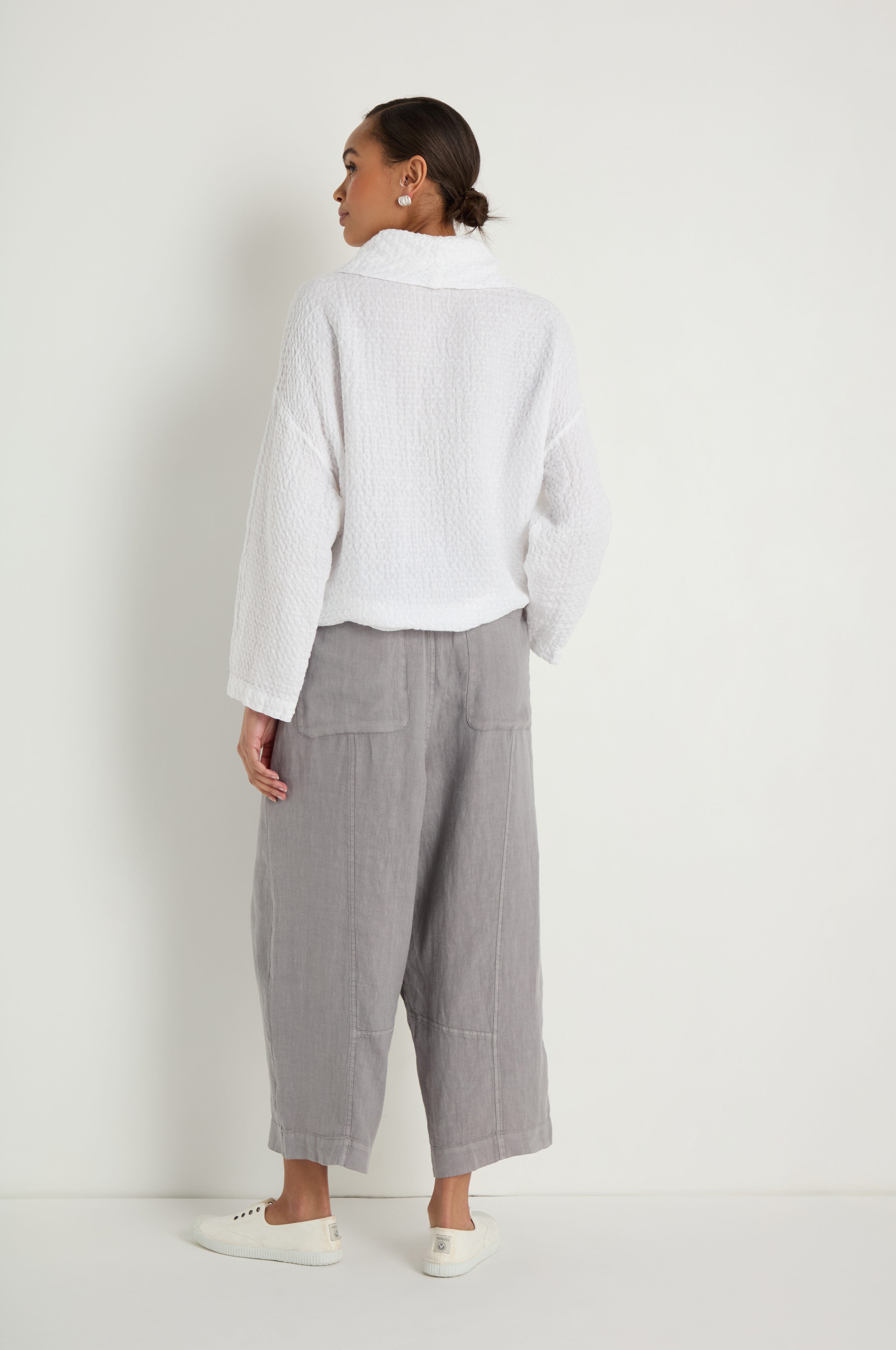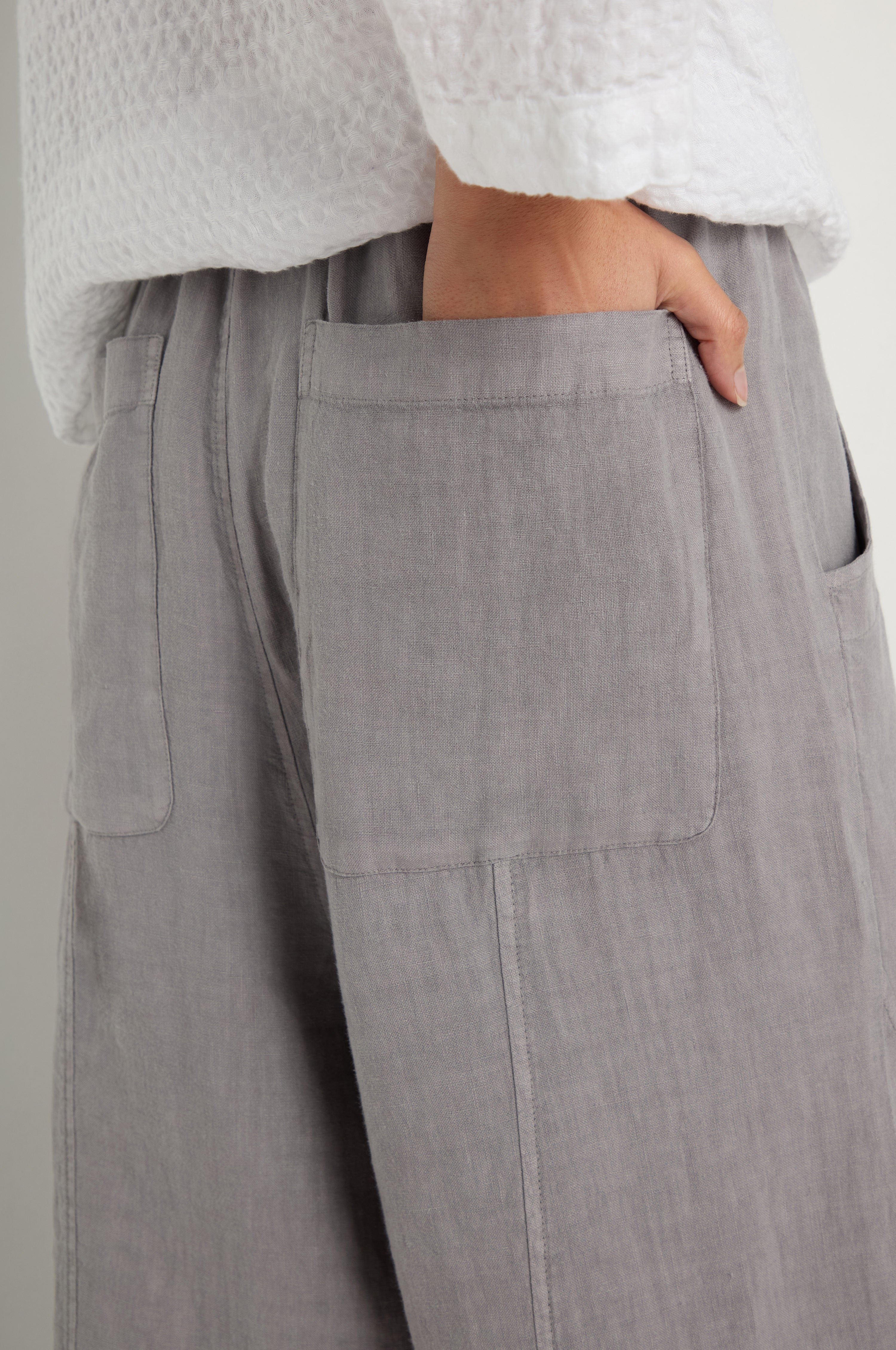 The Sahara Linen Curved Seam Bubble Trouser is cut from tactile, fine linen that softens even further with wear, shaped into a wide, cropped bubble silhouette that sits easily on the body. Curved panel seams introduce volume, while practical pocket detailing keeps the look grounded and wearable.