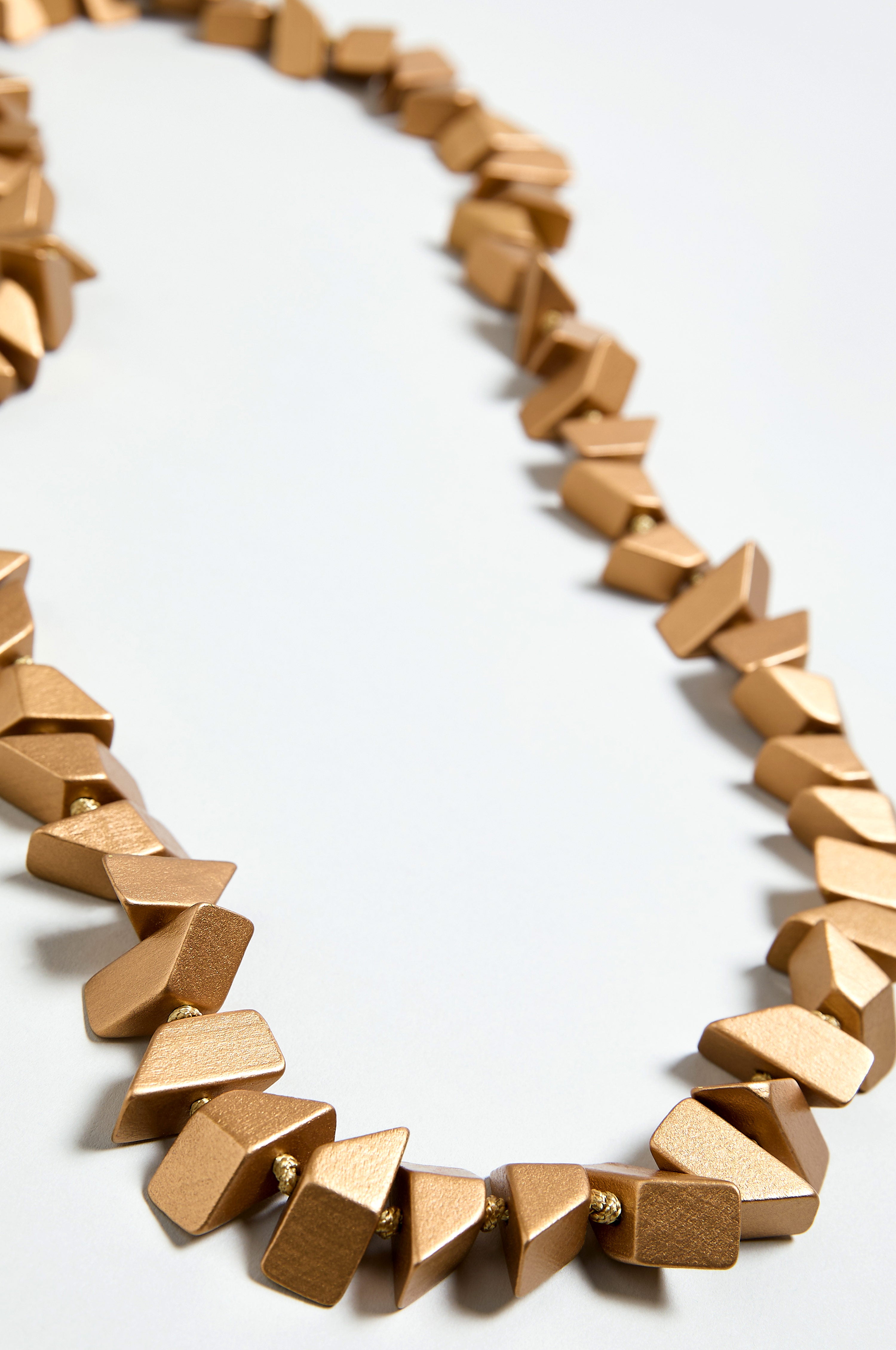 The Long Wooden Metallic Necklace brings sculptural rhythm and subtle sheen to statement accessorising. Faceted wooden beads are finished with a metallic coating, creating a softly reflective surface that plays with light while retaining the warmth and texture of natural materials. Strung along a flexible textile cord, the necklace forms a fluid, elongated silhouette that adds impact without feeling heavy or rigid.