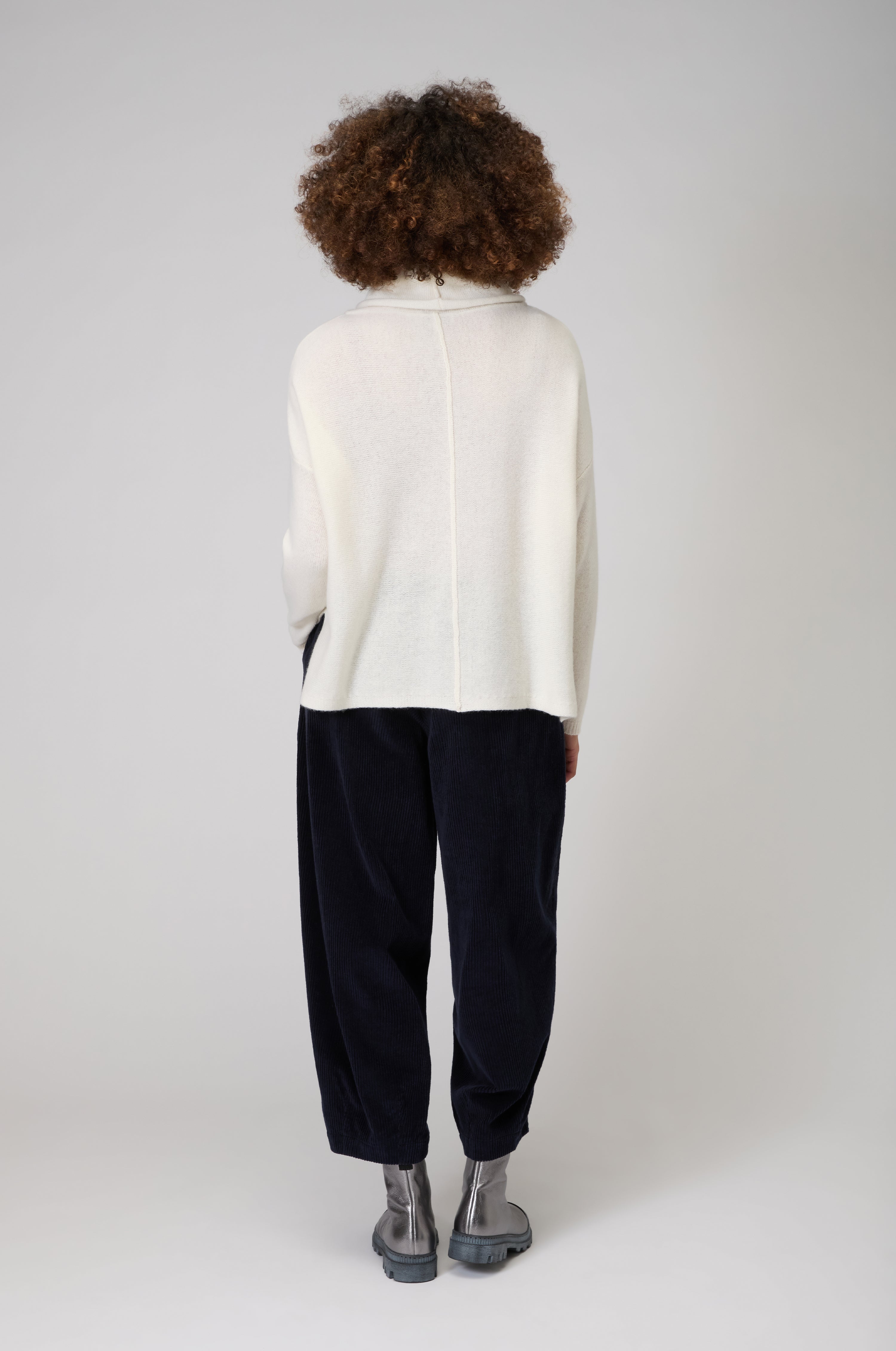 Available in classic ecru and refreshing blue, this merino wool sweater adds depth and colour to cool-weather wardrobes. Pair it with wide-leg trousers, skirts or dresses for a modern take on women’s knitwear that feels both luxurious and endlessly versatile.