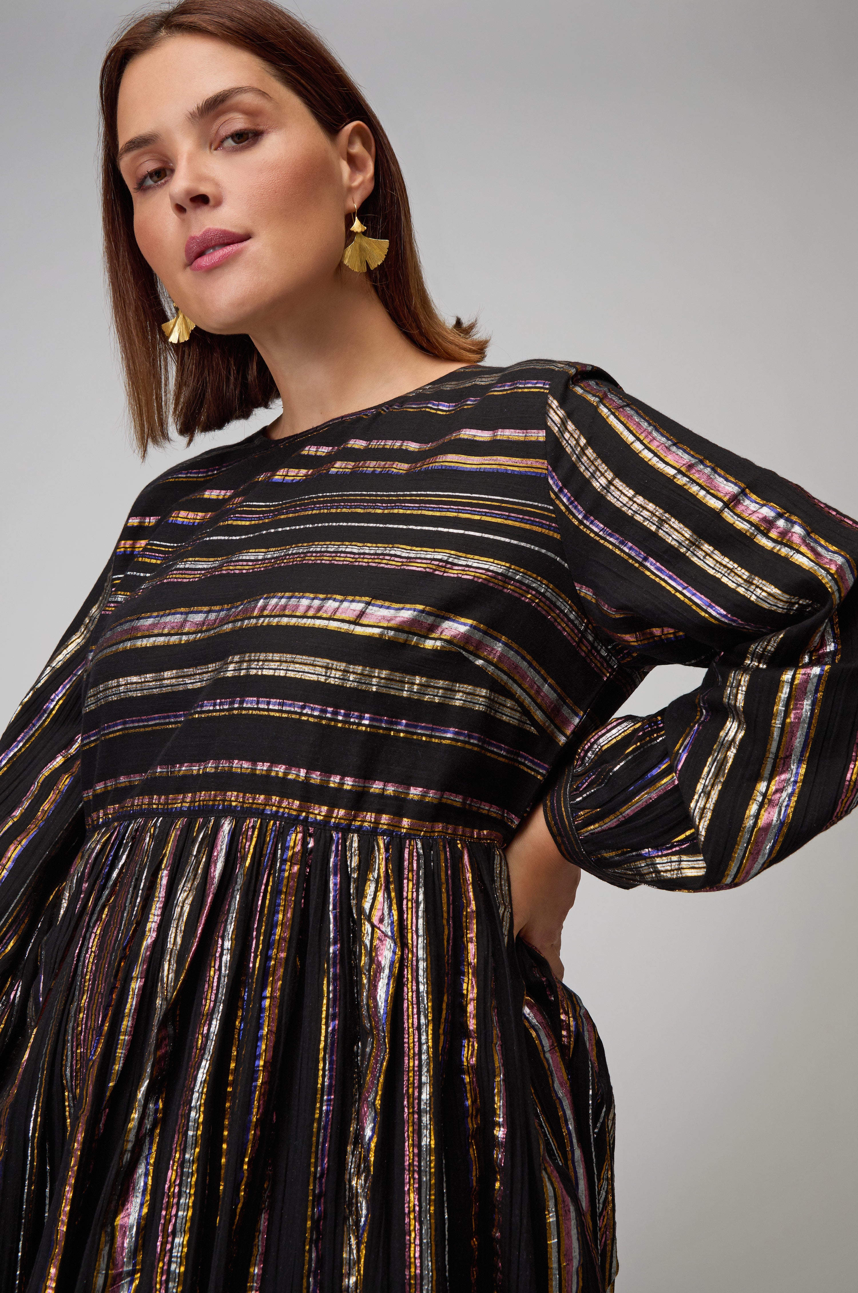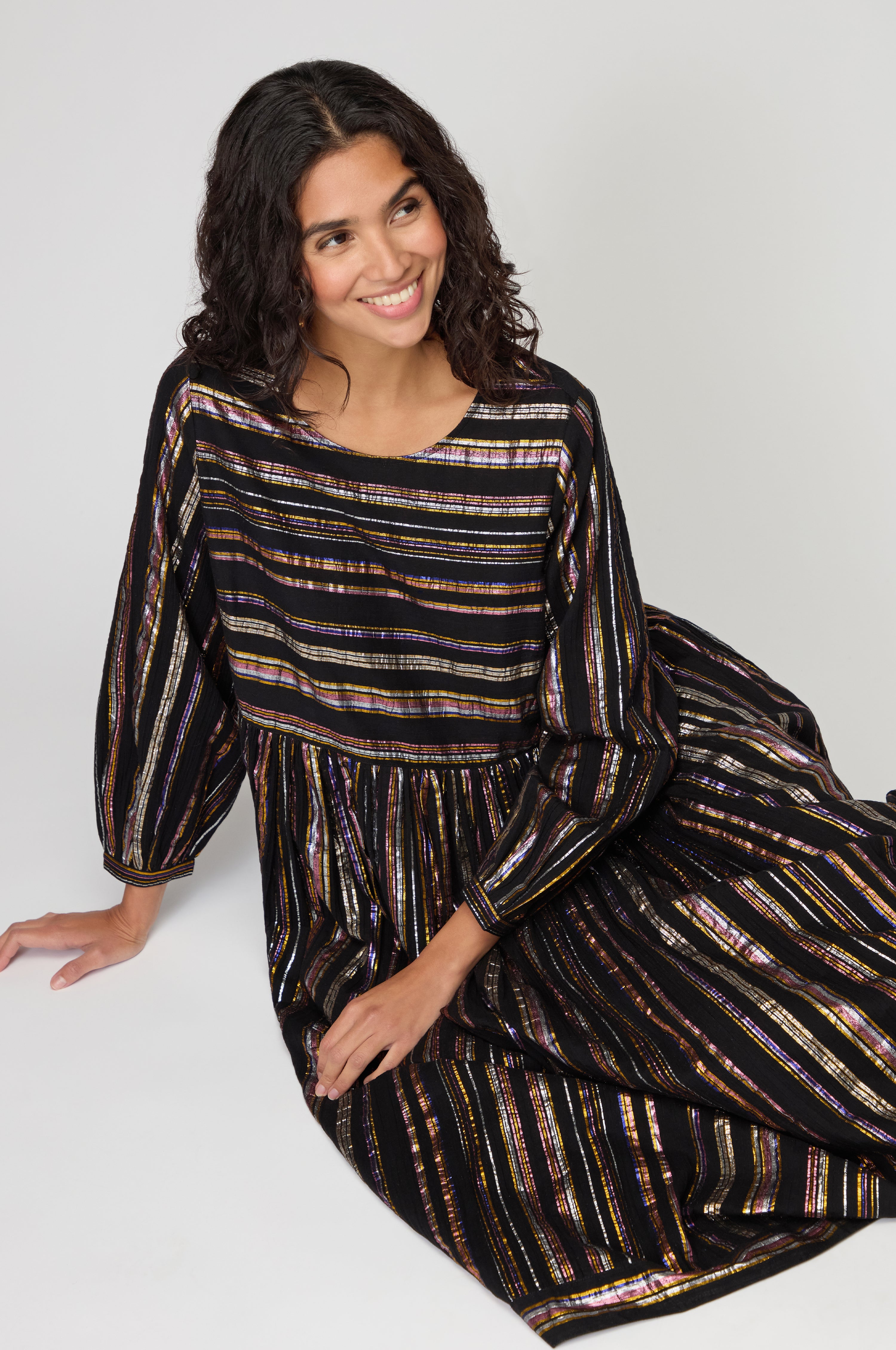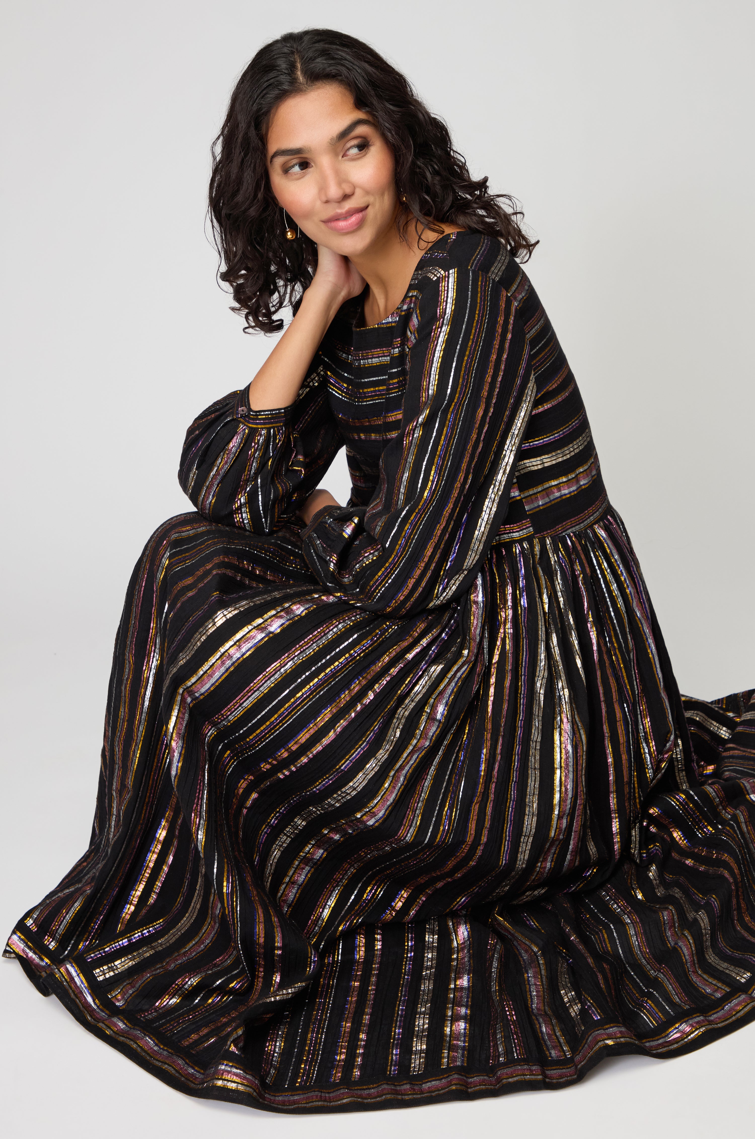 The Sahara Multi Stripe Lurex Dress features a refined cotton blend base, enhanced with multi-coloured metallic stripes that add subtle shimmer and depth. The dress is fully lined in fine cotton for comfort and quality. Its design playfully contrasts horizontal stripes on the bodice with vertical stripes on the skirt, creating a flattering and dynamic visual effect, while a horizontal band of stripes at the hem offers a polished finish.