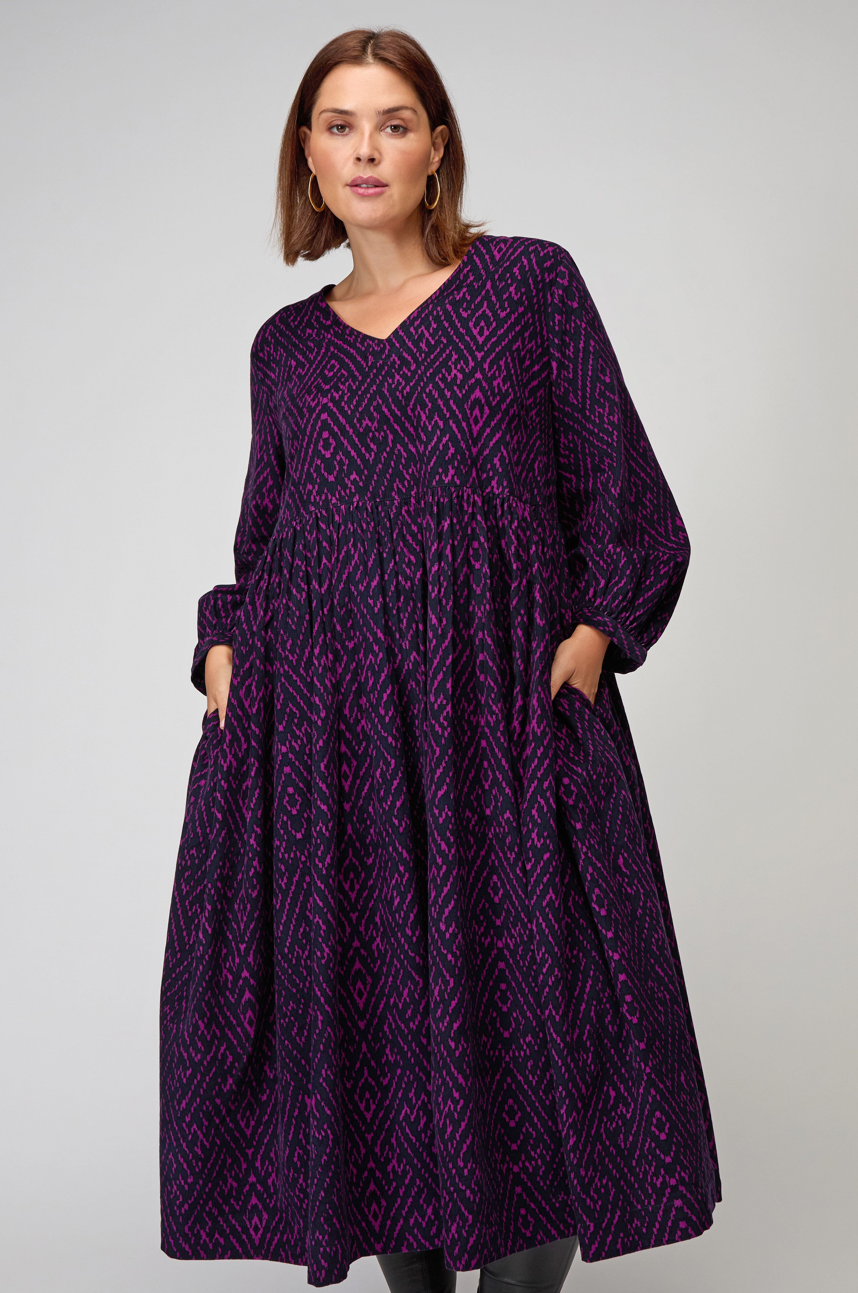 The Sahara Ornate Textured Cord Dress is defined by its richly detailed fabric, which blends night and plum tones into a surface alive with pattern and depth. The cord has a tactile quality, creating both structure and softness. Cut in a relaxed silhouette, the dress falls with ease while subtle shaping ensures a flattering fit. Side pockets add practicality without disturbing the clean lines.