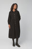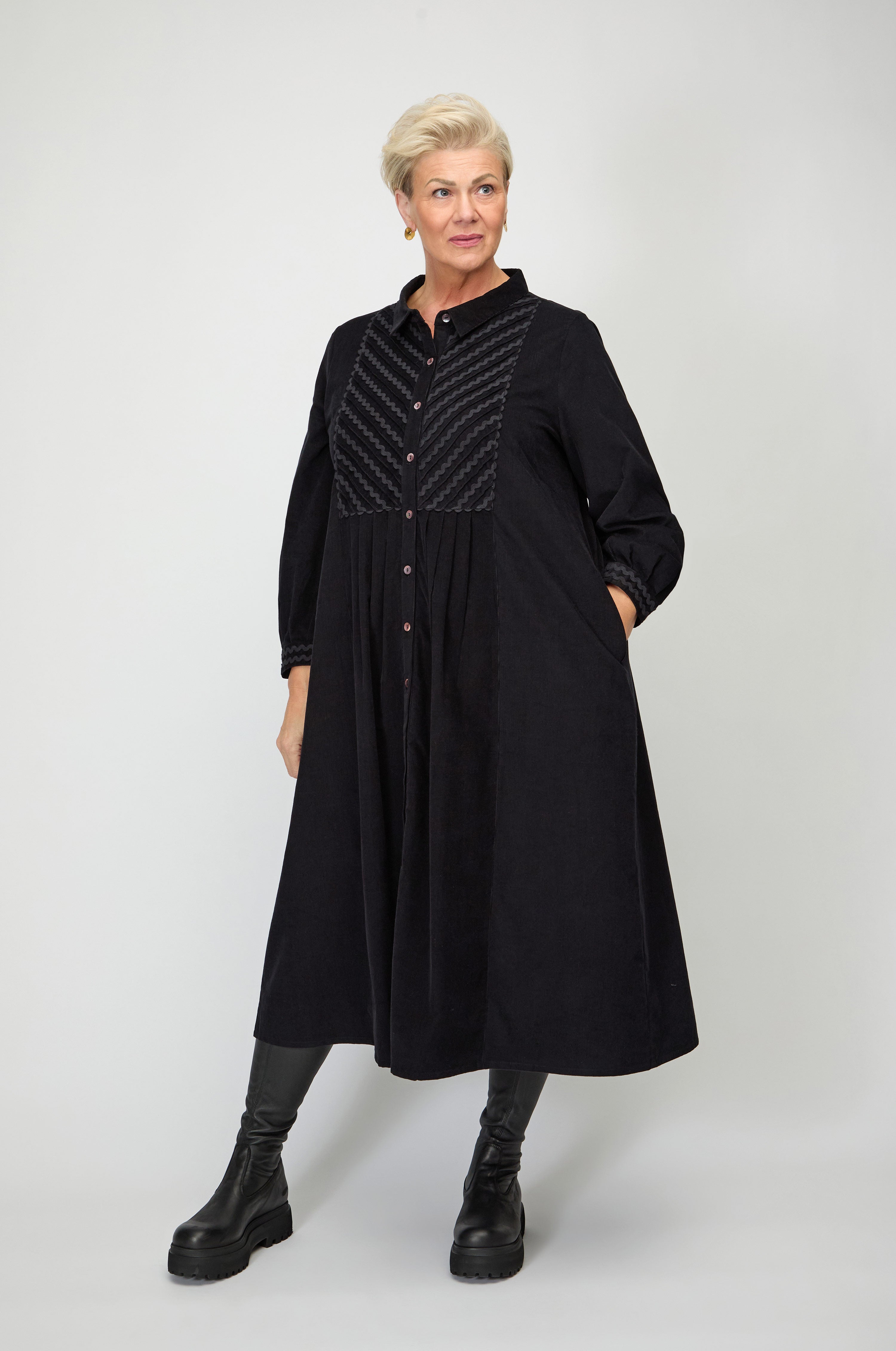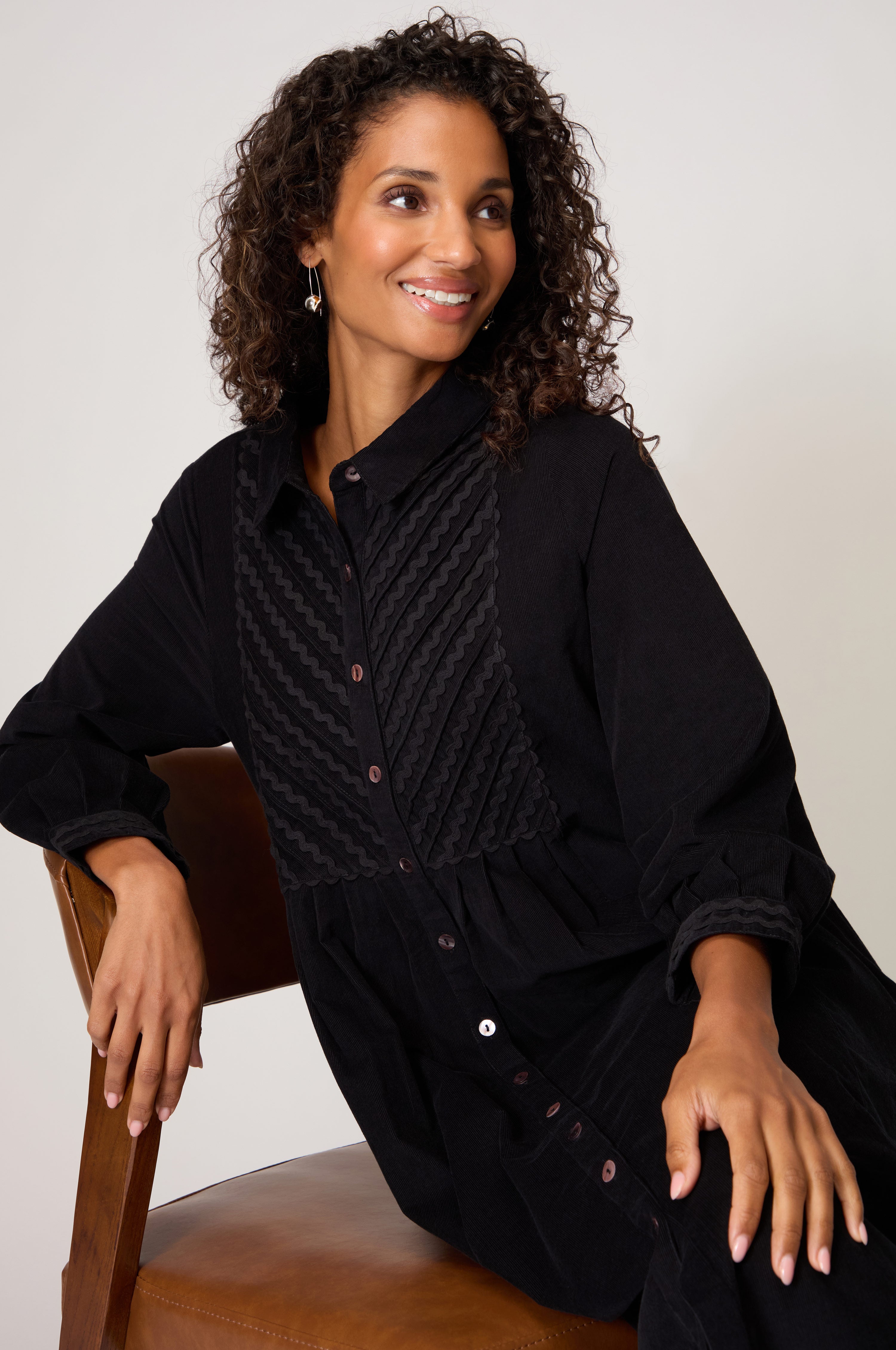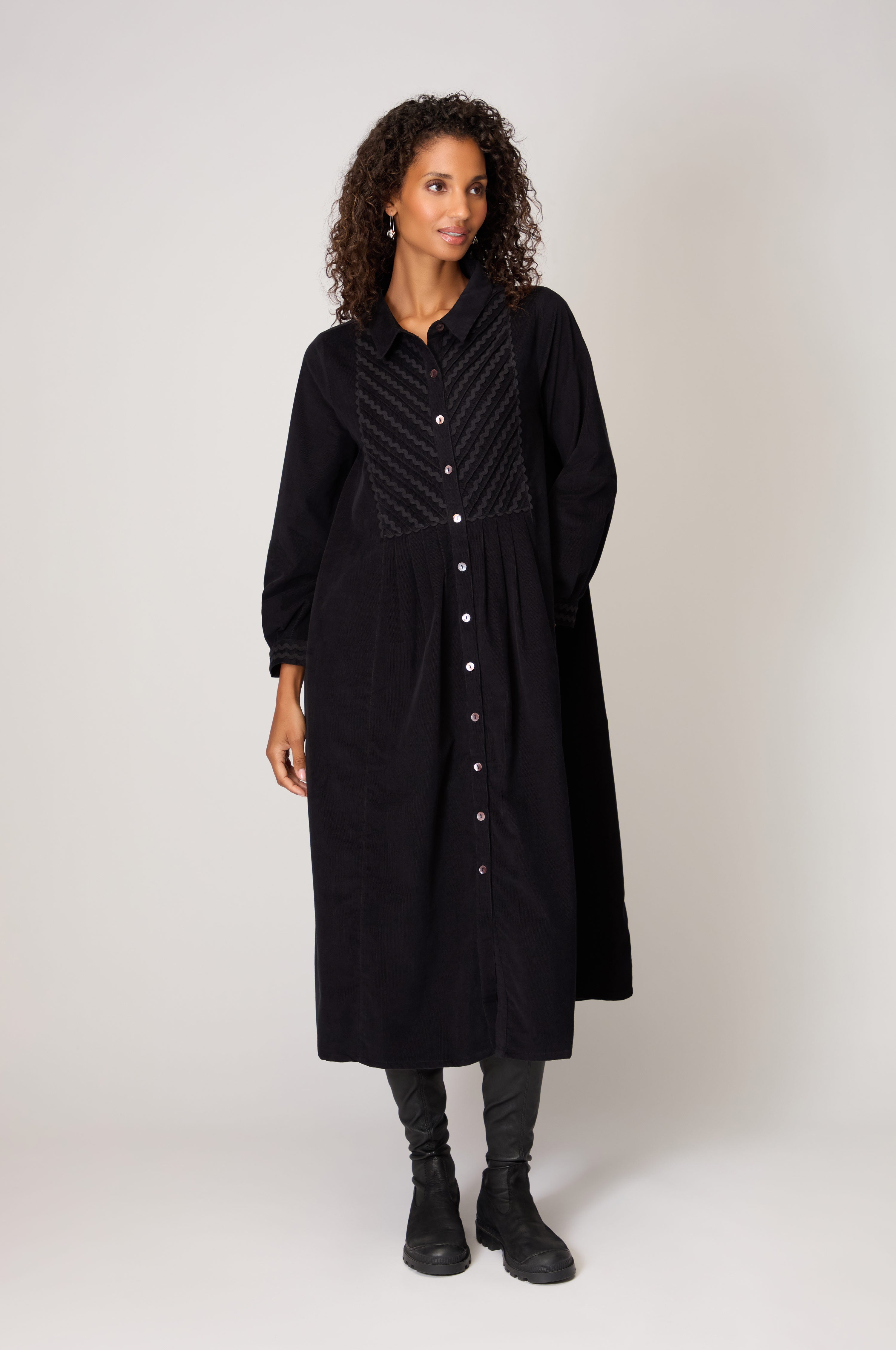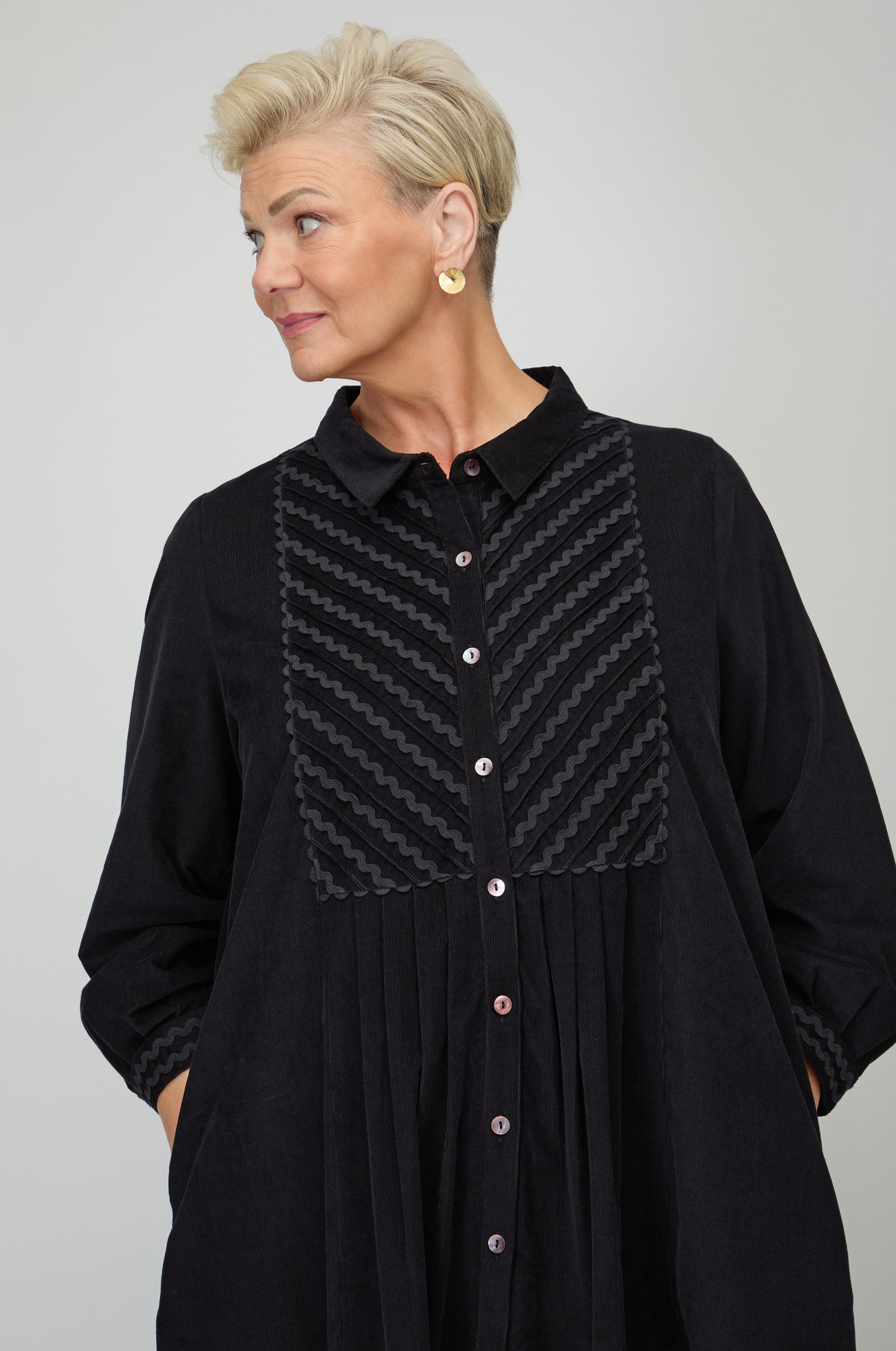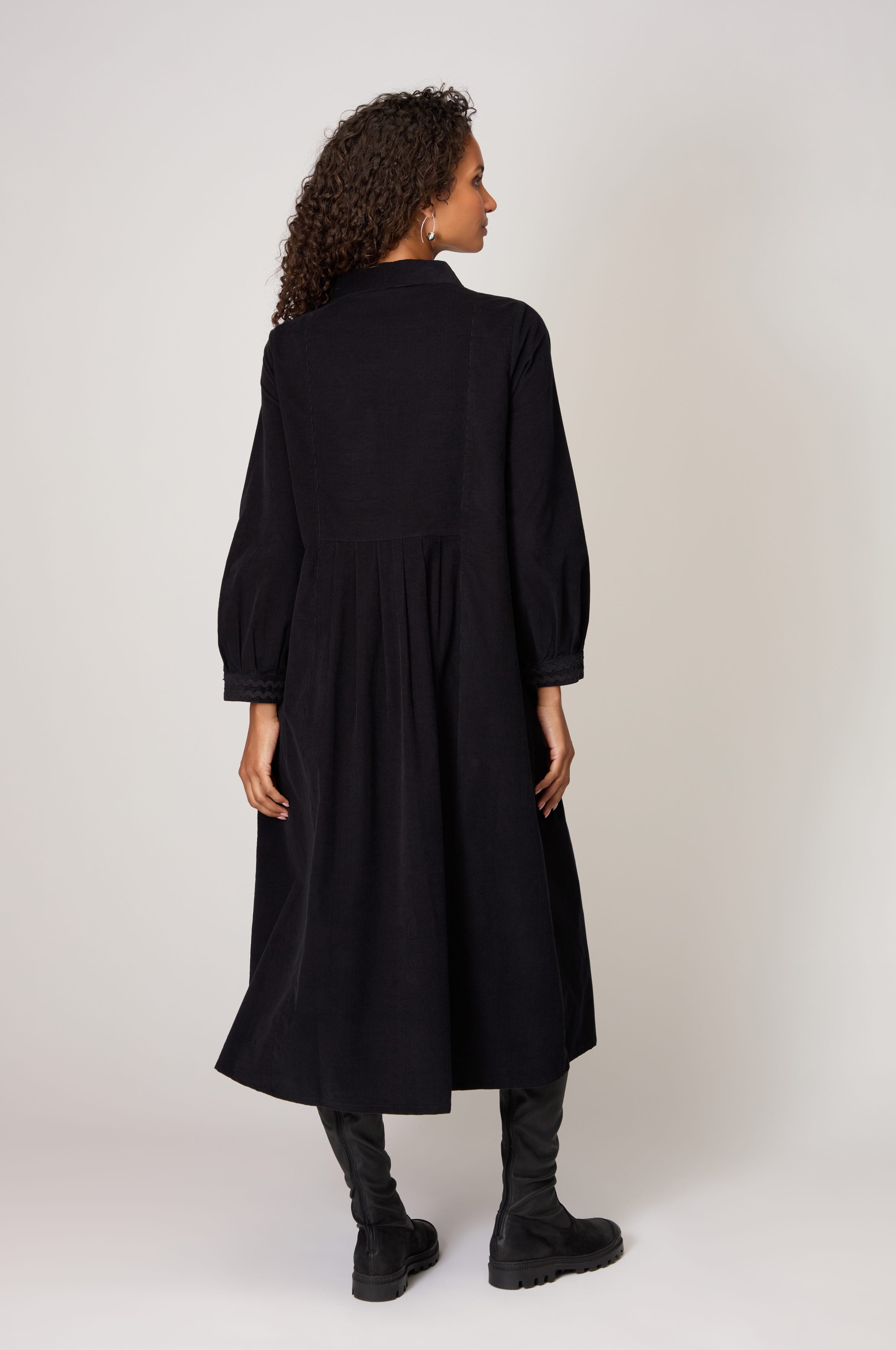 Crafted from soft cotton pincord, this A-line dress combines a classic fit with distinctive detailing. The front bib is enhanced with diagonal pleats and framed by rows of ric rac trim, while coordinating trim highlights the cuffs. Small smoke-shell buttons run along the front placket, adding a refined touch.